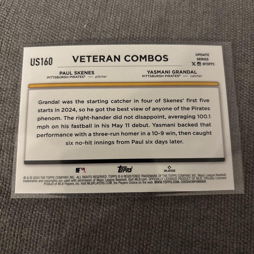 Elevate your baseball card collection with the 2024 Topps Update Series Silver Crackle Foil #US160 featuring the dynamic duo of Paul Skenes and Yasmani Grandal. As part of the esteemed Major League Baseball series, this card captures the essence of the sport with its stunning silver foil design and the promise of rising talent. Whether you're a fan of the Pittsburgh Pirates or a connoisseur of rookie cards, this piece boasts the 'Veteran Combos' appeal, making it a notable addition. With the season immortalized in high-quality print and the prestige of the Topps brand behind it, this card is a must-have for enthusiasts and collectors alike.