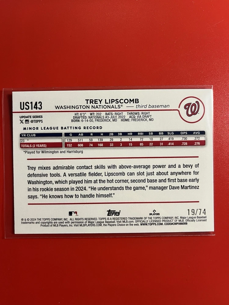 Parallel/Variety: Black Card Number: US143 Season: 2024 Card Name: Serial Numbered 71/74 Print Run: 74 Sport: Baseball Set: 2024 Topps Update Series League: Major League Baseball (MLB) Player/Athlete: Trey Lipscomb Manufacturer: Topps Features: Parallel/Variety, Rookie, Serial Numbered, Short Print Team: Washington Nationals Type: Sports Trading Card