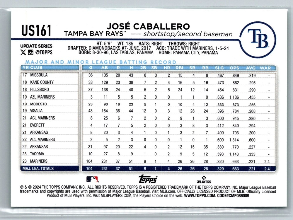 This is a nice example of a 2024 Topps Update #US161 José Caballero Aqua. Other important information about this card: In 2024 José Caballero played for the Tampa Bay Rays. Please check out our other listings for more great cards. Lot:23