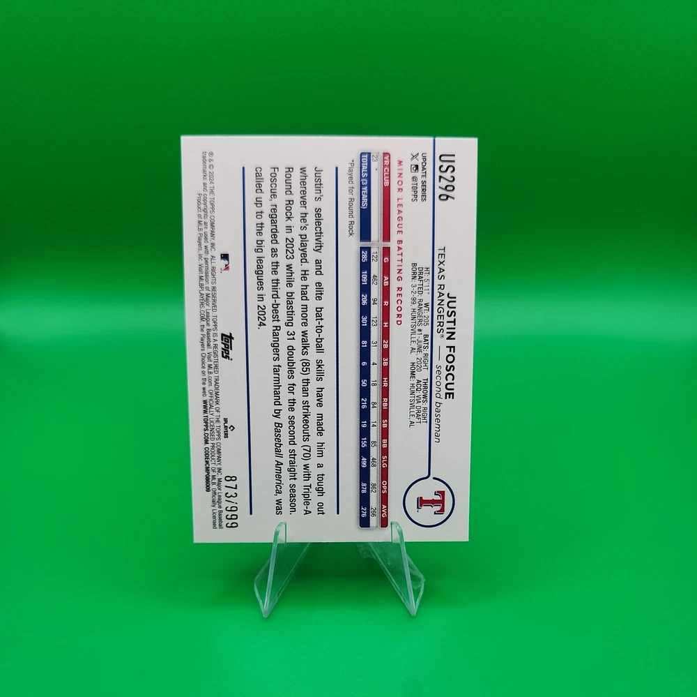 This is a rare and limited edition 2024 Topps Update baseball trading card featuring Justin Foscue of the Texas Rangers. The card is a blue holofoil parallel/variety with a print run of 999 and is ungraded. It also includes features such as autograph, one of one, and serial numbering. In addition, this card is part of the insert set and has additional attributes such as rare, blue, refractor, and shimmer specckle. It is a great addition to any baseball card collection and is sure to be a conversation starter. Don't miss out on the chance to own this unique and valuable card.