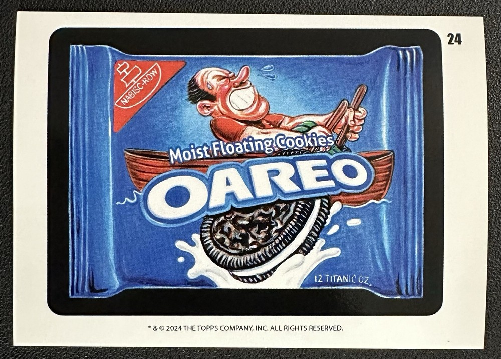 2024 Topps Wacky Packages ANS #24 OAREA cards coupon in Toploader parody card Oreo Your card will be put in an Ultra•Pro Card Sleeve, a Toploader, and then put into a Team Bag 2024 Wacky Packages All-New Series Overview Wacky Packages ALL NEW SERIES has returned for a 2024 release exclusively on Topps.com. This set features 50 brand new gags done by some of your favorite Wacky Packages artists. Look for Sketch cards, Foil Parallels, Coupons and much more - a laugh riot in every pack! 2024 Wacky Packages All-New Series Checklist 100 Sticker Base Set (50 Puzzle Backs & 50 Coupon Backs) 1 Sticker Base Crunch Bearings Puzzle - Crunch 1 Sticker Base Crunch Bearings Coupon 2 Sticker Base Quasar Oats Puzzle - Crunch 2 Sticker Base Quasar Oats Coupon 3 Sticker Base Simply Strange Puzzle - Crunch 3 Sticker Base Simply Strange Coupon 4 Sticker Base Fartnite Puzzle - Crunch 4 Sticker Base Fartnite Coupon 5 Sticker Base Perk Puzzle - Crunch 5 Sticker Base Perk Coupon 6 Sticker Base Glands Puzzle - Crunch 6 Sticker Base Glands Coupon 7 Sticker Base Larva Bar Puzzle - Crunch 7 Sticker Base Larva Bar Coupon 8 Sticker Base Ache A Lot Puzzle - Crunch 8 Sticker Base Ache A Lot Coupon 9 Sticker Base Clariton Puzzle - Crunch 9 Sticker Base Clariton Coupon 10 Sticker Base Prowrestle Puzzle - My Sickle 10 Sticker Base Prowrestle Coupon 11 Sticker Base My Sickle Puzzle - My Sickle 11 Sticker Base My Sickle Coupon 12 Sticker Base Singles Puzzle - My Sickle 12 Sticker Base Singles Coupon 13 Sticker Base Mtn Chew Puzzle - My Sickle 13 Sticker Base Mtn Chew Coupon 14 Sticker Base Moo Pie Puzzle - My Sickle 14 Sticker Base Moo Pie Coupon 15 Sticker Base Sloppecito Puzzle - My Sickle 15 Sticker Base Sloppecito Coupon 16 Sticker Base Bear Heads Puzzle - My Sickle 16 Sticker Base Bear Heads Coupon 17 Sticker Base Plucky Charms Puzzle - My Sickle 17 Sticker Base Plucky Charms Coupon 18 Sticker Base Clowny Puzzle - My Sickle 18 Sticker Base Clowny Coupon 19 Sticker Base Hive Nights Puzzle - Starbugs 19 Sticker Base Hive Nights Coupon 20 Sticker Base In Prison Puzzle - Starbugs 20 Sticker Base In Prison Coupon 21 Sticker Base Jest Puzzle - Starbugs 21 Sticker Base Jest Coupon 22 Sticker Base Jokey Puzzle - Starbugs 22 Sticker Base Jokey Coupon 23 Sticker Base Bubble Bee Puzzle - Starbugs 23 Sticker Base Bubble Bee Coupon 24 Sticker Base Oareo Puzzle - Starbugs 24 Sticker Base Oareo Coupon 25 Sticker Base Stickeys Puzzle - Starbugs 25 Sticker Base Stickeys Coupon 26 Sticker Base Noosance Puzzle - Starbugs 26 Sticker Base Noosance Coupon 27 Sticker Base Starbugs Puzzle - Starbugs 27 Sticker Base Starbugs Coupon 28 Sticker Base Muddy Babbies Puzzle - Dead's 28 Sticker Base Muddy Babbies Coupon 29 Sticker Base Sugar Caddy Puzzle - Dead's 29 Sticker Base Sugar Caddy Coupon 30 Sticker Base Hot Snails Puzzle - Dead's 30 Sticker Base Hot Snails Coupon 31 Sticker Base Suffer Puzzle - Dead's 31 Sticker Base Suffer Coupon 32 Sticker Base Spawn Puzzle - Dead's 32 Sticker Base Spawn Coupon 33 Sticker Base Tombleron Puzzle - Dead's 33 Sticker Base Tombleron Coupon 34 Sticker Base Dead's Puzzle - Dead's 34 Sticker Base Dead's Coupon 35 Sticker Base Rot Shot Puzzle - Dead's 35 Sticker Base Rot Shot Coupon 36 Sticker Base Pop Coroners Puzzle - Dead's 36 Sticker Base Pop Coroners Coupon 37 Sticker Base Play-Bro Puzzle - Kooky Crisp 37 Sticker Base Play-Bro Coupon 38 Sticker Base Ate 1 Puzzle - Kooky Crisp 38 Sticker Base Ate 1 Coupon 39 Sticker Base Bagel Frights Puzzle - Kooky Crisp 39 Sticker Base Bagel Frights Coupon 40 Sticker Base Nix Puzzle - Kooky Crisp 40 Sticker Base Nix Coupon 41 Sticker Base Bite Guard Puzzle - Kooky Crisp 41 Sticker Base Bite Guard Coupon 42 Sticker Base Hot Logs Puzzle - Kooky Crisp 42 Sticker Base Hot Logs Coupon 43 Sticker Base Kooky Crisp Puzzle - Kooky Crisp 43 Sticker Base Kooky Crisp Coupon 44 Sticker Base Ring Ding Puzzle - Kooky Crisp 44 Sticker Base Ring Ding Coupon 45 Sticker Base Spatial K Puzzle - Kooky Crisp 45 Sticker Base Spatial K Coupon 46 Sticker Base Snails Finished Puzzle 1 46 Sticker Base Snails Coupon 47 Sticker Base Pet Finished Puzzle 2 47 Sticker Base Pet Coupon 48 Sticker Base Blown Pop Finished Puzzle 3 48 Sticker Base Blown Pop Coupon 49 Sticker Base Noscafe Finished Puzzle 4 49 Sticker Base Noscafe Coupon 50 Sticker Base L.L. Scream Finished Puzzle 5 50 Sticker Base L.L. Scream Coupon 1 18C1S Base Checklist Flashback to 74 1 Sticker Insert EvilTime 2 Sticker Insert SoftHead Lightbulbs 3 Sticker Insert Big Muc 4 Sticker Insert Creature Crackers 5 Sticker Insert Burpsi Cola 6 Sticker Insert Suffertone 7 Sticker Insert Hooky 8 Sticker Insert Pupsi 9 Sticker Insert Sunsweat 10 Sticker Insert Mud Magazine Mars Attacks Wacky Packs 1 Sticker Insert Quasar Oats 2 Sticker Insert Pet 3 Sticker Insert Noosance 4 Sticker Insert Spawn 5 Sticker Insert Simply Strange Wacky Pals Comics 1 Sticker Insert SoftHead Lightbulbs 2 Sticker Insert EvilTime 3 Sticker Insert Pupsi 4 Sticker Insert Creature Crackers 5 Sticker Insert Big Muc 6 Sticker Insert Burpsi Cola 7 Sticker Insert Imbecile Blank Crows 8 Sticker Insert 3 Mosquitoes 9 Sticker Insert Monotony 10 Sticker Insert Kentucky Fried Fingers