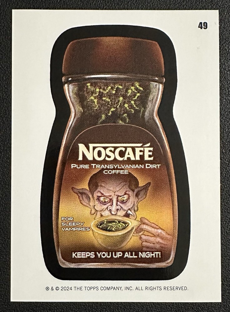 2024 Topps Wacky Packages ANS #49 NOSCAFE coupon in Toploader parody card of Nescafe Your card will be put in an Ultra•Pro Card Sleeve, a Toploader, and then put into a Team Bag 2024 Wacky Packages All-New Series Overview Wacky Packages ALL NEW SERIES has returned for a 2024 release exclusively on Topps.com. This set features 50 brand new gags done by some of your favorite Wacky Packages artists. Look for Sketch cards, Foil Parallels, Coupons and much more - a laugh riot in every pack! 2024 Wacky Packages All-New Series Checklist 100 Sticker Base Set (50 Puzzle Backs & 50 Coupon Backs) 1 Sticker Base Crunch Bearings Puzzle - Crunch 1 Sticker Base Crunch Bearings Coupon 2 Sticker Base Quasar Oats Puzzle - Crunch 2 Sticker Base Quasar Oats Coupon 3 Sticker Base Simply Strange Puzzle - Crunch 3 Sticker Base Simply Strange Coupon 4 Sticker Base Fartnite Puzzle - Crunch 4 Sticker Base Fartnite Coupon 5 Sticker Base Perk Puzzle - Crunch 5 Sticker Base Perk Coupon 6 Sticker Base Glands Puzzle - Crunch 6 Sticker Base Glands Coupon 7 Sticker Base Larva Bar Puzzle - Crunch 7 Sticker Base Larva Bar Coupon 8 Sticker Base Ache A Lot Puzzle - Crunch 8 Sticker Base Ache A Lot Coupon 9 Sticker Base Clariton Puzzle - Crunch 9 Sticker Base Clariton Coupon 10 Sticker Base Prowrestle Puzzle - My Sickle 10 Sticker Base Prowrestle Coupon 11 Sticker Base My Sickle Puzzle - My Sickle 11 Sticker Base My Sickle Coupon 12 Sticker Base Singles Puzzle - My Sickle 12 Sticker Base Singles Coupon 13 Sticker Base Mtn Chew Puzzle - My Sickle 13 Sticker Base Mtn Chew Coupon 14 Sticker Base Moo Pie Puzzle - My Sickle 14 Sticker Base Moo Pie Coupon 15 Sticker Base Sloppecito Puzzle - My Sickle 15 Sticker Base Sloppecito Coupon 16 Sticker Base Bear Heads Puzzle - My Sickle 16 Sticker Base Bear Heads Coupon 17 Sticker Base Plucky Charms Puzzle - My Sickle 17 Sticker Base Plucky Charms Coupon 18 Sticker Base Clowny Puzzle - My Sickle 18 Sticker Base Clowny Coupon 19 Sticker Base Hive Nights Puzzle - Starbugs 19 Sticker Base Hive Nights Coupon 20 Sticker Base In Prison Puzzle - Starbugs 20 Sticker Base In Prison Coupon 21 Sticker Base Jest Puzzle - Starbugs 21 Sticker Base Jest Coupon 22 Sticker Base Jokey Puzzle - Starbugs 22 Sticker Base Jokey Coupon 23 Sticker Base Bubble Bee Puzzle - Starbugs 23 Sticker Base Bubble Bee Coupon 24 Sticker Base Oareo Puzzle - Starbugs 24 Sticker Base Oareo Coupon 25 Sticker Base Stickeys Puzzle - Starbugs 25 Sticker Base Stickeys Coupon 26 Sticker Base Noosance Puzzle - Starbugs 26 Sticker Base Noosance Coupon 27 Sticker Base Starbugs Puzzle - Starbugs 27 Sticker Base Starbugs Coupon 28 Sticker Base Muddy Babbies Puzzle - Dead's 28 Sticker Base Muddy Babbies Coupon 29 Sticker Base Sugar Caddy Puzzle - Dead's 29 Sticker Base Sugar Caddy Coupon 30 Sticker Base Hot Snails Puzzle - Dead's 30 Sticker Base Hot Snails Coupon 31 Sticker Base Suffer Puzzle - Dead's 31 Sticker Base Suffer Coupon 32 Sticker Base Spawn Puzzle - Dead's 32 Sticker Base Spawn Coupon 33 Sticker Base Tombleron Puzzle - Dead's 33 Sticker Base Tombleron Coupon 34 Sticker Base Dead's Puzzle - Dead's 34 Sticker Base Dead's Coupon 35 Sticker Base Rot Shot Puzzle - Dead's 35 Sticker Base Rot Shot Coupon 36 Sticker Base Pop Coroners Puzzle - Dead's 36 Sticker Base Pop Coroners Coupon 37 Sticker Base Play-Bro Puzzle - Kooky Crisp 37 Sticker Base Play-Bro Coupon 38 Sticker Base Ate 1 Puzzle - Kooky Crisp 38 Sticker Base Ate 1 Coupon 39 Sticker Base Bagel Frights Puzzle - Kooky Crisp 39 Sticker Base Bagel Frights Coupon 40 Sticker Base Nix Puzzle - Kooky Crisp 40 Sticker Base Nix Coupon 41 Sticker Base Bite Guard Puzzle - Kooky Crisp 41 Sticker Base Bite Guard Coupon 42 Sticker Base Hot Logs Puzzle - Kooky Crisp 42 Sticker Base Hot Logs Coupon 43 Sticker Base Kooky Crisp Puzzle - Kooky Crisp 43 Sticker Base Kooky Crisp Coupon 44 Sticker Base Ring Ding Puzzle - Kooky Crisp 44 Sticker Base Ring Ding Coupon 45 Sticker Base Spatial K Puzzle - Kooky Crisp 45 Sticker Base Spatial K Coupon 46 Sticker Base Snails Finished Puzzle 1 46 Sticker Base Snails Coupon 47 Sticker Base Pet Finished Puzzle 2 47 Sticker Base Pet Coupon 48 Sticker Base Blown Pop Finished Puzzle 3 48 Sticker Base Blown Pop Coupon 49 Sticker Base Noscafe Finished Puzzle 4 49 Sticker Base Noscafe Coupon 50 Sticker Base L.L. Scream Finished Puzzle 5 50 Sticker Base L.L. Scream Coupon 1 18C1S Base Checklist Flashback to 74 1 Sticker Insert EvilTime 2 Sticker Insert SoftHead Lightbulbs 3 Sticker Insert Big Muc 4 Sticker Insert Creature Crackers 5 Sticker Insert Burpsi Cola 6 Sticker Insert Suffertone 7 Sticker Insert Hooky 8 Sticker Insert Pupsi 9 Sticker Insert Sunsweat 10 Sticker Insert Mud Magazine Mars Attacks Wacky Packs 1 Sticker Insert Quasar Oats 2 Sticker Insert Pet 3 Sticker Insert Noosance 4 Sticker Insert Spawn 5 Sticker Insert Simply Strange Wacky Pals Comics 1 Sticker Insert SoftHead Lightbulbs 2 Sticker Insert EvilTime 3 Sticker Insert Pupsi 4 Sticker Insert Creature Crackers 5 Sticker Insert Big Muc 6 Sticker Insert Burpsi Cola 7 Sticker Insert Imbecile Blank Crows 8 Sticker Insert 3 Mosquitoes 9 Sticker Insert Monotony 10 Sticker Insert Kentucky Fried Fingers