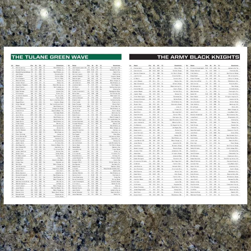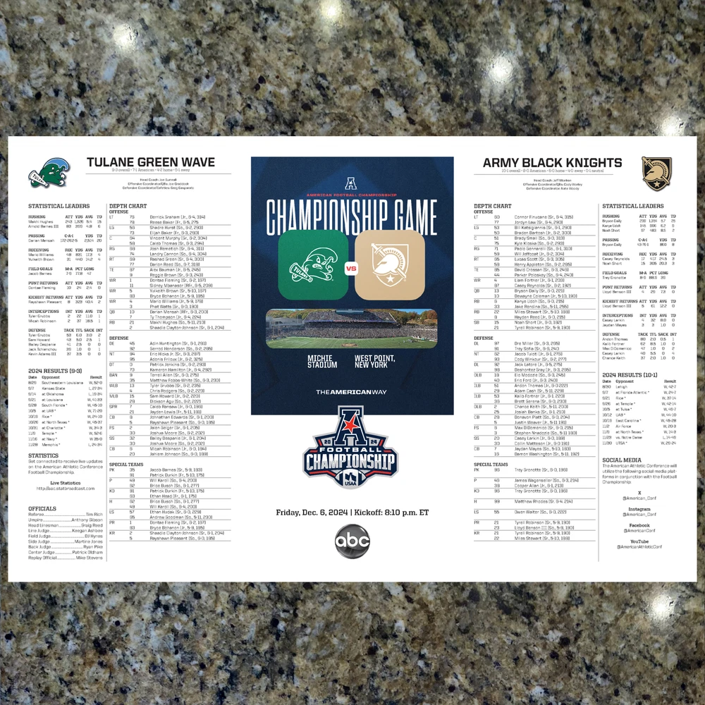 For sale, the game issued Flipcard and team program notes from the 2024 AAC Confrence Championship game - Tulane vs Army at Michie Stadium . Only given to media and broadcast for the game. History! GAME: 2024 AAC FOOTBALL CHAMPIONSHIP GAME Tulane (9-3) at Army (10-1) Friday, December 6, 2024 Michie Stadium | West Point, New York What you get: 1. 11x17 Game Issued Media Issued Flipcard - Tulane vs Army 2. Army game program note sheet (1 page) 3. Tulane game program note sheet (1 page) 4. Plastic protector sheet