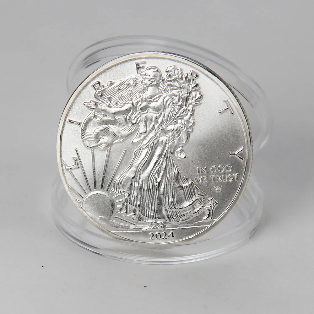 Free eBay listing template designed by dewiso.com 2024 The United States Statue of Liberty Coin Eagle Coin Silver Plated Coin 1oz Uncirculated Commemorative Coin About this item: ❤1.High quality materials and craftsmanship: Made of high quality iron alloy material, high strength, wear-resistant, anti-rust, durable. a sliver-plated process, making its appearance bright and gorgeous. 1.57 inches(40mm) diameter 0.12 inches(3mm) thick, moderate in size, convenient for carrying and display. ❤2.Transparent plastic case: The commemorative coin comes with a transparent plastic case designed to protect the coin from oxidation, scratches, and other external damages. The case is completely transparent, allowing for a clear display of the coin's obverse and reverse sides. ❤3.The obverse design typically features the head of the Statue of Liberty wearing a crown, holding a branch of olive and a bundle of arrows, with the background of a rising sun. ❤4.The reverse design usually depicts a soaring eagle with outstretched wings clutching a bundle of arrows, symbolizing strength and freedom. ❤5.Use this coin as an art collectible, business gift, home decor, or thoughtful gift. The coin size is just right and suitable for display or pocket storage. Product Description: The Statue of Liberty and the soaring eagle symbolize our reverence for freedom, with our motto being "In God We Trust." The coin is sized just right for display or carrying in a pocket. Note: This challenge coin has no monetary value Worry Coin Meditation Contact us We can be contacted at any time through eBay messages if you have any questions, comments or product requests. We will respond to you within 24 hours and do our best to help you out! We encourage our customers to contact us with any questions or concerns! We'd like to be sure you are completely satisfied with your purchase Thanks fot shopping with us !!