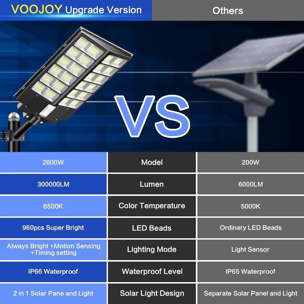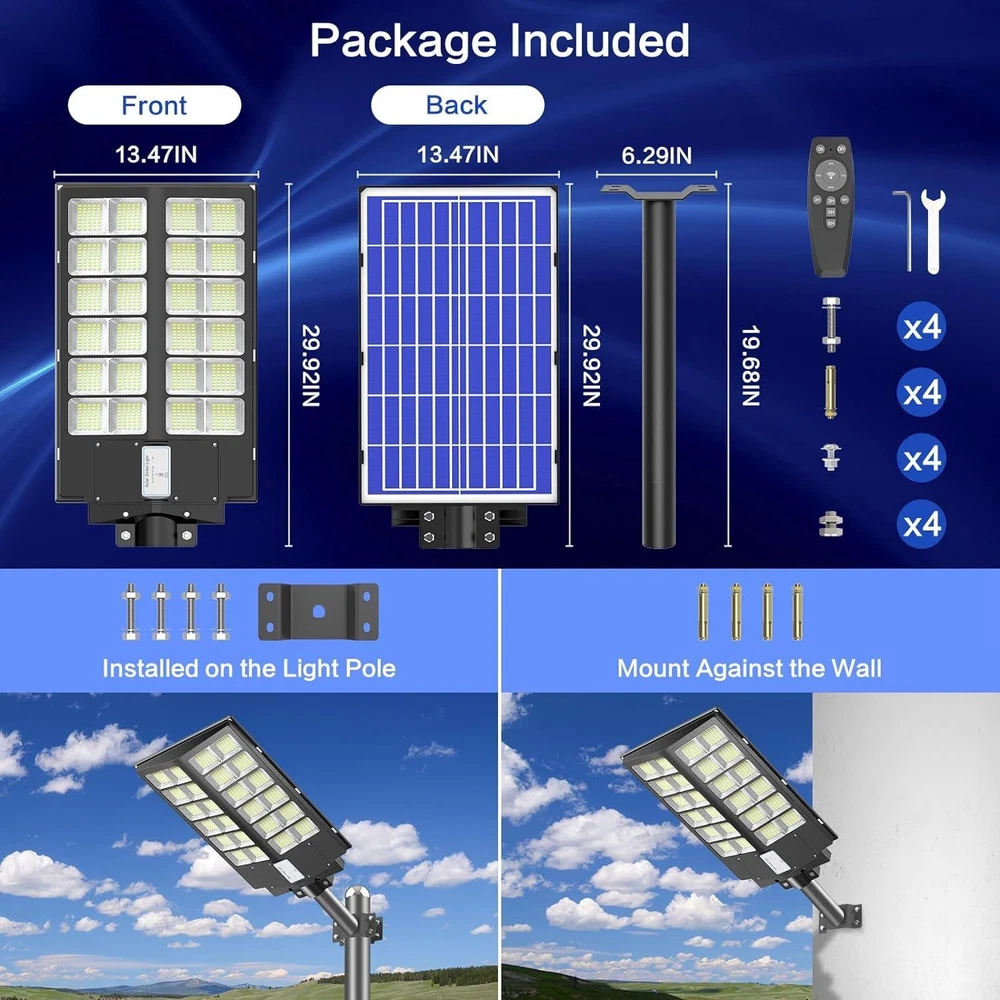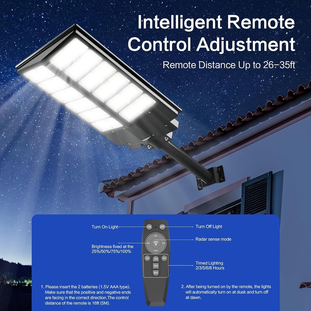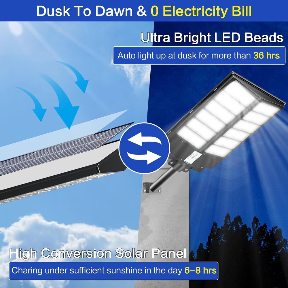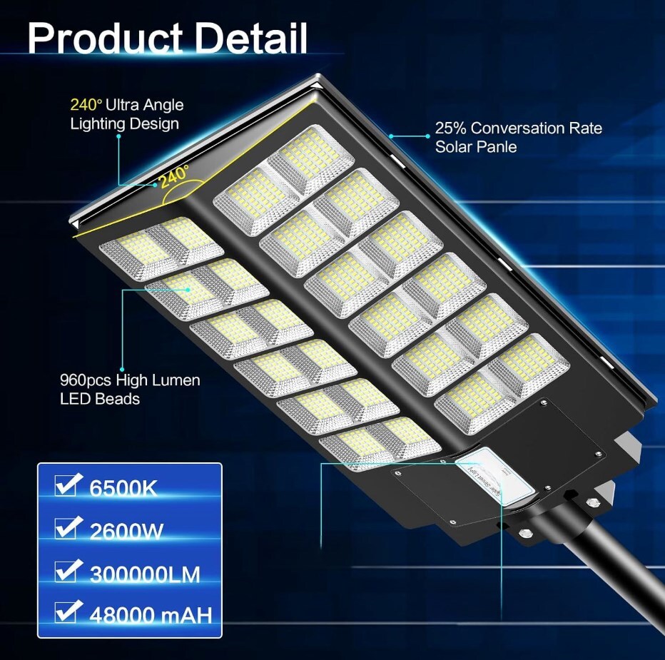 You may also like 1 Pair Black+Red Solar Panel Extension Cable Wire Solar Connectors 10 AWG Gauge 6.99 USD Free shipping Commercial Solar Street Lights Outdoor Dusk to Dawn Solar High Bright Aluminum 85.99 USD Free shipping New Commercial Solar Street Lights Outdoor Dusk to Dawn Solar Security Light US 85.9 USD Free shipping 9900000000LM 1000W Commercial LED Solar Street Light Dusk to Dawn Road Lamp+Pole 74.94 USD Free shipping 30A Solar Panel Battery Charge Controller 12V/24V LCD Regulator Auto Dual USB US 11.87 USD Free shipping 30A/60A MPPT Solar Panel Regulator Charge Controller Auto 12V/24V Dual USB 12.34 USD Free shipping Package include: 1pc street light 【Super Bright Solar Street Light】2600W solar street light uses high efficiency 960 pcs 5730 high bright long lifespan SMD lamp beads, 300000 Lumens are extremely bright and have low light decay. With a 240 degree wide-angle lighting design, which can provide lighting range up to 3800 square feet and brighter compared with ordinary street lights. 【NO Electricity Bill】This solar parking street light provides 6500K daylight white light and is equipped with 800 PCS super bright LED beads and a 3.2v-48000mAh battery (with a life of up to 50,000 hours). The IP66 waterproof commecial grade makes it work well even in bad weather all year round. It is solar powered street light, produces no electricity bill, automatically turns on at dusk and turns off during the day, and can provide continuous lighting for up to 30 hours (when fully charged). 【3 CONTROL MODES】1. Motion Sensor: keeps 30% power lighting until motion is detected, automatically adjusts to 100% power lighting, and then returns to 30% power brightness after the person leaves for 20 seconds; 2. Timed Lighting: Timed 100% power brightness Lighting for 2/3/5/6/8 hours; 3. Always Lighting: Always 100% power brightness lighting (in this mode, you can adjust the brightness of the street lights to 25%-100% brightness). 【Easy to Install, No Wiring】The package contains 2 kinds of mounting screws and accessories, as well as solar light arm poles. The LED street lights are easy to install, with screw fixing and dependable operation without the need for wiring or trench. You can install solar lights on walls, trees, light poles, etc., wherever you want to install them (support street light post diameter: 1.5 to 4 inches, suggest height 18-25ft). 【Reliable After-Sales Service】offers 24 months of after-sales service, ensuring a good purchasing experience for our customers. If you have any questions regarding our solar street lights outdoor, please don't hesitate to reach out to our customer service team. 200000LM Solar street light, 0 electricity bill, Remote control, Light sensing function, Motion sensor 1. solar street light provides super brighter daylight at full night, no electricity distribution, fast charging, energy saving. 2. IP65 waterproof, Can deal with -5°C-70°C temperature and bad weather in daily life. 3. Easy to installation for wall and lamp post, the package contains 2 kinds of mounting screws and accessories, as well as solar light arm poles, applicable lamp post diameter: 1.5~4 inches. 4. Light control + multi-function remote control, turn off and charging during the day, working lighting from down to dawn. 5. The remote control has a memory function, it can turn on and off light, be timed lighting, and adjust motion sensor mode. 6. Continuous working time: More than 12 hours in constant light mode, 20-24 hours in motion sensor mode. 7. 60000mAH large capacity battery, long battery life, can work continuously for 50000+ hours, more than 5 years. 8. Two ways to turn on the light: Button Control + Remote Control. Solar street lights automatically turn off the lights during the day to charge, and turn on the lights at night for work lighting; IP65 Waterproof, can work in all bad weather IP65 Waterproof, can work in all bad weather Make Sure The Solar Light Has Been Fully Charged and The Remote Control Has Battery Already: 2*AAA (Included) ON: Turn ON the light and Always lighting; OFF: Turn OFF the solar light; 25%-100%:Always Lighting 25%-100% brightness; 2H/3H/5H/6H/8H:Timed Light Up Lighting 2/3/5/6/8 hours; 'Radar': Motion sensor mode (When no one is there, 0% brightness lighting of solar lights; 100% brightness lighting when someone passes by; 30% brightness lighting after people leave for 20 seconds); Note:In Always/Timed Lighting mode, if the light is not adjusted for a long time, the brightness of the light will decrease some brightness every 3 hours in order to prolong the lighting time. Q: Can it work on cloudy days? A: Yes, it can work in all environments, but it needs sunlight when charging, otherwise it cannot be fully charged; Q: Why are the lights turned on at night? A: When the solar panel is in the dark (the solar panel cannot detect the light), at this time the green indicator light will be off, and the light can be turned on by the remote control and the button on the lamp; Q: How long can it work on a full charge? A: Always lighting mode can work for more than 12 hours; Motion sensor mode can work for more than 20 hours;