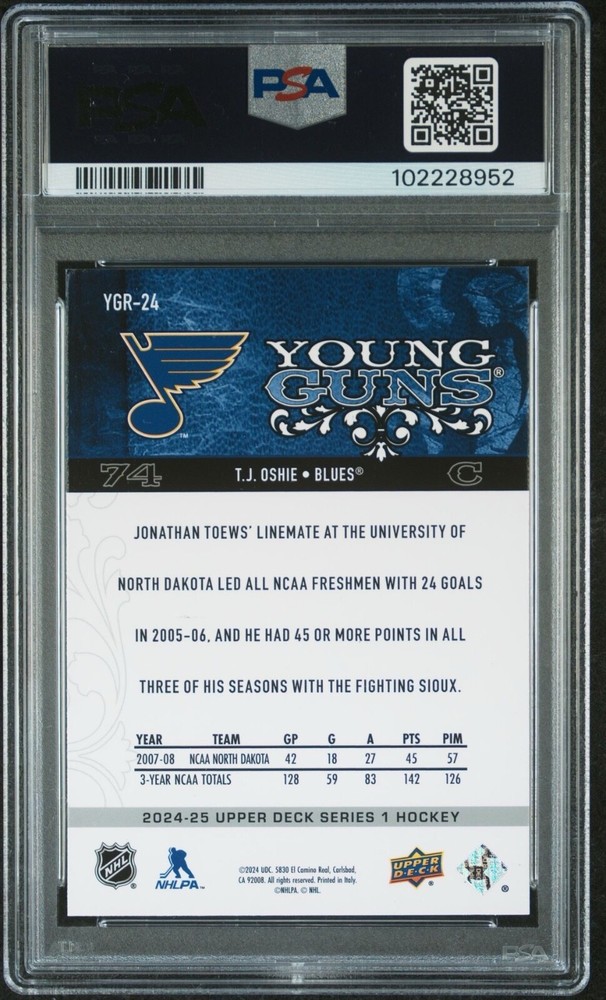 The product is a 2024 Upper Deck trading card featuring T.J. Oshie, part of the Young Guns Renewed series. It is graded as a PSA 9 Mint and includes the teams Washington Capitals and St. Louis Blues. The card number is YGR24 and it is manufactured by Upper Deck.
