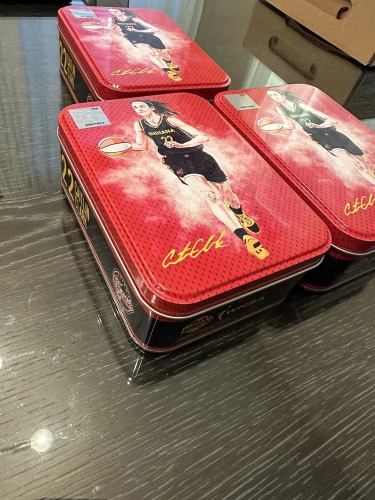 The product is a set of three empty red aluminum tins featuring the player Caitlin Clark from the Indiana Fever in the 2023-24 WNBA season. These tins are part of the 2023-24 WNBA SELECT series manufactured by Panini in 2024. The tins are designed as collectibles for sports trading cards, specifically for basketball, and may have been originally used to house exclusive player trading cards. This limited edition product would appeal to fans and collectors of the Women's National Basketball Association (WNBA) and Caitlin Clark.