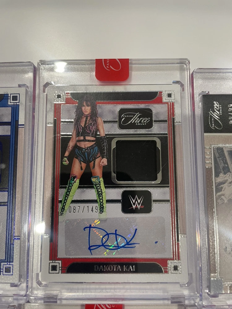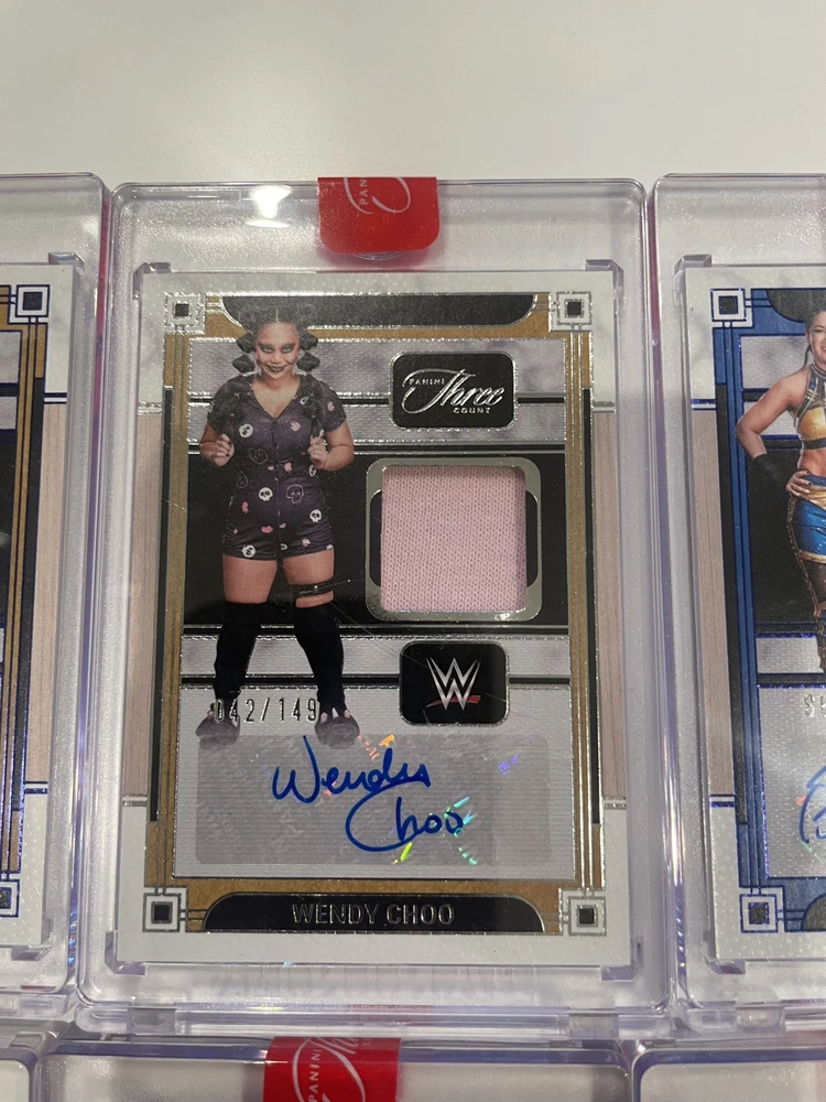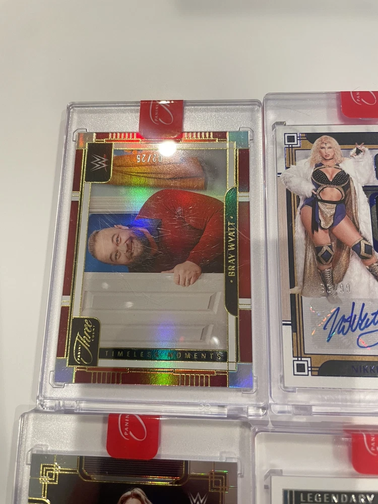 The product is a lot of 12 WWE Three Count trading cards from the 2024 Panini Three Count collection. These cards feature WWE wrestlers and are designed for sports trading card enthusiasts.