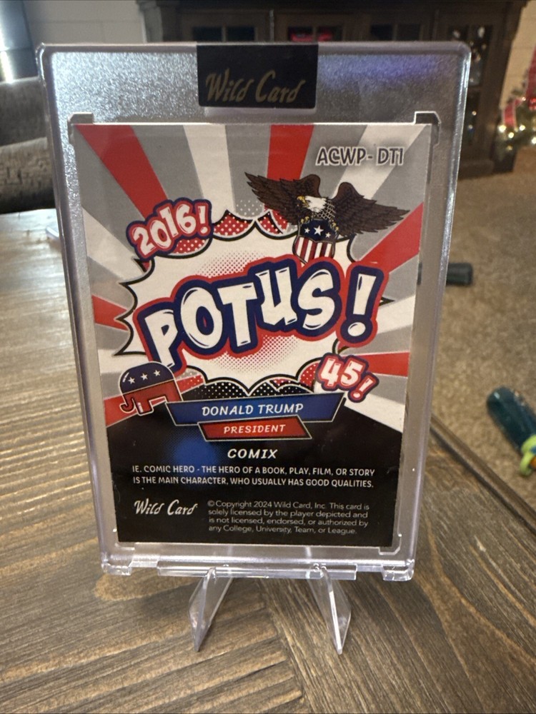 Character: Donald Trump Set: Comix Manufacturer: Wild Card Franchise: US Presidents Parallel/Variety: Blood Type: Non-Sport Trading Card Featured Person/Artist: Donald Trump Features: Chase, Exclusive, Limited Edition, Serial Numbered, Short Print Year Manufactured: 2024