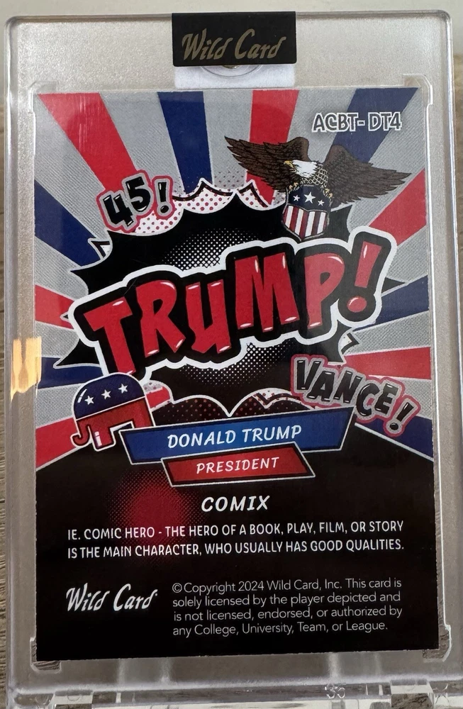 The 2024 Wild Card Alumination Comix Donald Trump trading card features Donald Trump with a MAGA hat. This card is part of a special set with a limited print run of 7, with this particular card being numbered 4/7 PRESIDENCY MATCH (47th president). It includes unique features like being serial numbered and Presidency Match, making it a rare and collectible item for fans of US Presidents.
