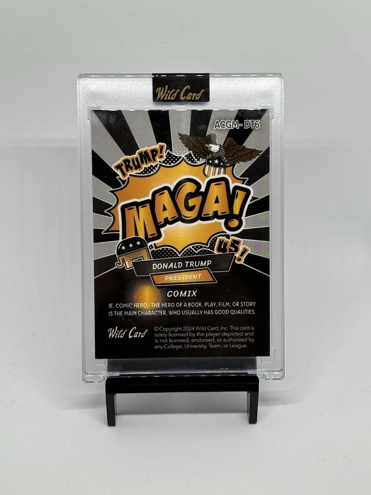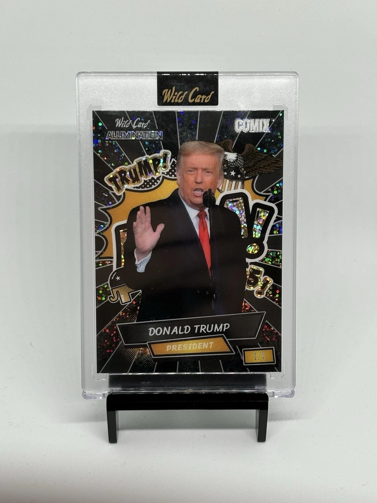 This unique and rare 2024 Wild Card Alumination President Donald J Trump Comix BLACK MAGA trading card is a must-have for any serious collector. This one-of-a-kind card features a limited edition print run of 1/1 and is serial numbered for added authenticity. The card is part of the US Presidents franchise and is a non-sport trading card with a black parallel/variety. It was manufactured by Wild Card and is a collectors edition with features such as an insert and short print. The card also showcases the iconic President Donald J Trump and is perfect for fans of his presidency.