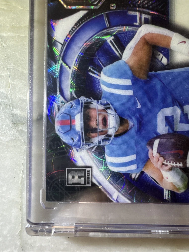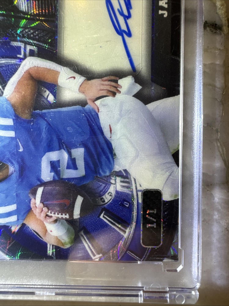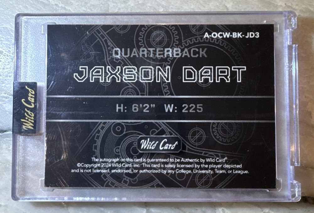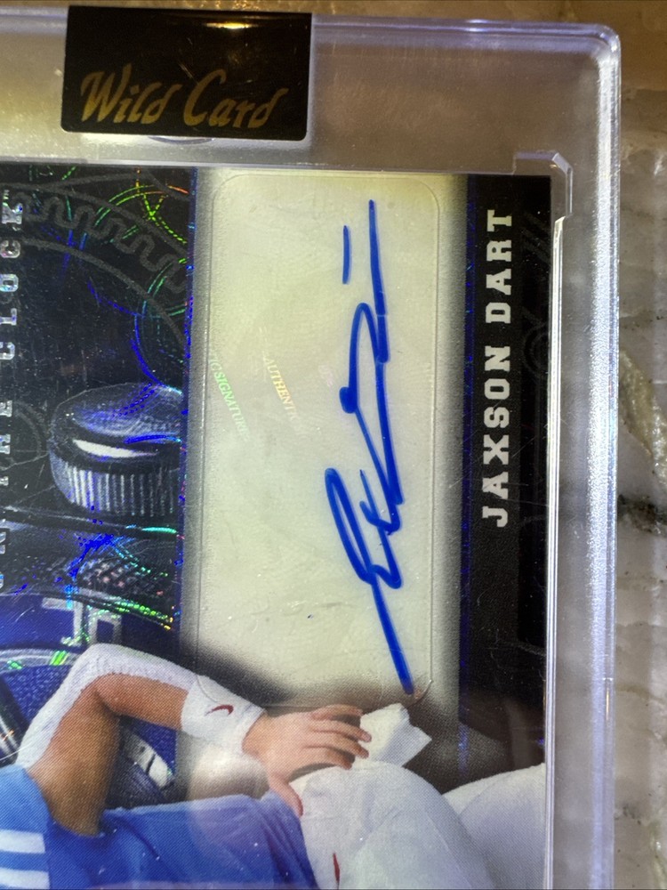 The 2024 Wild Card QB1 On The Clock Jaxson Dart White Teal Lazer Rookie RC #1/1 trading card is a rare and collectible item featuring football player Jaxson Dart. Manufactured by Wild Card, this card is part of the 2024 set and is a special rookie edition. With a unique QB1 parallel variety, this card is limited to only one copy, making it a highly sought-after piece for sports trading card enthusiasts and fans of Jaxson Dart.