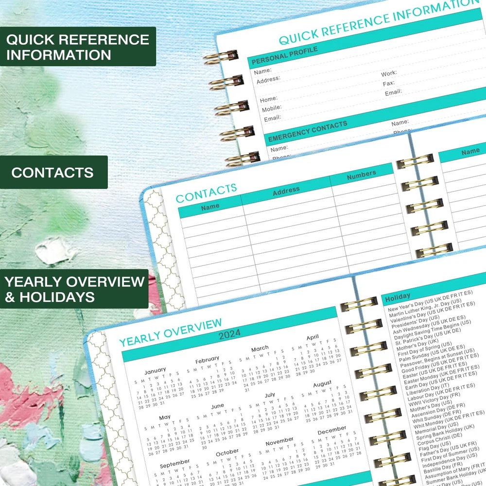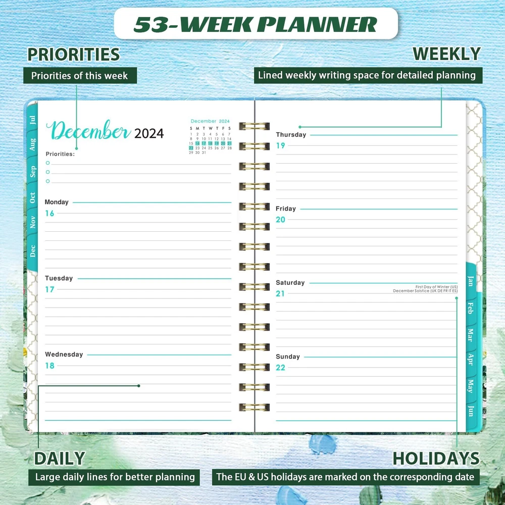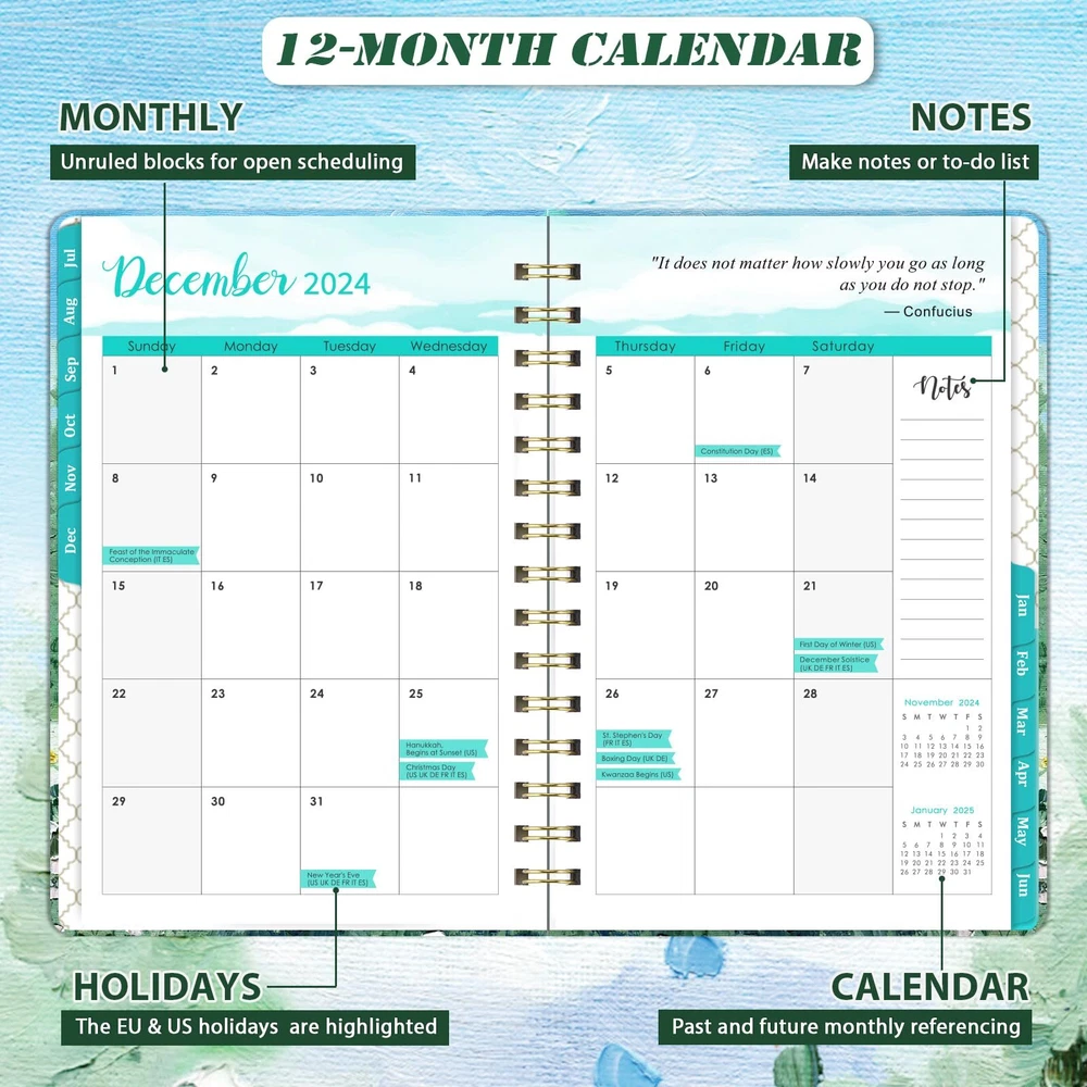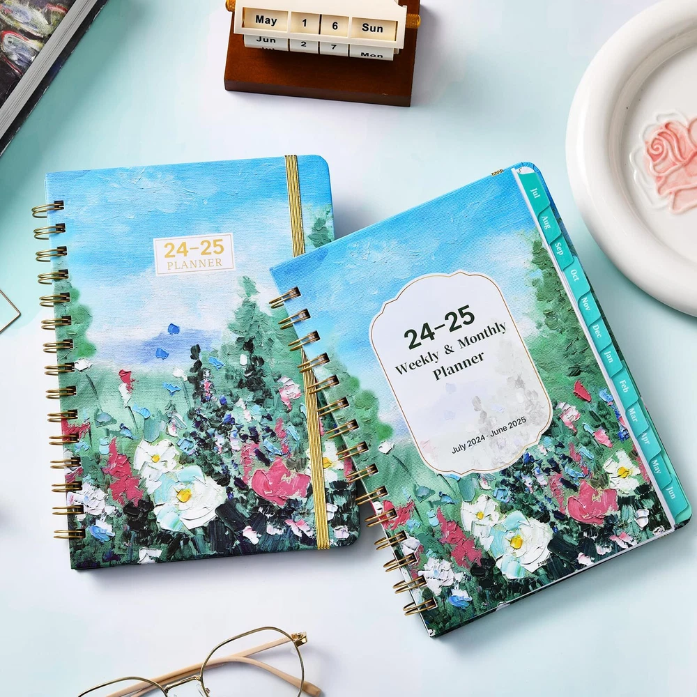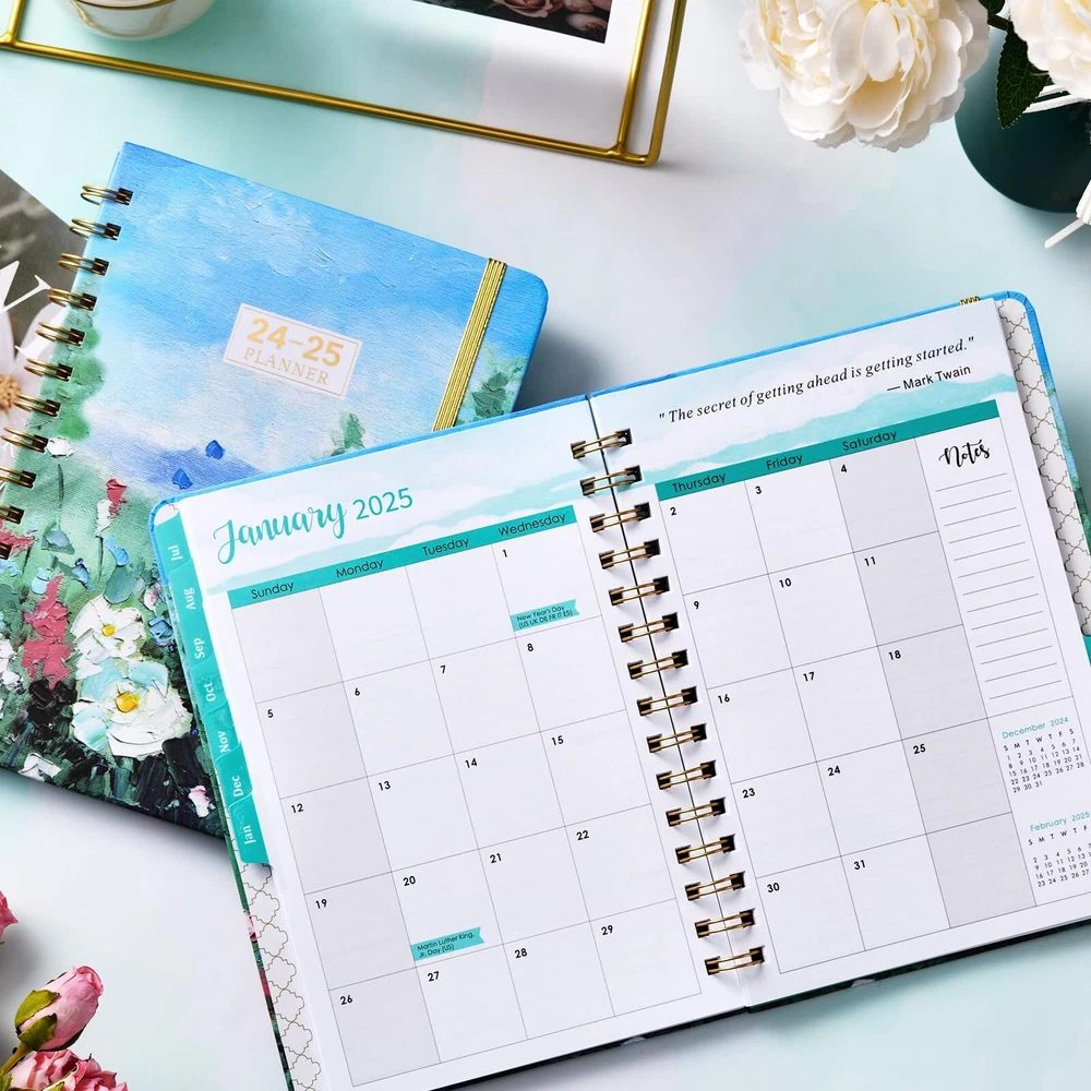 Planner 2024-2025 - This beautiful 2024-2025 Weekly & Monthly Planner covers 12 months which starts from JULY 2024 to JUNE 2025. Its sizes is 6.3 × 8.4 inches, making it a practical size for daily planning and scheduling. Monthly Planning - For monthly planning, the monthly calendar large view pages covers two pages which include one month Unruled 1.2" x1.25" Daily Blocks and Highlighted Holidays. In addition, the page's Past and Future Monthly Reference Calendar aids in long-term planning, and the Notes Section allows you to specify your monthly goals. Weekly Planning - For weekly scheduling and planning, this academic planner 2024-2025 highlights every date and significant holidays on the weekly view pages, which run from Sunday to Monday on two pages. Additionally, you have plenty of lined writing space on each weekly page to record your detailed planning. Functional Designs - | Inner Pocket | Elastic Closure | Flexible Hardcover | Strong Twin-Wire Binding | Planning Pages | Premium Thick Paper | Contacts | Quick Reference Information | Yearly Overview | Holidays Sturdy Planner -This 2024-2025 Weekly & Monthly Planner is made of premium thick paper, which which well avoid ink bleeding and feathering. Strong Twin-wire Binding and Sturdy Cover make this 2024-2025 Planner more sturdy.We hope that this Planner 2024-2025 will be a helpful partner as you work toward reaching your goal.