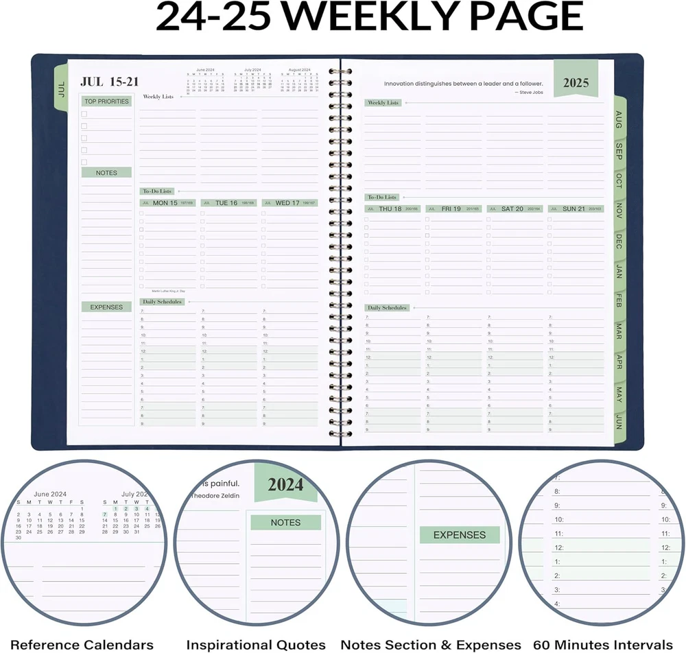 2024-2025 Planner - Weekly & Monthly 2024-2025, JUL 2024 - JUN blue Product Details Manufacturer: MaaIbok Brand: MaaIbok Item Weight: 14.9 ounces Package Dimensions: 11.34 x 8.62 x 0.83 inches Item model number: PDA4ZLPZSCRJH45 Color: blue Cover Material: Faux Leather Material Type: Faux Leather Sheet Size: 11.38'' x 8.74'' Manufacturer Part Number: PDA4ZLPZSCRJH45 Brand: MaaIbok Color: blue Cover Material: Faux Leather Year: 2024 Format: Organizer, Notebook Calendar Type: Hourly, Weekly_and_Monthly Target Audience: Adult Sheet Size: 11.38'' x 8.74'' Material: Faux Leather Pages: 160 Pages Planner 2024-2025 - This 2024-2025 daily weekly and monthly dates from JUL 2024 - JUN 2025, the size is: 11.38'' x 8.74'', it’s the great size for your daily planning. The soft faux leather cover of the planner makes it easier to put into backpacks, handbags, and without leaving any traces on the cover. Newly Layout - The special & stylish weekly pages of this 2024-2025 planner cover 2 full pages, and it with 3 Sections: System Categorizes, Prioritize Sections and Subdivided Schedules, the special funnel down inner pages design will help you make the plan more reasonably, and the inner pages are printed with green ink, the little detail can bring a little vitality to your life. New Weekly Page - There are 3 areas for better organizing your life/work. Weekly List of Activities area to write down your system activities categorizes, such as fitness, family activities, celebration, weekly summary.. Daily Things To-Do part to write down your detailed/prioritize things, and check box for tracking the accomplishment of them. 60 minutes interval appointments is for allocating the items listed above to a specific time so that you can complete them within the agreed time. 2024-2025 Monthly Page - The size of the monthly page is 11.38'' x 8.74'', there are large writing space and notes section for you to write all your schedules. Julian Dates as a time reminder to keep you know the pasted days and the remain days of the 2024-2025 year, Highlighted Holidays remind you to prepare in advance. Besides, 3-Month Reference Calendars help you better review the previous month and look forward to the next month. Functional Designs - Faux soft leather Cover + Twin-wire Binding + Green Ink inner Pages + Coated Monthly Tabs + Double Side Pockets + 60 Minutes Intervals + Quick Reference Information + Yearly Overview + Holidays + 2 Contacts Pages + 2 Note Pages + Inspirational Quotes + Expense Section + Julian Dates