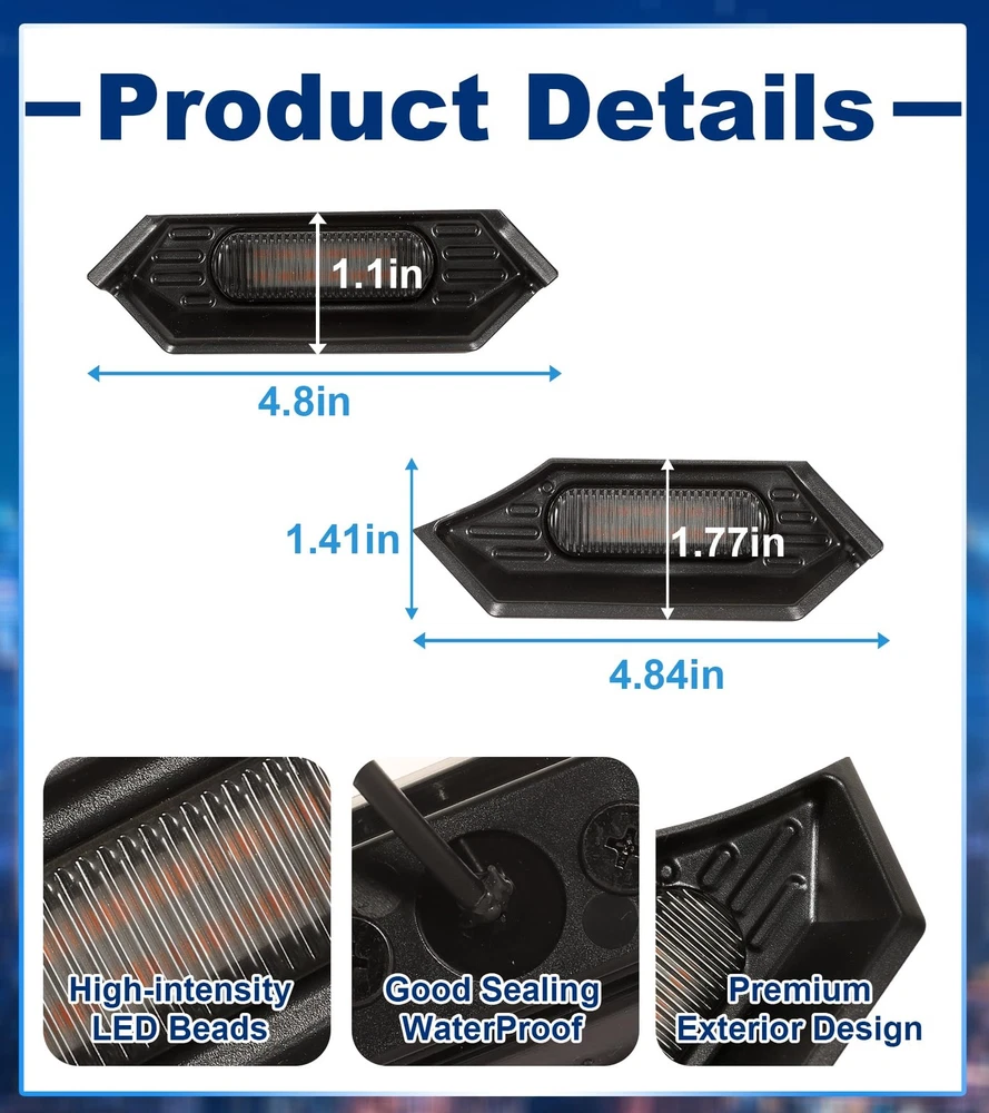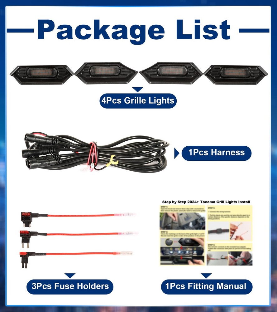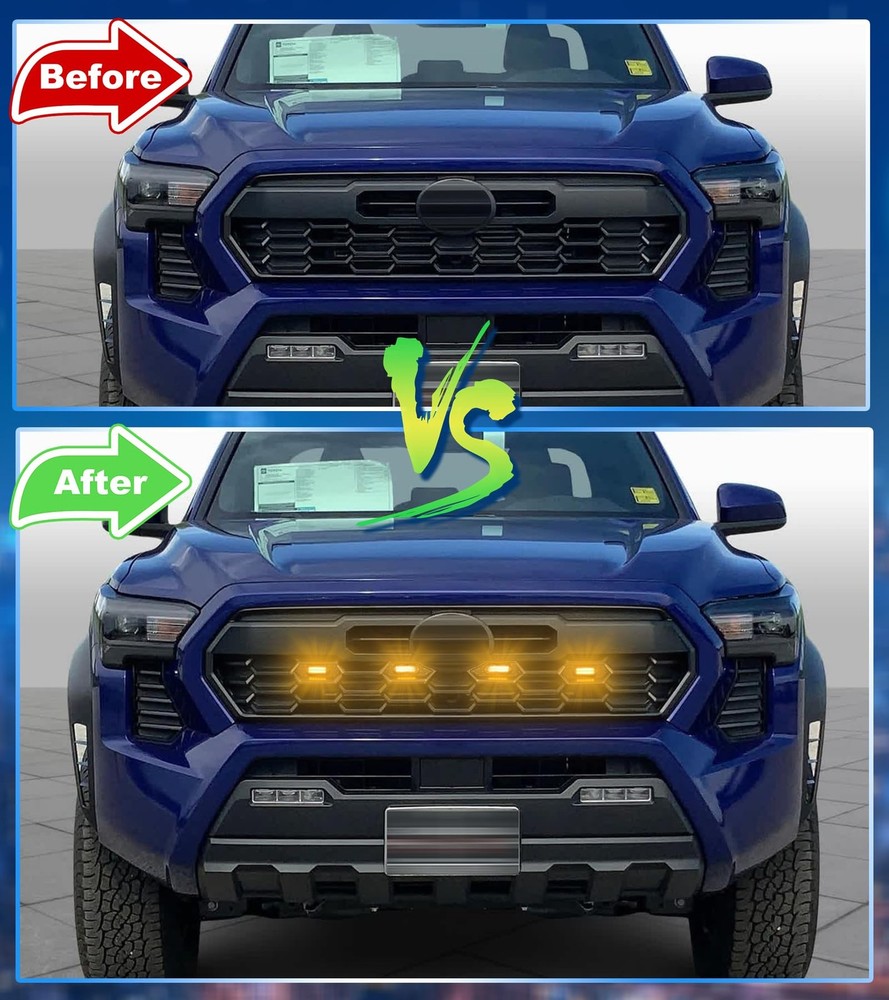Fit for 2024 2025 Tacoma TR D Off Road PreRunner Sport OEM Grill,but Please check before buying your grille,You can refer to the size of the product. Led front grill lights for 24 25 Tacoma can emitting super bright light to enhance visibility and safety while driving, these lights also add a sleek, stylish upgrade for a modern, aggressive look 【Fitment】Fit for 2026 2024 2025 Tacoma TR D Off Road PreRunner Sport OEM Grill,but Please check before buying your grille 【Package Includes】4pc grill lights,1pc wire harness,1pc fitting manual,3pc fuse holder 【How to Install】15-minute quick installation, easy to install. Black wire connects to the ground-, red wire connects to ACC 12V+,Package comes with detailed instructions 【Bright and Water-resistant】12 lightting per 1pc,1pcs=6watts. 1sets=4pcs leds total 24watts.Front Grill light for tacoma make your car visible in rain or fog, keeping you safe. Excellent waterproofing ensures they work in any weather 【Aftermarket Service】If you have any product issues, please find us directly by clicking "Ask a Question" in our . Thank you for your support.