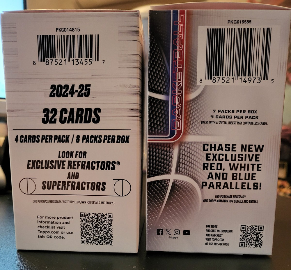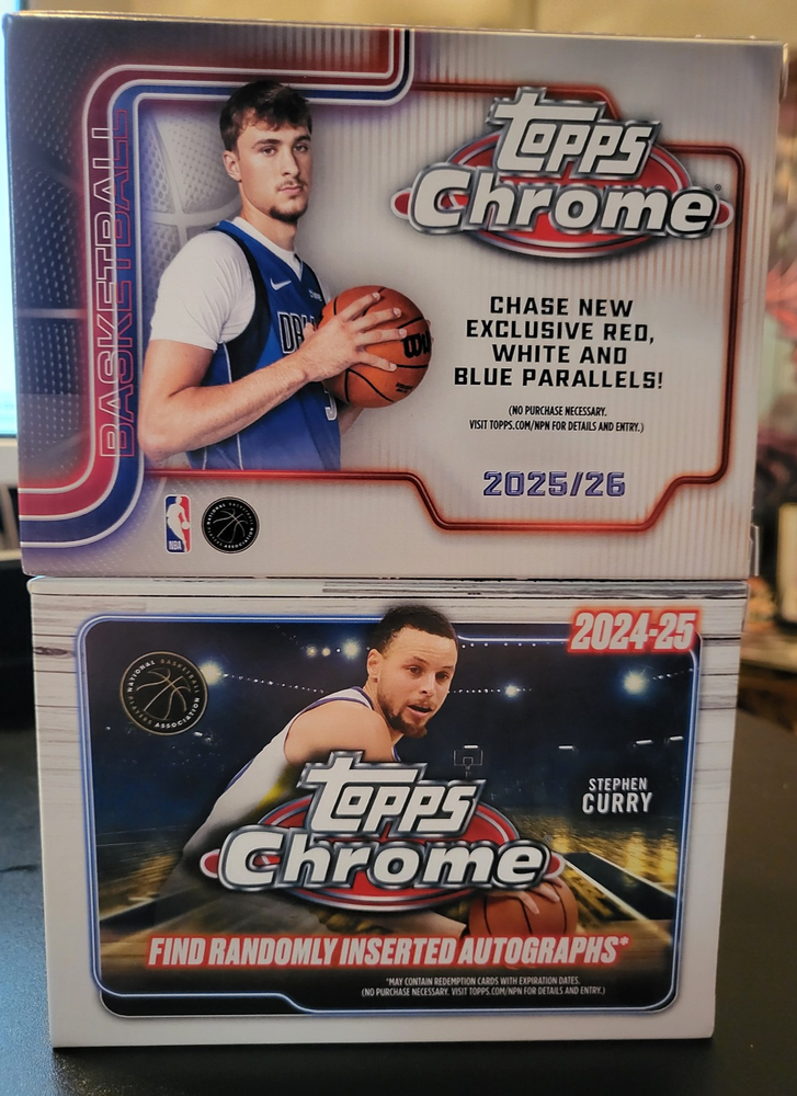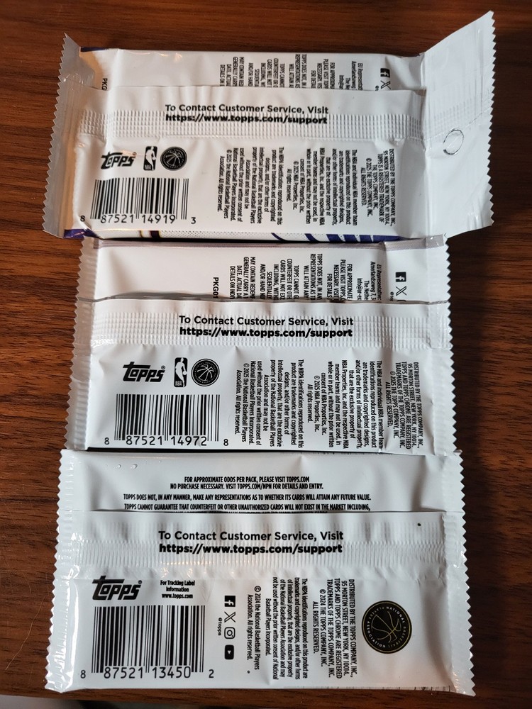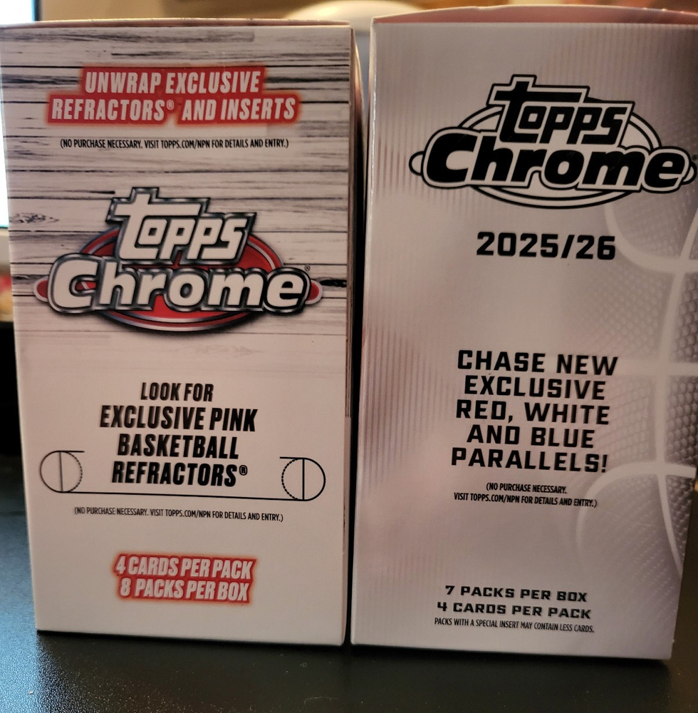 This 3 Pack includes the following pack 2024-25 Topps Chrome NBA 4 Card Blaster Box Pack - UPC: 887521 134502 2025-26 Topps Chrome NBA 4 Card Blaster Box Pack - UPC: 887521 149728 2025-26 Topps NBA 14 Card Hanger Pack - UPC: 887521 149193