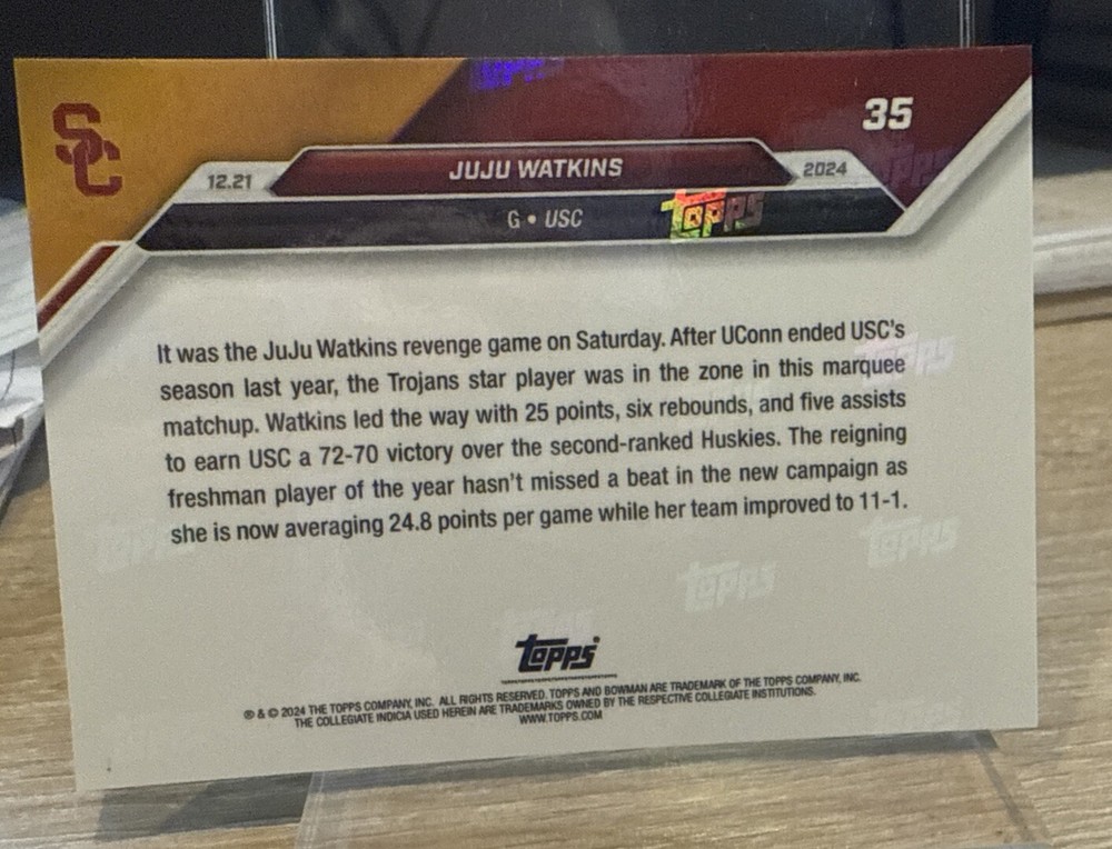 Capture the excitement of the court with the 2024-25 Bowman U NOW Basketball JuJu Watkins #35 card, celebrating a stellar performance that carries the USC Trojans past the #2 UConn team. This collector's item is part of the dynamic 2024-25 Bowman U Now set, showcasing the talent and prowess of college basketball's finest. As a genuine piece of sports memorabilia, this card is a tribute to JuJu Watkins and the thrilling NCAA experience. Manufactured in the United States, it's a standard-sized base variety card that has not been autographed. It's a must-have for fans of the sport and collectors alike, representing a snapshot of basketball history in the making.