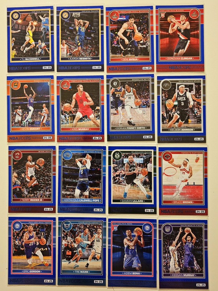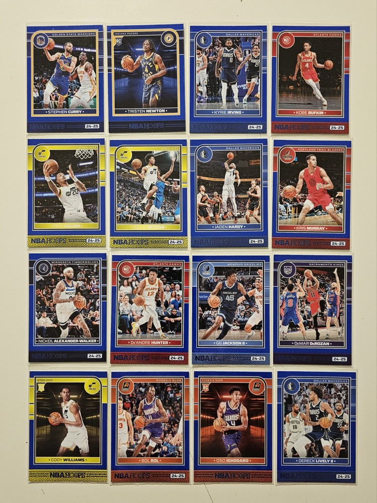 The product is a set of 110 NBA Hoops basketball trading cards from the 2024-25 season featuring rookie patches in blue and purple parallel versions. The cards include rookies and veteran players like Stephen Curry from teams such as the Charlotte Hornets, Chicago Bulls, and Houston Rockets. The cards are manufactured by Panini and are made of card stock in English language.
