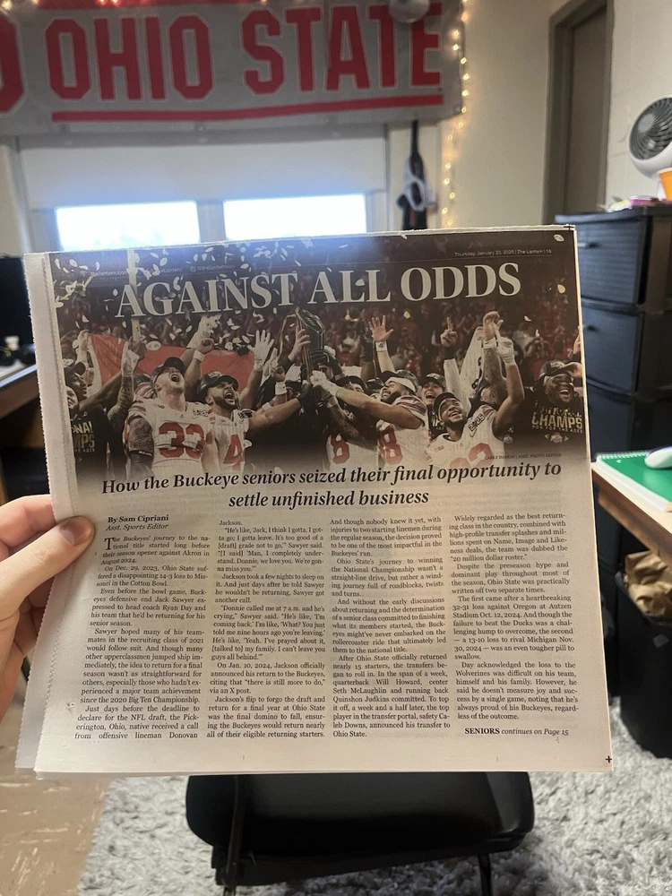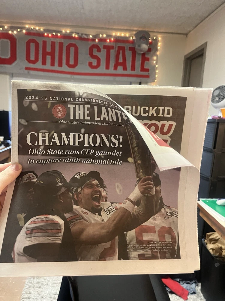 This limited-time newspaper celebrates the Ohio State Buckeyes' 2024-25 NCAA Championship victory, featuring official licensing and branding by The Lantern. The newspaper is in one size and showcases vibrant multi-color designs suitable for football fans. Perfect for collectors and fans alike, this officially licensed product commemorates the team's success in the NCAA Championship, making it a must-have for Ohio State supporters eager to relive the memorable season. *1 newspaper