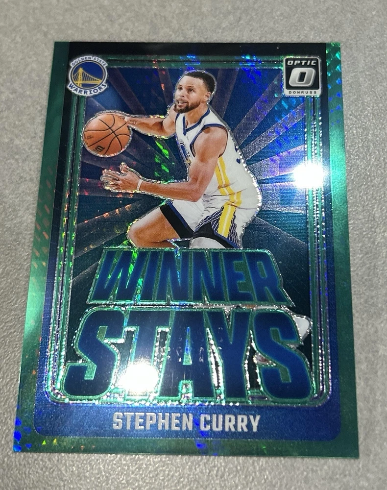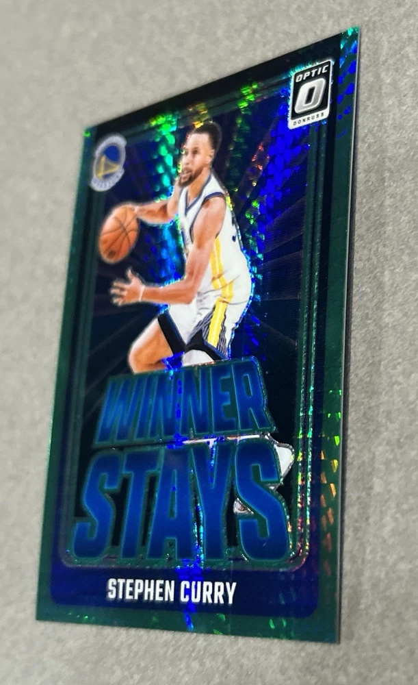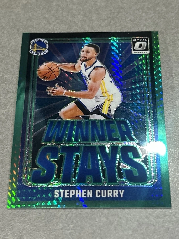 The product is a 2024-25 Panini Donruss Optic Stephen Curry trading card from the Winner Stays insert set. This particular card is a Green Hyper Prizm parallel with a limited print run of 249. It features the player Stephen Curry from the Golden State Warriors in the National Basketball Association (NBA). The card is an original licensed print by Panini and is in near mint or better condition, making it a valuable collector's item for fans of basketball trading cards.