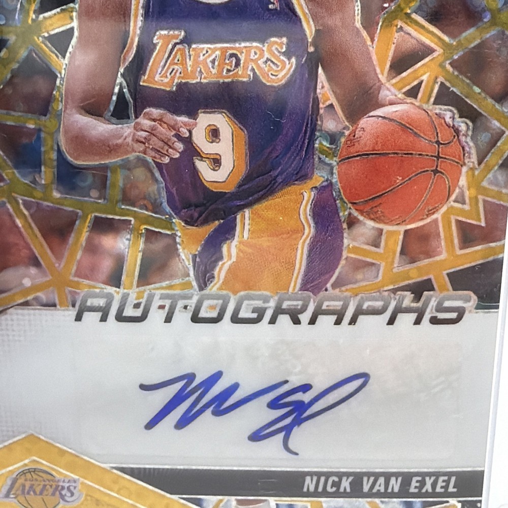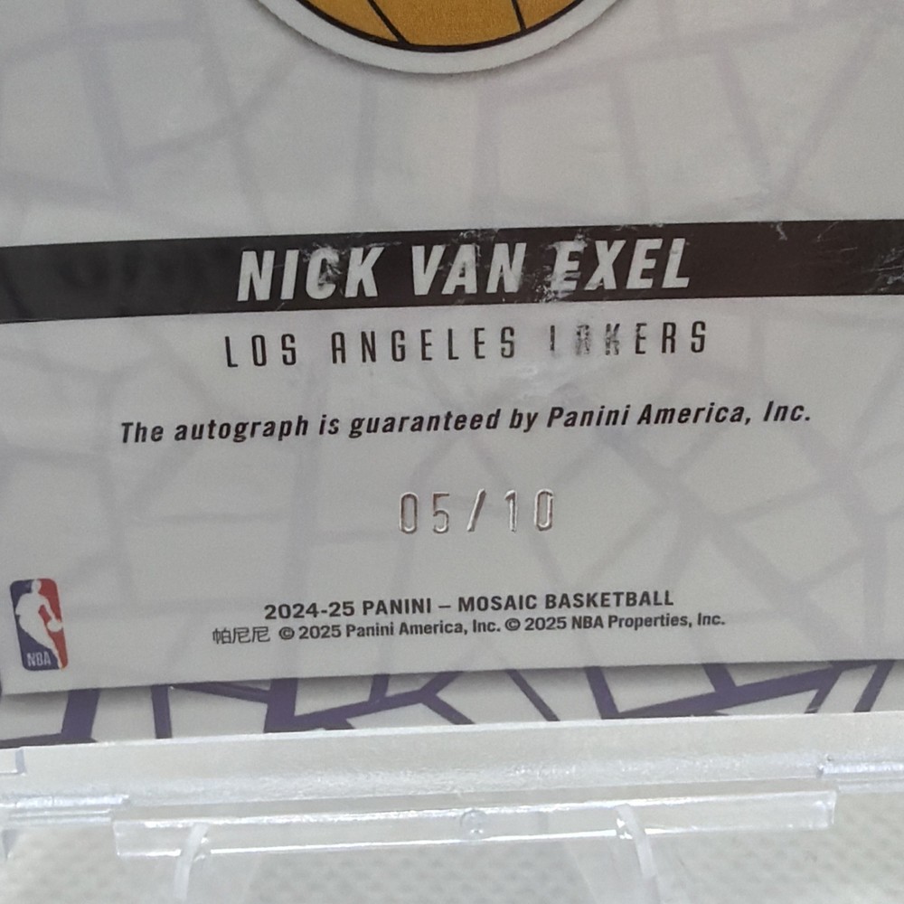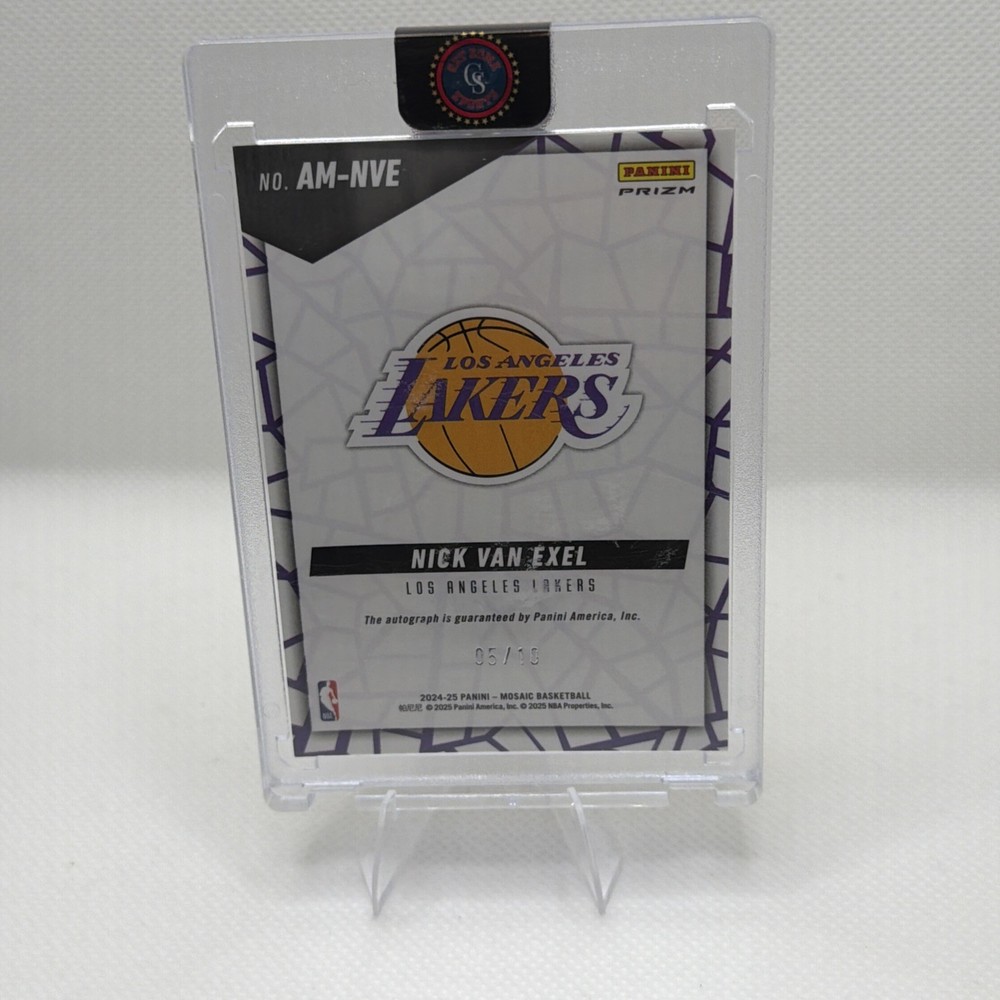 The 2024-25 Panini Mosaic Nick Van Exel Gold Prizm Autograph #AM-NVE Lakers /10 is a highly sought-after sports trading card featuring an autograph of Nick Van Exel, former player for the Los Angeles Lakers in the NBA. This limited edition card is part of the Autographs Mosaic insert set, with only 10 in existence, making it a rare and valuable collectible for basketball fans and trading card enthusiasts. Authenticated by Panini Authentic, this card is a must-have for fans of the sport and collectors alike.
