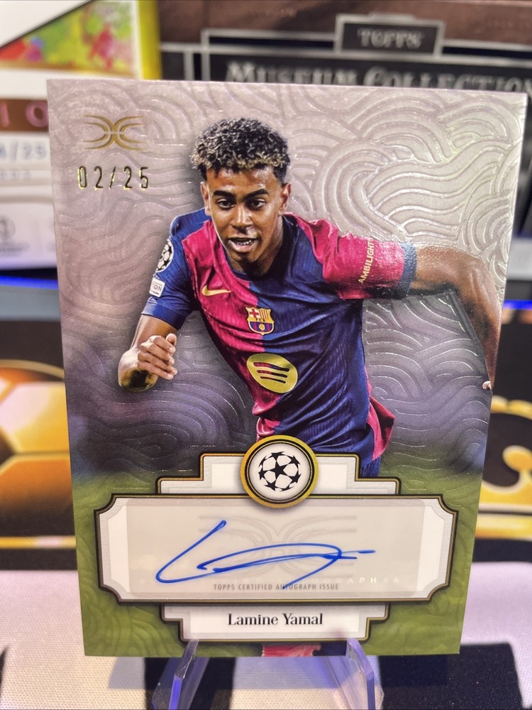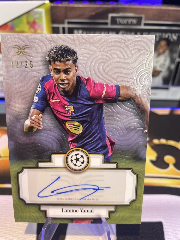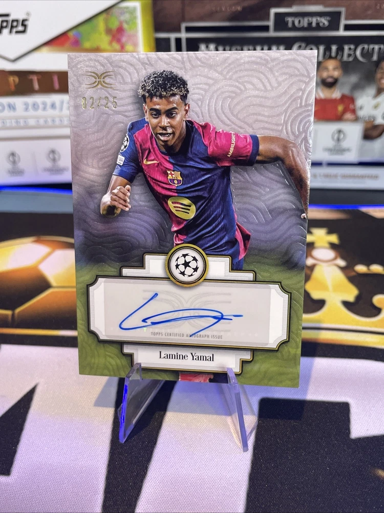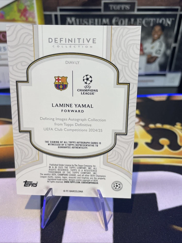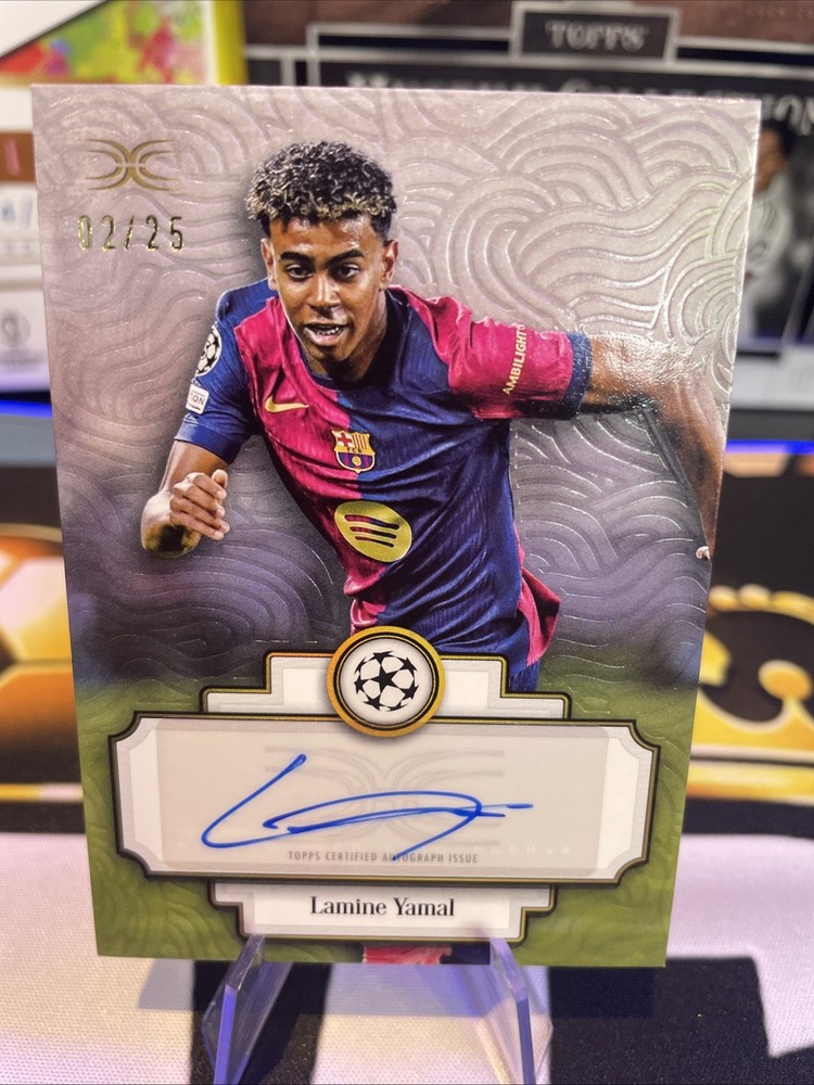 The product is a 2024/25 Topps Definitive Collection Lamine Yamal autographed trading card, featuring the player from FC Barcelona and Spain. With a label or sticker autograph format and made of 35 Pt. card stock, this limited edition card is numbered 02/25. Authenticated by Topps, this original card is a must-have for football memorabilia collectors, showcasing the athlete from the UEFA Champions League and UEFA European Football Championship. A true gem for fans of Lamine Yamal and football trading cards.