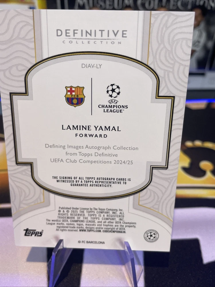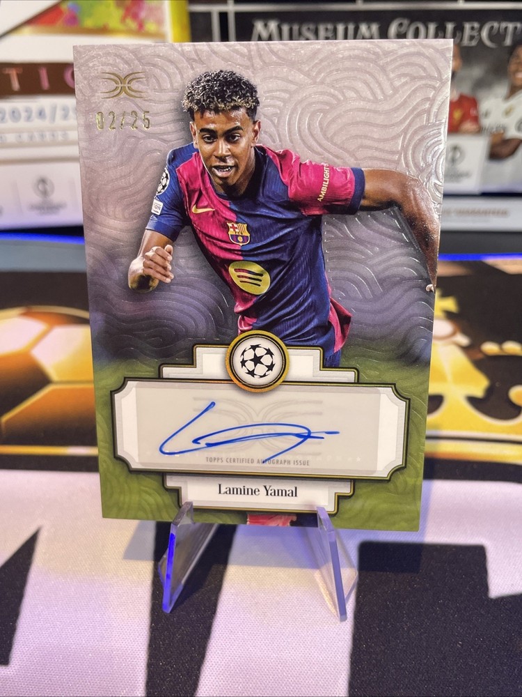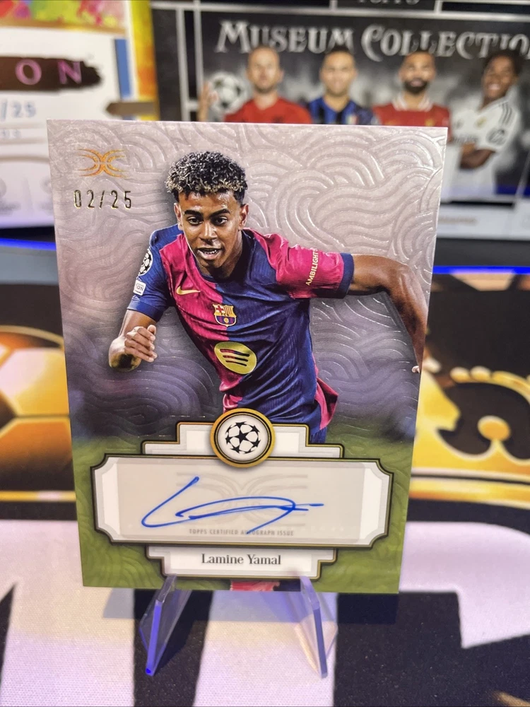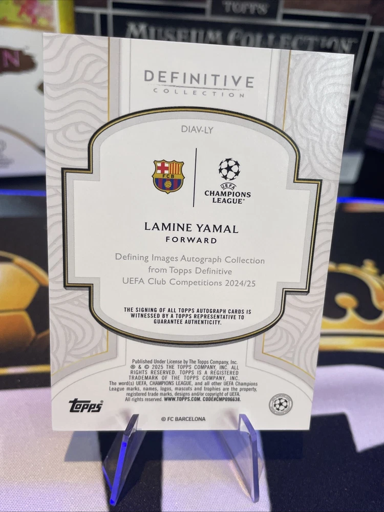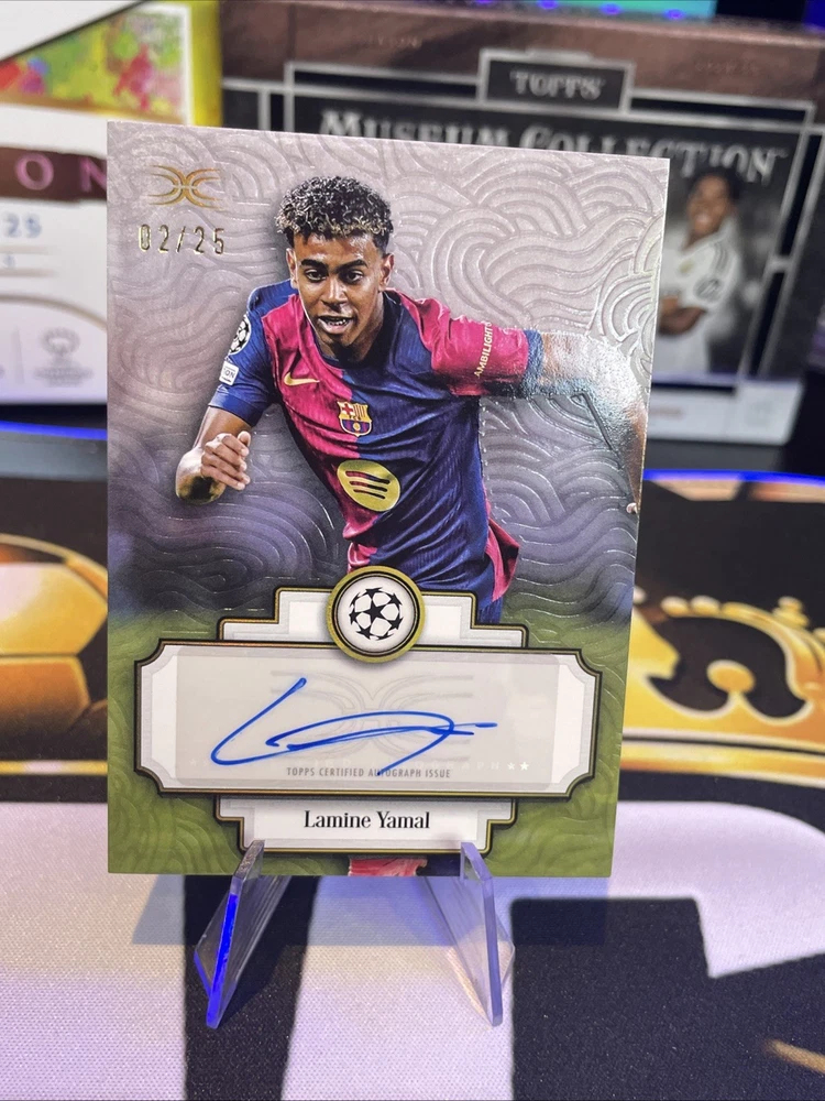 The product is a 2024/25 Topps Definitive Collection Lamine Yamal autographed trading card, featuring the player from FC Barcelona and Spain. With a label or sticker autograph format and made of 35 Pt. card stock, this limited edition card is numbered 02/25. Authenticated by Topps, this original card is a must-have for football memorabilia collectors, showcasing the athlete from the UEFA Champions League and UEFA European Football Championship. A true gem for fans of Lamine Yamal and football trading cards.