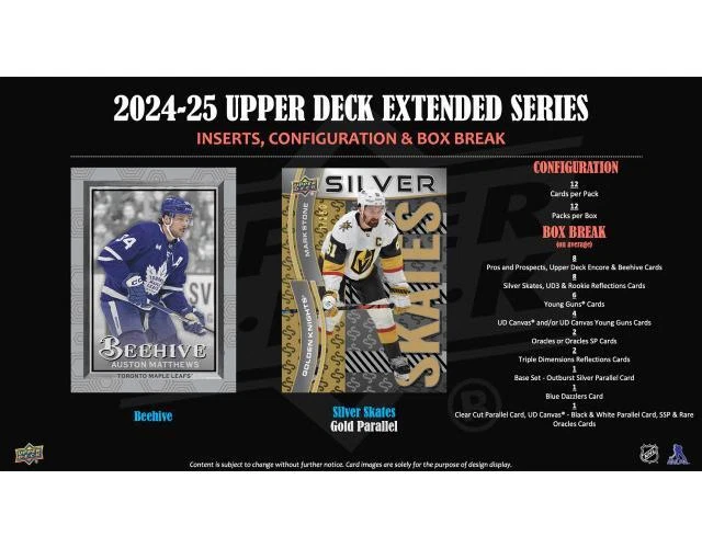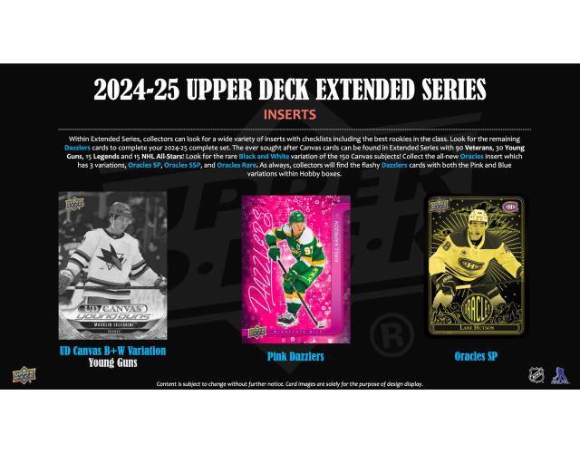 2024/25 Upper Deck Extended Series Hockey Hobby Box **Per Upper Deck Rules and Regulations, this product cannot ship to Canada until after a year from release.** 2024/25 Upper Deck Extended Series Hockey Hobby Box Each Box contains Six Youngs or 1st Round Rookies, Four UD Canvas Cards, One Base Set Outburst Parallel, One Blue Dazzlers, and Two Oracles/Oracles SP Cards, on average! Following a jaw-dropping 2024-25 campaign that saw Alex Ovechkin break the NHL's all-time goals record, Upper Deck is honoring the milestone with a legendary chase: Ovechkin Young Guns Buyback Autographs in the upcoming 2024-25 Upper Deck Extended Series. Just eight (8) of these iconic cards will be planted throughout Hobby and e-Pack boxes. These authentic Young Guns rookies are autographed and hand-numbered by Ovi himself. The holy grail of this set is the inscribed GR8/8 copy, a perfect tribute to his jersey number and nickname. As Ovechkin cemented himself into the record books in the 2024-25 NHL season, these cards offer a direct, tangible piece of hockey history. Be on the lookout for these iconic cards in 2024-25 Extended Series! Complete your 2024-25 Upper Deck Base Set - the most cherished and sought-after annual set in hockey! Extended Series delivers the final 250 cards: 200 veterans and 50 Young Guns/1st Round Rookies (2024-25 rookies that were first round selections). Each box contains six Young Guns/1st Round Rookies cards, on average. Be on the lookout for elusive parallels of these exciting cards: - Outburst (Collect 1 Outburst parallel per box, on average!) - Clear Cut (Hobby exclusive) - Deluxe (#'d to 250) - Exclusives (#'d to 100) - Outburst Red (#'d to 25) - High Gloss (#'d to 10) - Outburst Gold (#'d 1-of-1) Complete your 2024-25 UD Canvas set! In addition to the veteran cards, keep an eye out for Young Guns, Legends and NHL All-Star subset cards. Collect four of these cards per box (on average)! Collectors can look for the exciting and Hobby-exclusive Black & White Variations as these deliver four (4) per case, on average! Finish off your Blue Dazzlers and Pink Dazzlers insert sets with the final 50 cards of the 2024-25 season. The checklist features several superstars! Look for one (1) Blue Dazzlers card per box, on average! As well as one Pink Dazzlers per case, on average! Extended Series delivers both new and classic Upper Deck insert sets that will catch the eye of both seasoned and new collectors: Oracles: Star veterans and rookies stack the checklist of this all-new mystical insert! Each Oracles variant showcases a different color in the design so keep an eye out for the SP, SSP and Rare Variants! Triple Dimensions Reflections: This fan-favorite design returns to Extended Series with a handful of numbered parallels and an impressive checklist. Lucky Collectors can find the Gold Parallel (#'d 50) and Sapphire Parallel (#'d to 10) amongst other numbered parallels! Upper Deck Encore: Once a staple in The Hobby, Upper Deck Encore brings back its classic feel to 24-25 Extend Series! Look for these nostalgic cards with a checklist chock-full of star veterans and the top rookies. UD3: Look for the classic UD3 Future Impact cards that have been in Upper Deck products for over 20 years! This set features a horizontal design and has an impressive checklist filled with a balance of superstars and top 2025-25 rookies! BOX BREAK: 6 - Young Guns or 1st Round Rookies Cards 4 - UD Canvas Cards 1 - Base Set - Outburst Parallel Card 1 - Base Set - Clear Cut Parallel, UD Canvas Black & White Parallel, Oracles SSP and Oracles Rare Cards 8 - Upper Deck Encore, Pros and Prospects, Beehive Cards 1 - Blue Dazzlers Card 2 - Triple Dimension Reflections Cards 8 - Silver Skates, Rookie Reflections and UD3 Cards 2 - Oracles and Oracles SP Cards 3 - Wildcards (Includes Rare Ratio'd & #'d Cards!) PRODUCT BREAKDOWN: Young Guns and 1st Round Rookies Cards: Young Guns 1:4 Young Guns - Outburst Parallel 1:100 Young Guns - Clear Cut Parallel (Hobby Exclusive!) 1:240 Young Guns - Deluxe Parallel #'d to 250 Young Guns - UD Exclusives Parallel #'d to 100 Young Guns - Outburst Red Parallel #'d to 25 Young Guns - High Gloss Parallel #'d to 10 Young Guns - Outburst Gold Parallel #'d 1-of-1 UD Canvas Young Guns 1:24 UD Canvas Young Guns - Black & White Parallel (Hobby Exclusive!) 1:135 UD Canvas Young Guns - Printing Plates N/A 1st Round Rookies 1:5 1st Round Rookies - Outburst Parallel 1:150 1st Round Rookies - Clear Cut Parallel (Hobby Exclusive!) 1:360 1st Round Rookies - Deluxe Parallel #'d to 250 1st Round Rookies - UD Exclusives Parallel #'d to 100 1st Round Rookies - Outburst Red Parallel #'d to 25 1st Round Rookies - High Gloss Parallel #'d to 10 1st Round Rookies - Outburst Gold Parallel #'d 1-of-1 Insert Cards: UD3 1:5 UD3 - Gold Parallel #'d to 333 Beehive 1:5 Dazzlers Blue 1:12 Dazzlers Pink 1:72 Dazzlers Blue Printing Plates N/A NEW! Oracles 1:8 NEW! Oracles SP 1:30 NEW! Oracles SSP 1:45 NEW! Oracles Rare 1:180 NEW! Pros and Prospects 1:4 NEW! Rookie Reflections 1:5 NEW! Rookie Reflections - Gold Parallel #'d to 100 Silver Skates 1:4 Silver Skates - Gold Parallel #'d to 250 NEW! Trilogy Rookie Premiere - Common #'d to 999 NEW! Trilogy Rookie Premiere - Uncommon #'d to 499 NEW! Trilogy Rookie Premiere - Rare #'d to 99 NEW! Triple Dimension Reflections 1:6 NEW! Triple Dimension Reflections - Ruby Parallel #'d to 500 NEW! Triple Dimension Reflections - Amethyst Parallel #'d to 300 NEW! Triple Dimension Reflections - Emerald Parallel #'d to 100 NEW! Triple Dimension Reflections - Gold Parallel #'d to 50 NEW! Triple Dimension Reflections - Sapphire Parallel #'d to 10 UD Canvas 1:4 UD Canvas - Printing Plates N/A UD Canvas - Black and White Parallel 1:60 UD Canvas - Legends 1:96 UD Canvas - Legends Black and White Parallel 1:540 UD Canvas - Legends Printing Plates N/A UD Canvas - NHL All-Stars 1:96 UD Canvas - NHL All-Stars Black and White Parallel 1:540 UD Canvas - NHL All-Stars Printing Plates N/A NEW! Upper Deck 