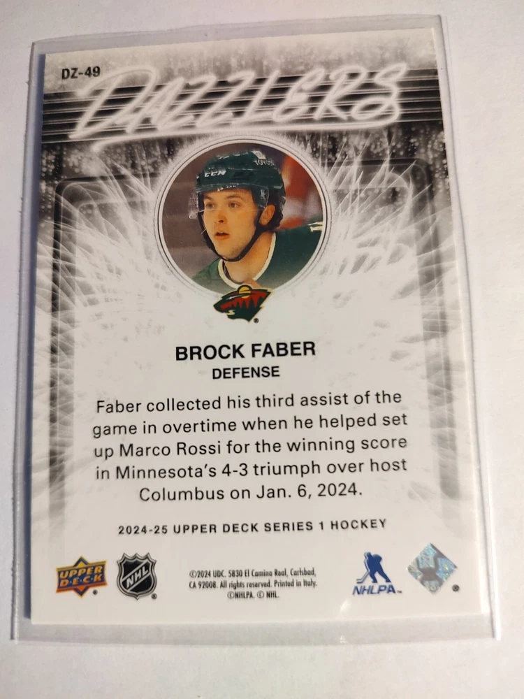 Dive into the excitement of the 2024-25 ice hockey season with the Upper Deck Series 1 Dazzlers Green card featuring Brock Faber of the Minnesota Wild. This striking insert showcases the athlete's prowess on the ice, capturing the essence of the sport in a single, sleek design. With card number DZ-49, it's a must-have for collectors and fans alike. Crafted with the quality Upper Deck is known for, this sports trading card is part of a set that celebrates the best of the NHL. The Dazzlers series, highlighted by its vibrant green parallel variety, adds a splash of color and prestige to any collection. Whether you're a fan of Faber, the Wild, or just the game, this card is a prime pick for your next acquisition.