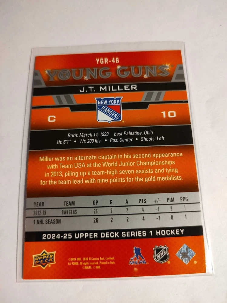 Elevate your sports memorabilia collection with the 2024-25 Upper Deck Series 1 Young Guns Renewed #YGR-46 card featuring the tenacious J.T. Miller of the New York Rangers. As a sought-after insert from the renowned manufacturer Upper Deck, this card is a must-have for enthusiasts of Ice Hockey and collectors of NHL trading cards. The card highlights Miller's dynamic presence on the ice and is a testament to his enduring legacy within the sport. With the precision and quality synonymous with the Upper Deck brand, this collectible is a standout addition to any sports trading card set. Whether you're a die-hard Rangers fan or a dedicated collector of the series, this card captures a piece of ice hockey history.