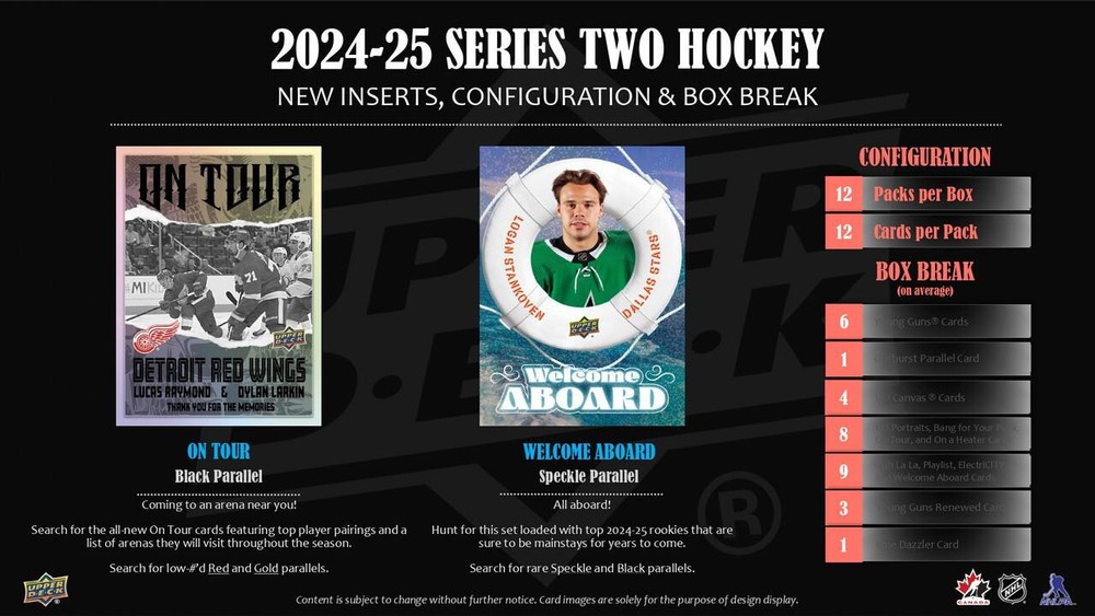 2024/25 Upper Deck Series 2 Hockey Hobby Box **Per Upper Deck Rules and Regulations, this product cannot ship to Canada until after a year from release.** 2024/25 Upper Deck Series 2 Hockey Hobby Box Each Box contains Six Young Guns Rookie Cards, One Outburst Parallel, Four UD Canvas Cards, and One Blue Dazzler Card! PRODUCT BREAKDOWN: Young Guns: Young Guns (451-500) 1:2 Young Guns - Outburst Silver Parallel 1:60 Young Guns - Clear Cut Parallel 1:144 Young Guns - Deluxe Parallel #'d to 250 Young Guns - Exclusives Parallel #'d to 100 Young Guns - Outburst Red Parallel #'d to 25 Young Guns - High Gloss Parallel #'d to 10 Young Guns - Outburst Gold Parallel #'d 1-of-1 Young Guns Renewed 1:4 Young Guns Renewed Printing Plates N/A Young Guns Renewed - Exclusives Parallel #'d to 100 Young Guns Renewed - High Gloss Parallel #'d to 10 UD Canvas Young Guns 1:24 UD Canvas Young Guns Printing Plates N/A UD Canvas Young Guns - Black & White Parallel 1:216 Insert Cards: Bang For Your Puck 1:7 Bang For Your Puck - Speckle Parallel 1:53 Bang For Your Puck - Black Parallel 1:314 Bang For Your Puck - Red Parallel #'d to 99 Bang For Your Puck - Gold Parallel #'d to 10 Dazzlers - Blue 1:12 Dazzlers - Pink 1:144 Dazzlers - Printing Plates N/A Electricity 1:5 ElectriCITY - Speckle Parallel 1:40 ElectriCITY - Black Parallel 1:360 Fluorescence Red 1:36 Fluorescence - Gold Parallel #'d to 150 Fluorescence - Blue Parallel #'d to 50 Fluorescence - Green Parallel #'d to 15 Fluorescence - Magenta Parallel #'d to 5 On a Heater 1:10 On a Heater - Speckle Parallel 1:80 On a Heater - Black Parallel 1:480 On a Heater - Red Parallel #'d to 99 On a Heater - Gold Parallel #'d to 10 On Tour 1:5 On Tour - Speckle Parallel 1:38 On Tour - Black Parallel 1:225 On Tour - Red Parallel #'d to 99 On Tour - Gold Parallel #'d to 10 Ooh La La 1:5 Ooh La La - Speckle Parallel 1:40 Ooh La La - Black Parallel 1:360 Playlist 1:5 Playlist - Speckle Parallel 1:40 Playlist - Black Parallel 1:360 Population Count 1000 1,000 Copies Population Count 500 500 Copies Population Count 100 100 Copies Population Count 50 50 Copies Population Count 25 25 Copies Population Count 10 10 Copies Population Count 1 1 Copy UD Canvas 1:4 UD Canvas Printing Plates N/A UD Canvas - Black & White Parallel 1:48 UD Canvas - Program of Excellence 1:96 UD Canvas - Program of Excellence - Printing Plates N/A UD Canvas - Program of Excellence - Black & White Parallel 1:864 UD Canvas - Retired 1:96 UD Canvas - Retired - Printing Plates N/A UD Canvas - Retired - Black & White Parallel 1:864 UD Portraits 1:5 UD Portraits - Speckle Parallel 1:40 UD Portraits - Black Parallel 1:240 UD Portraits - Red Parallel #'d to 99 UD Portraits - Gold Parallel #'d to 10 Welcome Aboard 1:5 Welcome Aboard - Speckle Parallel 1:40 Welcome Aboard - Black Parallel 1:36 Base Set Cards: Base Set (251-450) N/A Base Set - Outburst Silver Parallel 1:15 Base Set - Clear Cut Parallel 1:48 Base Set - Deluxe Parallel #'d to 250 Base Set - Exclusives Parallel #'d to 100 Base Set - Outburst Red Parallel #'d to 25 Base Set - High Gloss Parallel #'d to 10 Base Set - Outburst Gold Parallel #'d 1-of-1 12 Packs Per Box, 12 Cards Per Pack