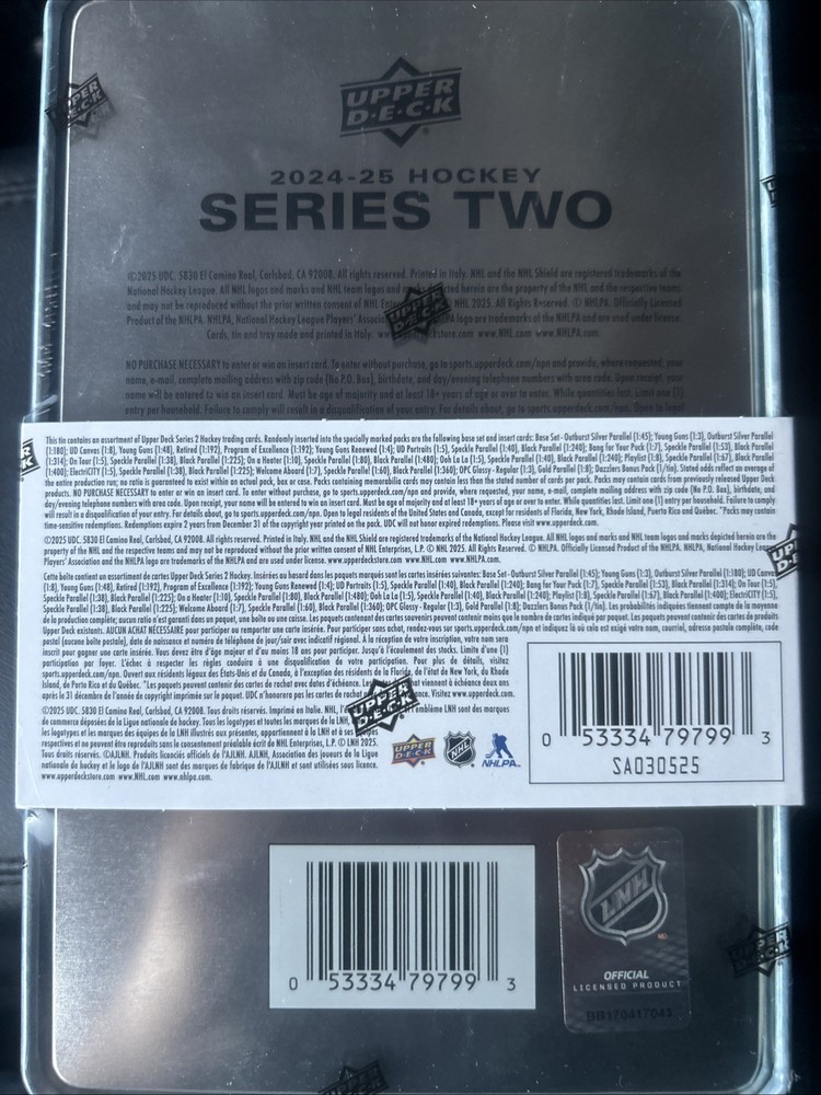 The 2024-25 Upper Deck Series 2 Tin is a factory-sealed product containing one box of 99 standard-sized trading cards featuring players from the National Hockey League (NHL). Manufactured by Upper Deck in 2024, this limited edition set offers exclusive rookie cards, parallel cards, inserts, and chase cards for collectors. With autograph authentication from Upper Deck, this modern era sports trading card product is a must-have for fans of ice hockey and collectors looking to add unique and valuable cards to their collection.