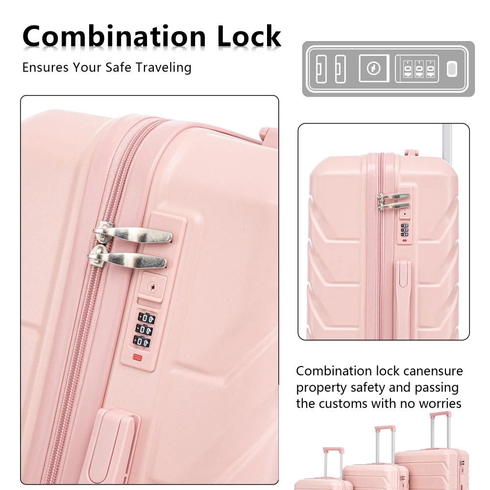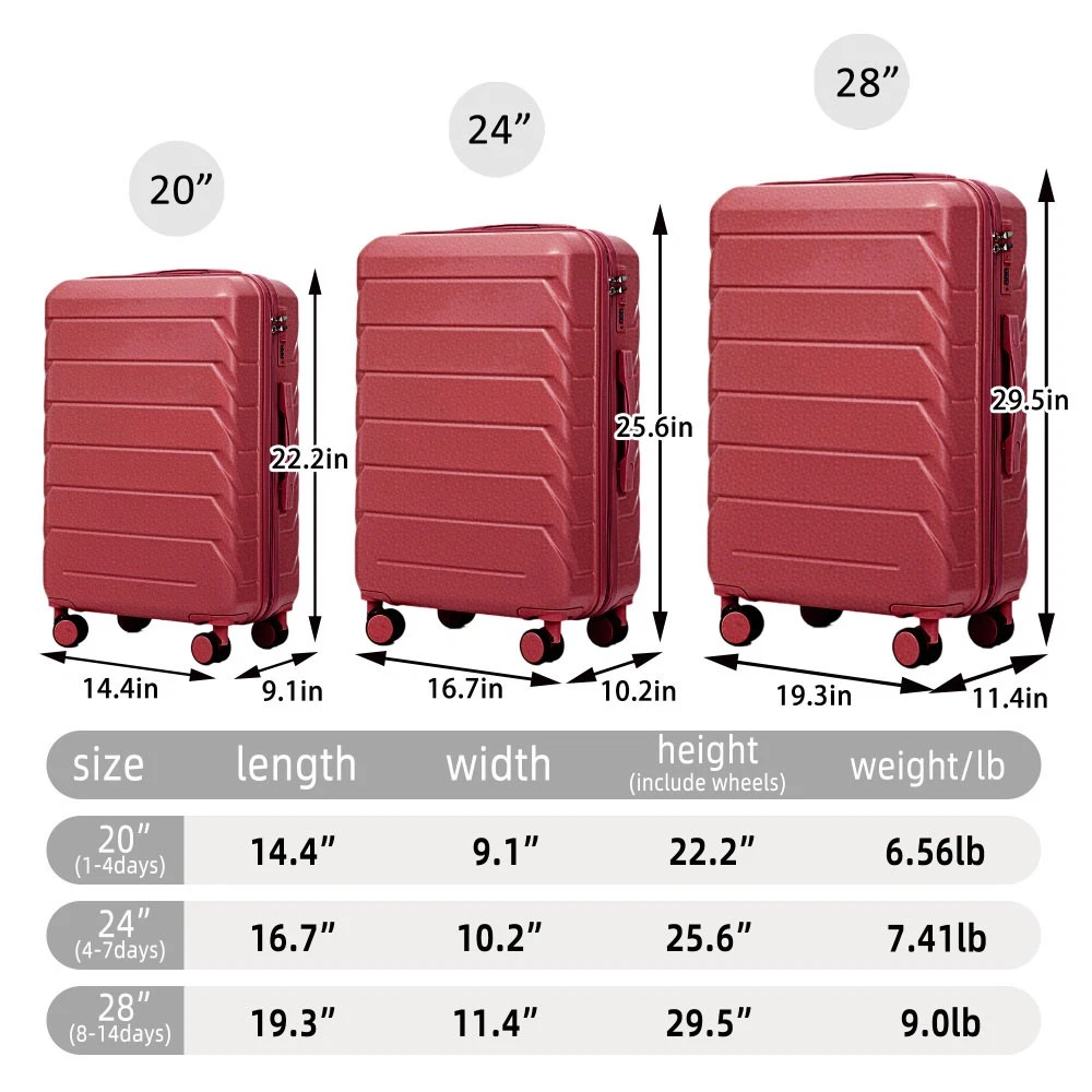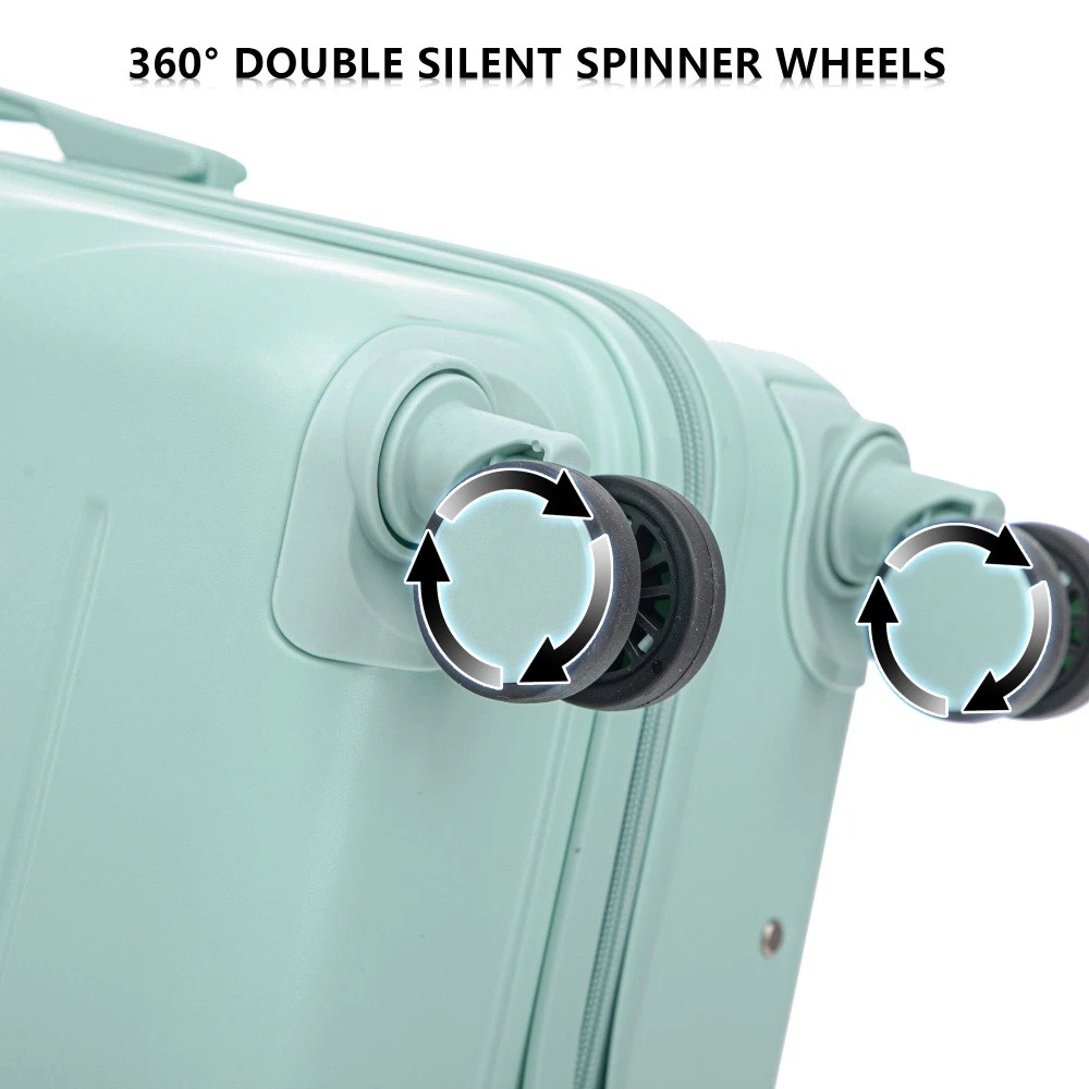 Durable & Waterproof:Our family suitcase set features sturdy watertight ABS external, which is easy to clean and long-term use. It can carry a large weight while having four swivel wheels that can move effortlessly in any direction. Full-Capacity Design Inside Suitcase: Large storage space and fully lined interior with zippered compartment for this hard side luggage sets to keep your items well organized. Low profile top and side handle provide for ease in handling. Retractable Handle:The ergonomically designed push-button 3-step adjustable telescopic handle makes opening and closing a breeze. What's more, it fits any size hand and reduces stress when climbing stairs. Modern Appearance:The stylish and smooth stripe design of the rolling luggage makes it more resistant to pressure and wear and brings a good mood to your journey. It includes four molded side feet, they allow the luggage to remain upright even when standing on its side. Retractable Handle The ergonomically designed push-button 3-step adjustable telescopic handle makes opening and closing a breeze. What's more, it fits any size hand and reduces stress when climbing stairs. Full-Capacity Design Inside Suitcase Large storage space and fully lined interior with zippered compartment for this hard side luggage sets to keep your items well organized. Low profile top and side handle provide for ease in handling. 360° DOUBLE SILENT SPINNER WHEELS 1.Silent wheel, no noise, comfortable and convenient. 2. Double row protection, strong load capacity. 3. 360° smooth and arbitrary rotation, light and convenient. Anti-scratch ABS Hard Shell Enhanced thickening Anti-scratch ABS material build; strong resistance to stress; nontoxic, odour-free, impressive resistant to low and high temperature, an innovation material in hard luggage industry. Large capacity 1.Large space, luxurious interior. 2.The fixed buckle prevents the clothes from shifting, is convenient and practical. 3.There are multiple layers of space, the clothes are layered, clean and easy to take, saving space.