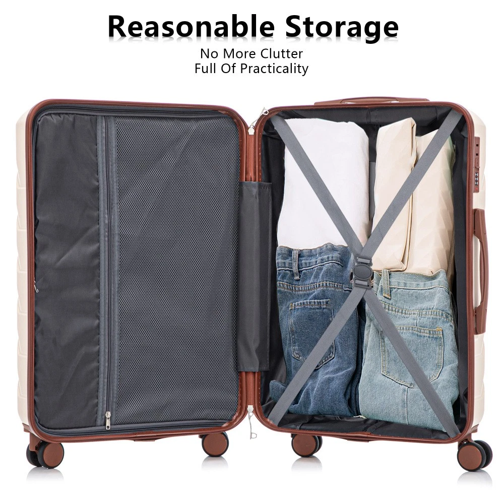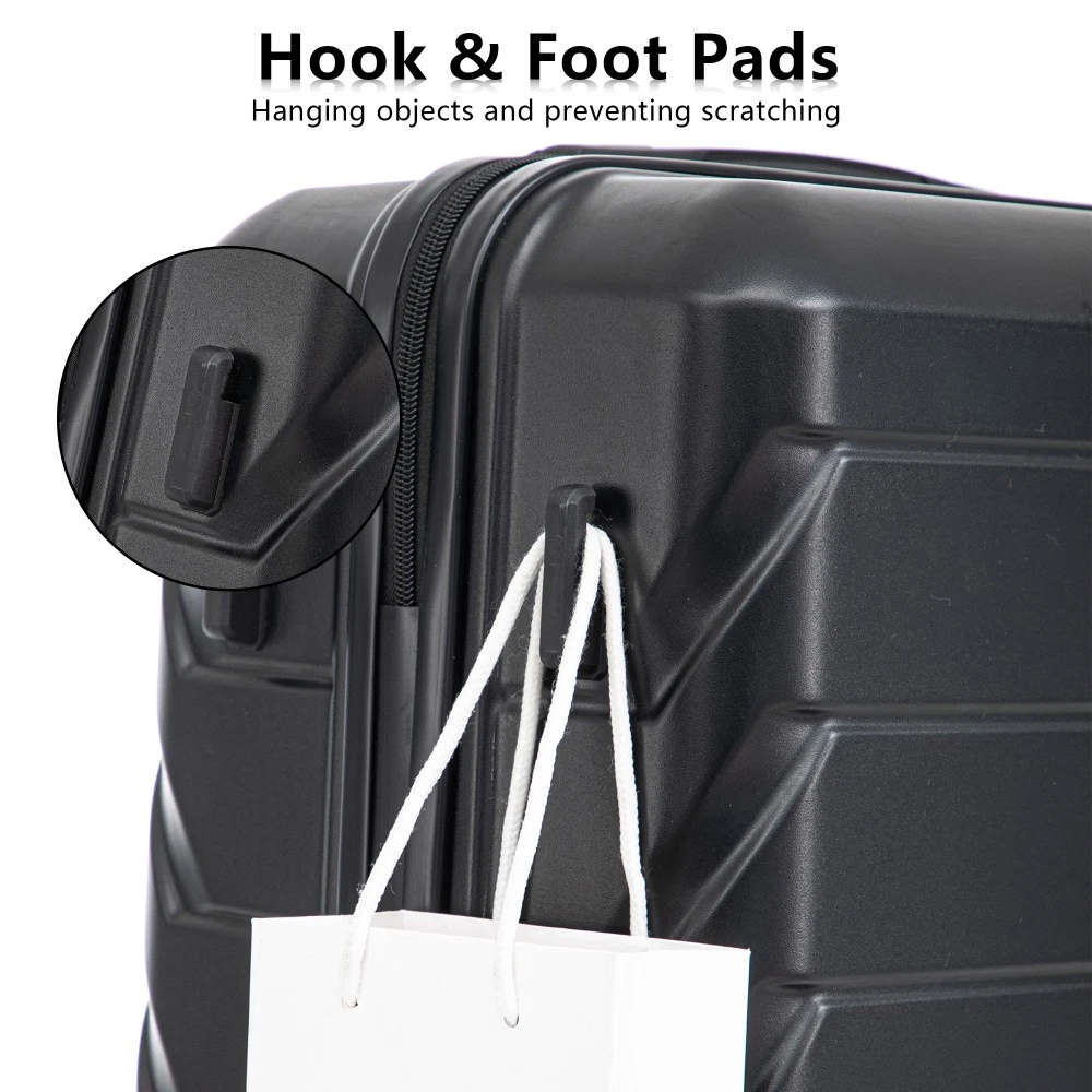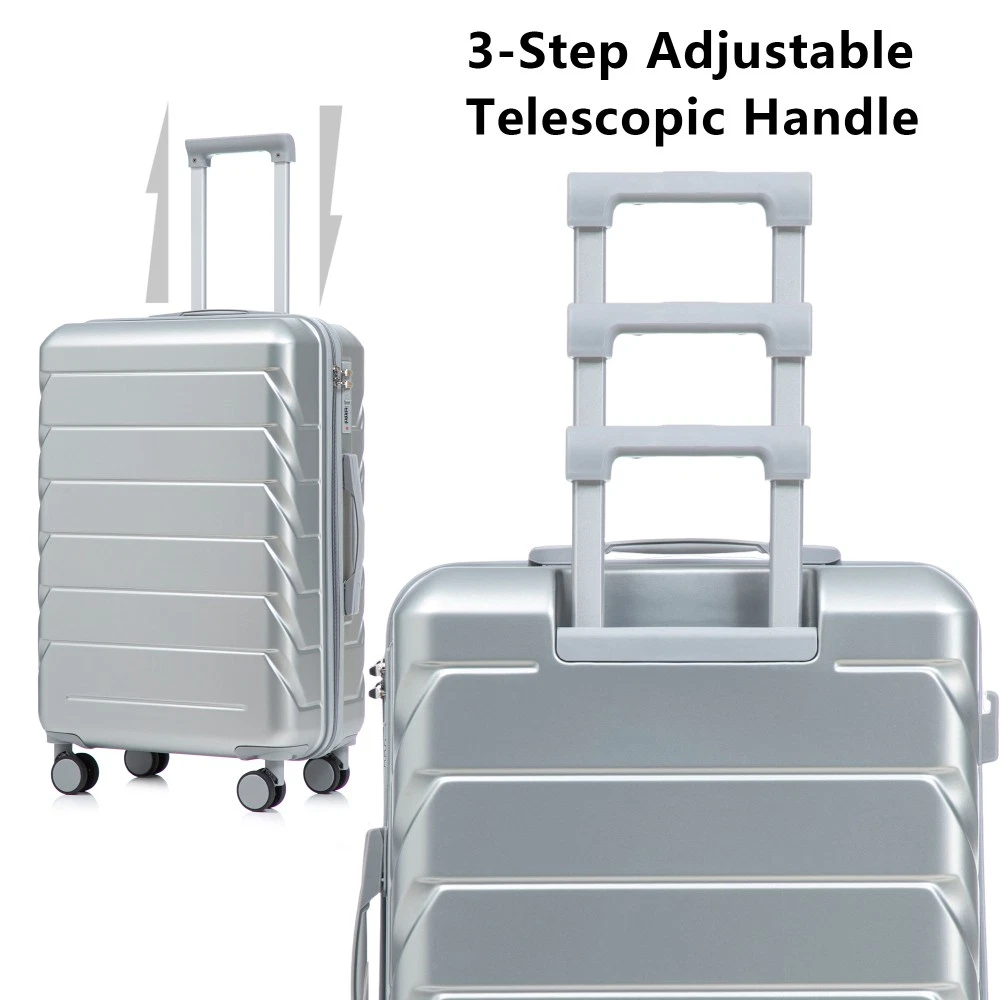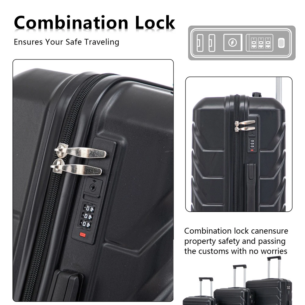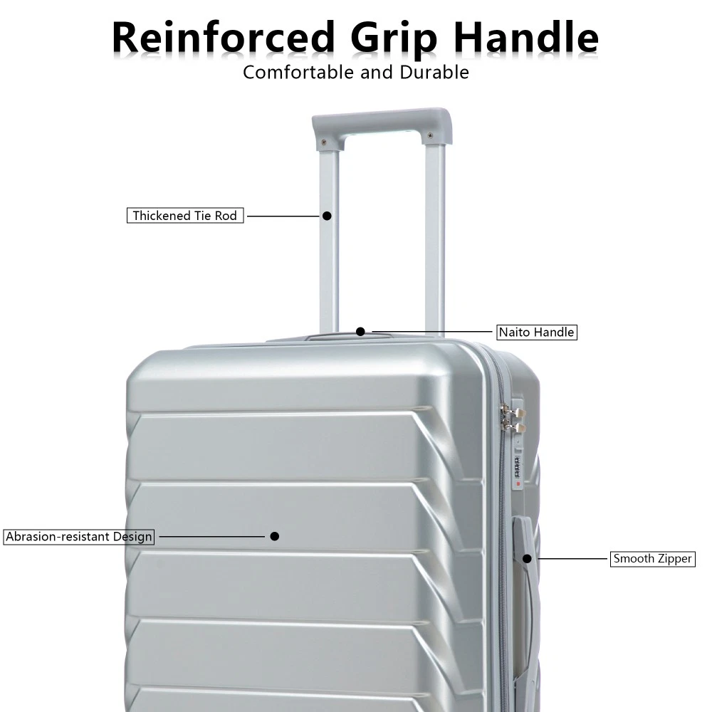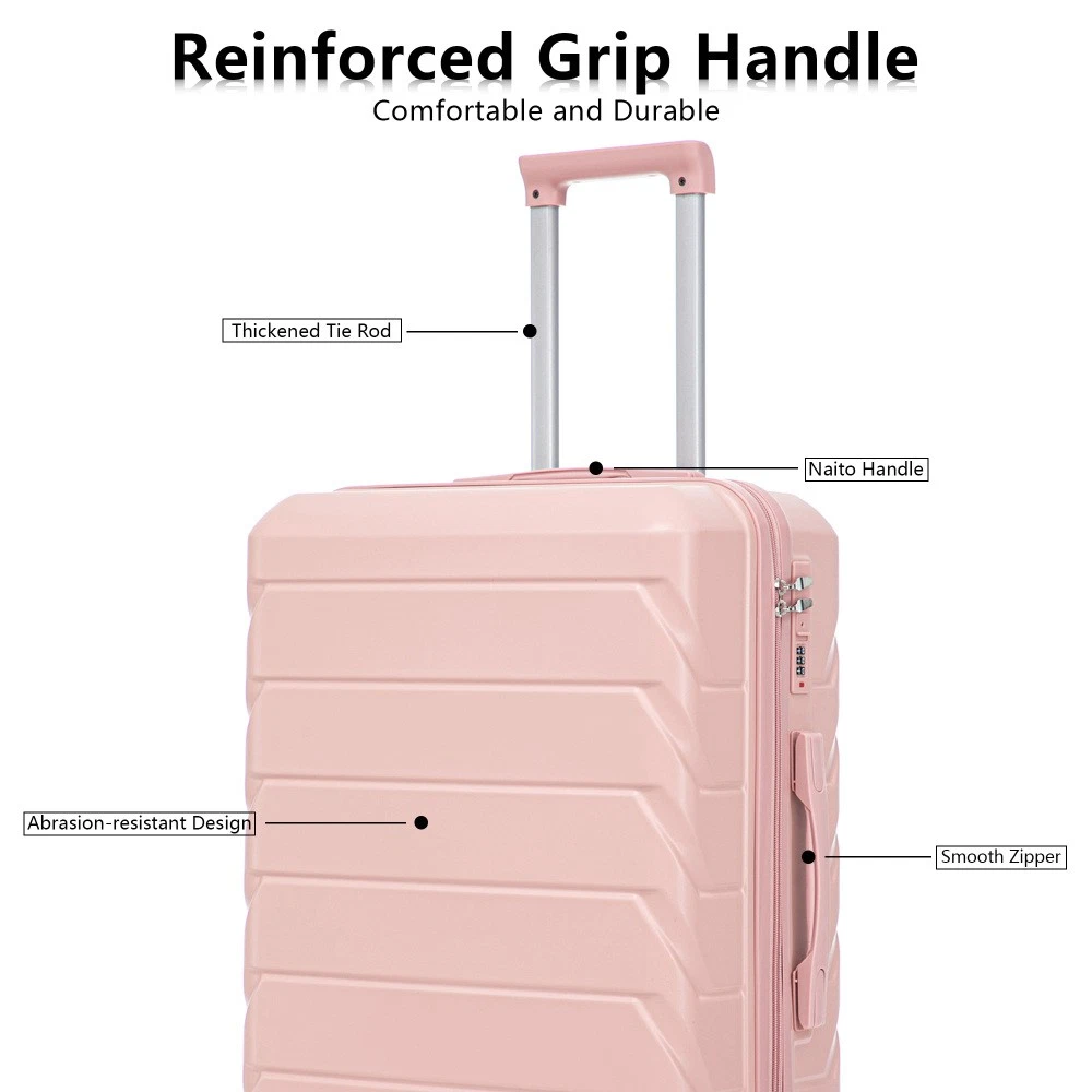 Durable & Waterproof:Our family suitcase set features sturdy watertight ABS external, which is easy to clean and long-term use. It can carry a large weight while having four swivel wheels that can move effortlessly in any direction. Full-Capacity Design Inside Suitcase: Large storage space and fully lined interior with zippered compartment for this hard side luggage sets to keep your items well organized. Low profile top and side handle provide for ease in handling. Retractable Handle:The ergonomically designed push-button 3-step adjustable telescopic handle makes opening and closing a breeze. What's more, it fits any size hand and reduces stress when climbing stairs. Modern Appearance:The stylish and smooth stripe design of the rolling luggage makes it more resistant to pressure and wear and brings a good mood to your journey. It includes four molded side feet, they allow the luggage to remain upright even when standing on its side. Retractable Handle The ergonomically designed push-button 3-step adjustable telescopic handle makes opening and closing a breeze. What's more, it fits any size hand and reduces stress when climbing stairs. Full-Capacity Design Inside Suitcase Large storage space and fully lined interior with zippered compartment for this hard side luggage sets to keep your items well organized. Low profile top and side handle provide for ease in handling. 360° DOUBLE SILENT SPINNER WHEELS 1.Silent wheel, no noise, comfortable and convenient. 2. Double row protection, strong load capacity. 3. 360° smooth and arbitrary rotation, light and convenient. Anti-scratch ABS Hard Shell Enhanced thickening Anti-scratch ABS material build; strong resistance to stress; nontoxic, odour-free, impressive resistant to low and high temperature, an innovation material in hard luggage industry. Large capacity 1.Large space, luxurious interior. 2.The fixed buckle prevents the clothes from shifting, is convenient and practical. 3.There are multiple layers of space, the clothes are layered, clean and easy to take, saving space.