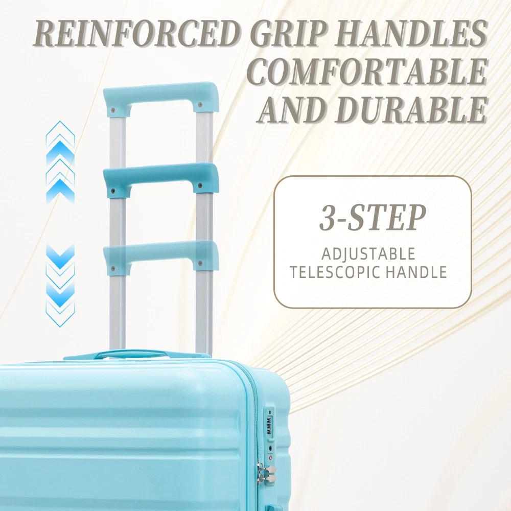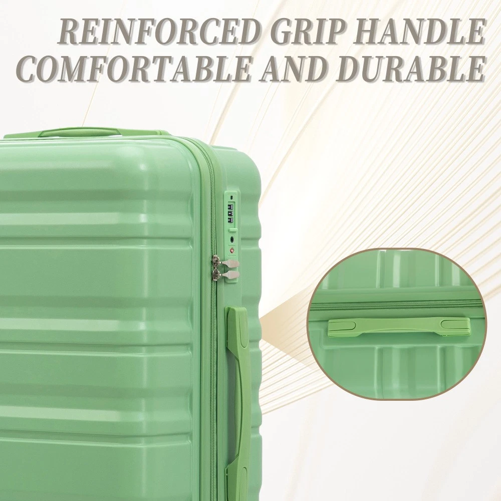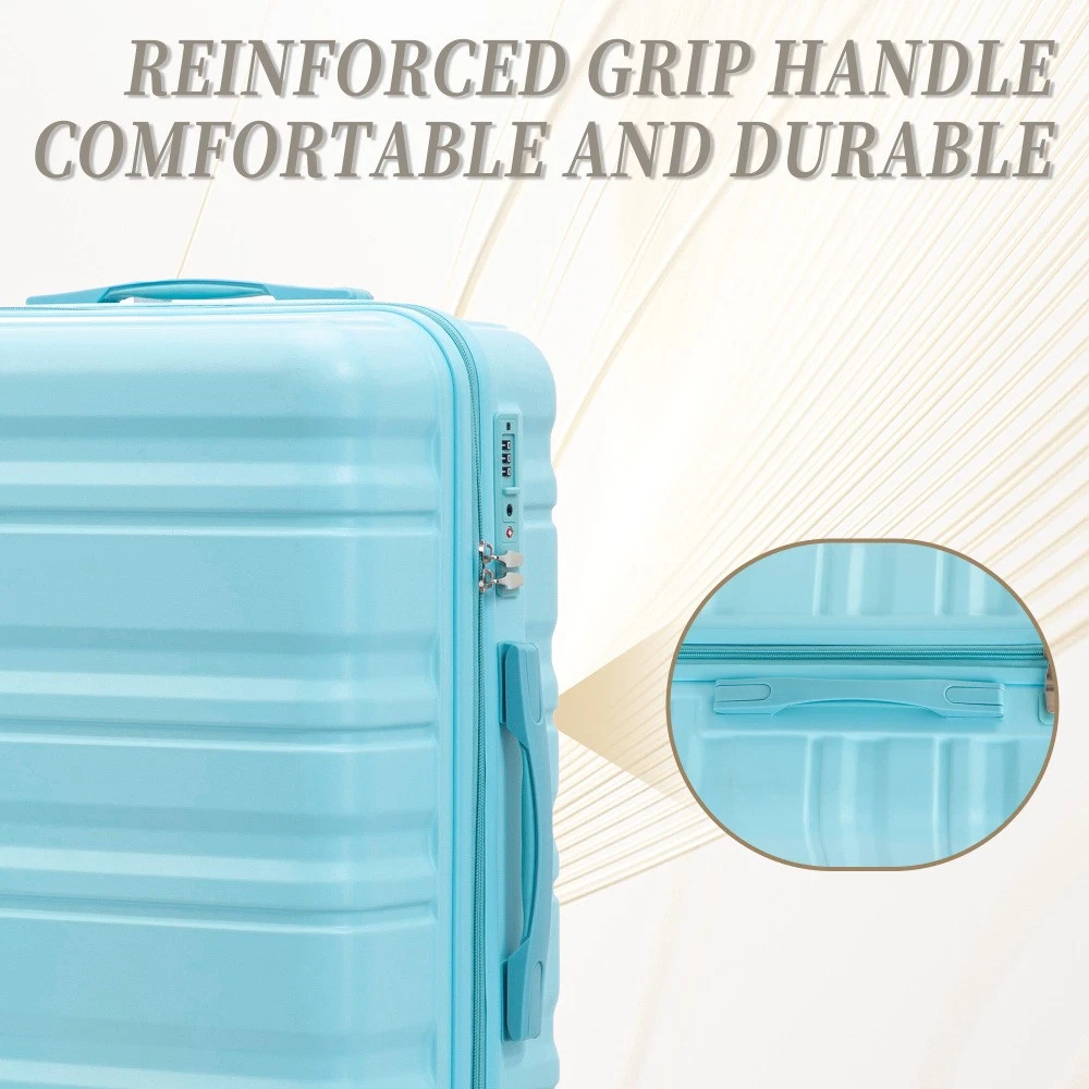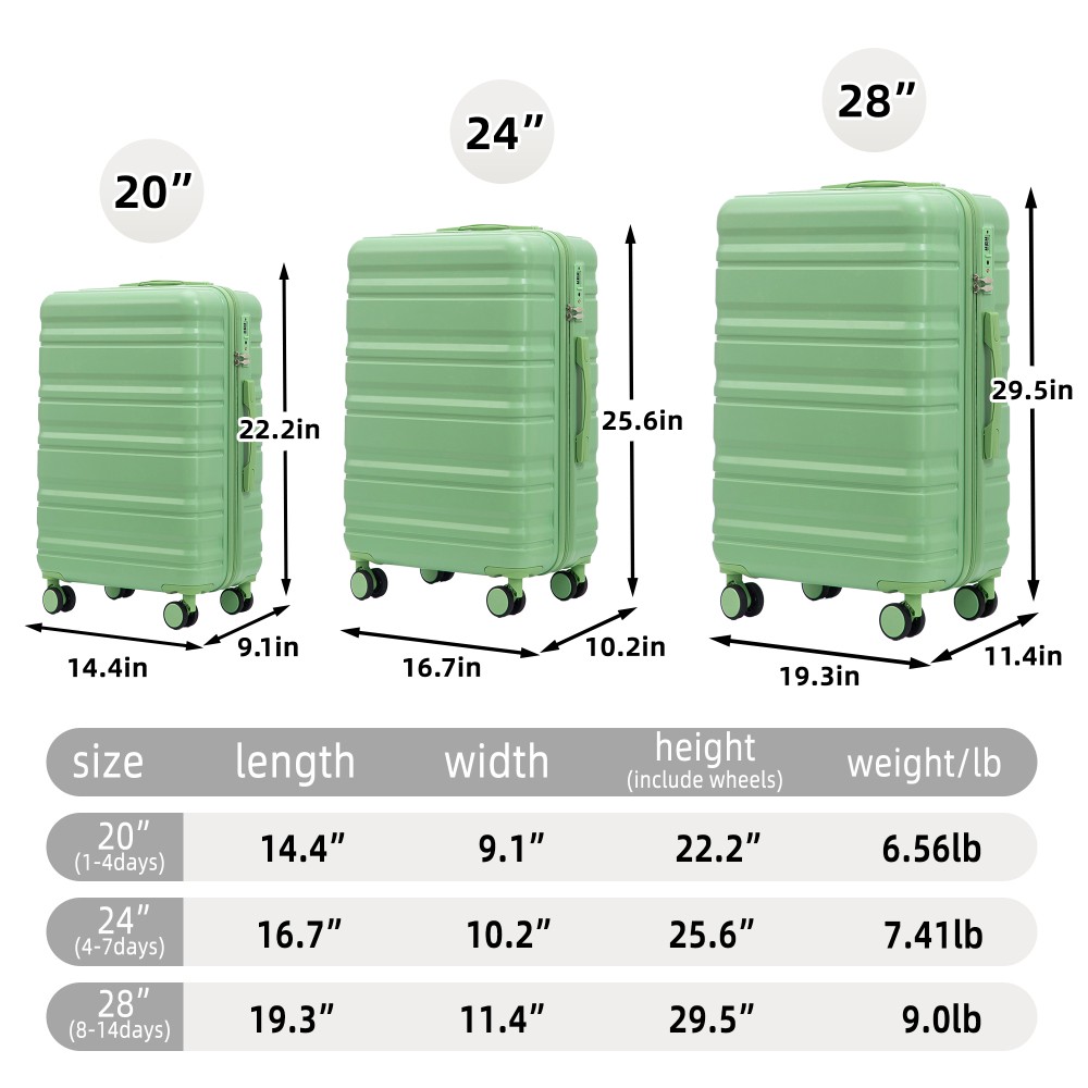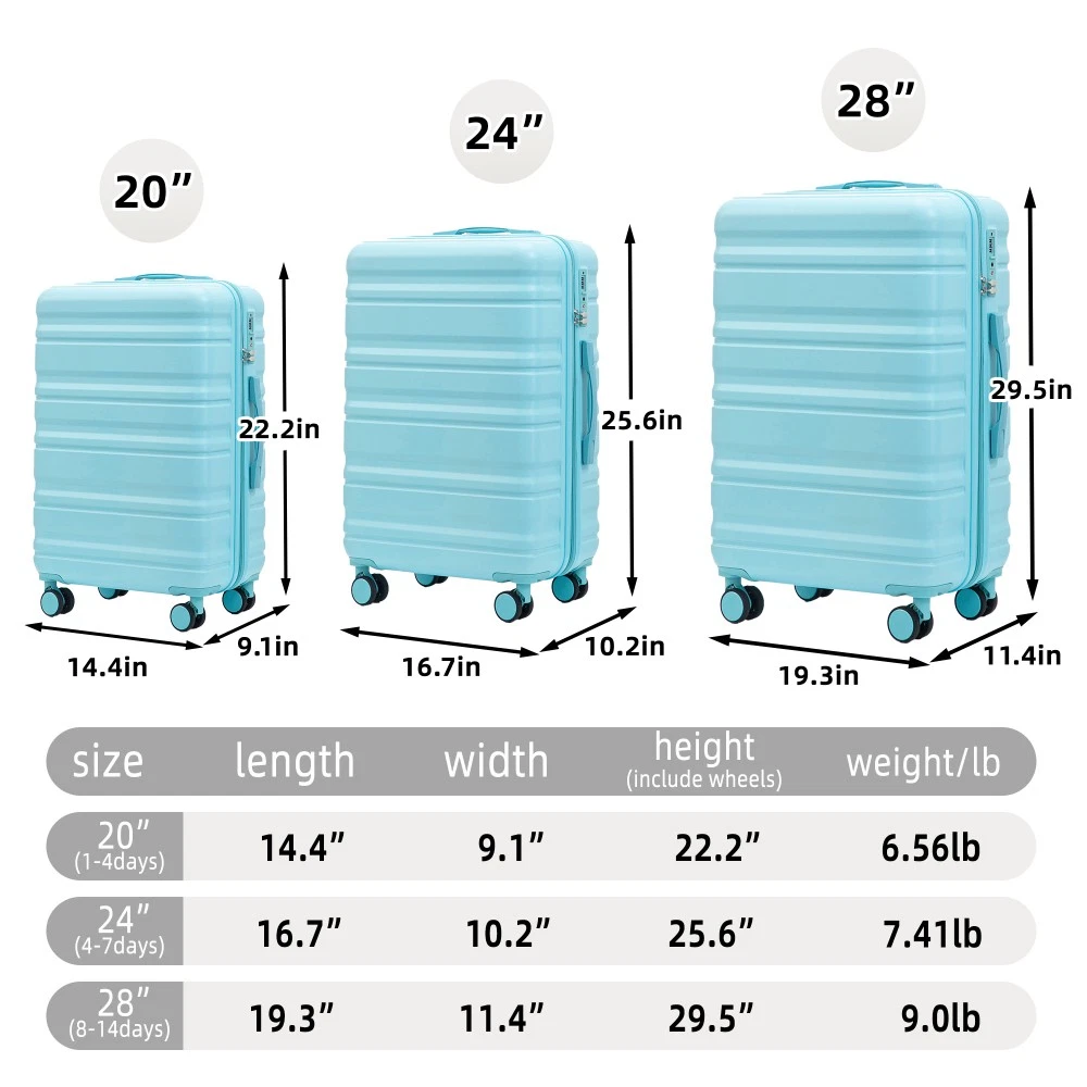 Durable & Waterproof:Our family suitcase set features sturdy watertight ABS external, which is easy to clean and long-term use. It can carry a large weight while having four swivel wheels that can move effortlessly in any direction. Full-Capacity Design Inside Suitcase: Large storage space and fully lined interior with zippered compartment for this hard side luggage sets to keep your items well organized. Low profile top and side handle provide for ease in handling. Retractable Handle:The ergonomically designed push-button 3-step adjustable telescopic handle makes opening and closing a breeze. What's more, it fits any size hand and reduces stress when climbing stairs. Modern Appearance:The stylish and smooth vertical stripe design of the rolling luggage makes it more resistant to pressure and wear and brings a good mood to your journey. It includes four molded side feet, they allow the luggage to remain upright even when standing on its side. Retractable Handle The ergonomically designed push-button 3-step adjustable telescopic handle makes opening and closing a breeze. What's more, it fits any size hand and reduces stress when climbing stairs. Full-Capacity Design Inside Suitcase Large storage space and fully lined interior with zippered compartment for this hard side luggage sets to keep your items well organized. Low profile top and side handle provide for ease in handling. 360° DOUBLE SILENT SPINNER WHEELS 1.Silent wheel, no noise, comfortable and convenient. 2. Double row protection, strong load capacity. 3. 360° smooth and arbitrary rotation, light and convenient. Anti-scratch ABS Hard Shell Enhanced thickening Anti-scratch ABS material build; strong resistance to stress; nontoxic, odour-free, impressive resistant to low and high temperature, an innovation material in hard luggage industry. Large capacity 1.Large space, luxurious interior. 2.The fixed buckle prevents the clothes from shifting, is convenient and practical. 3.There are multiple layers of space, the clothes are layered, clean and easy to take, saving space.