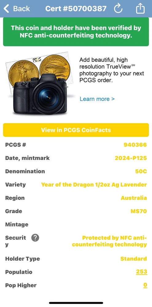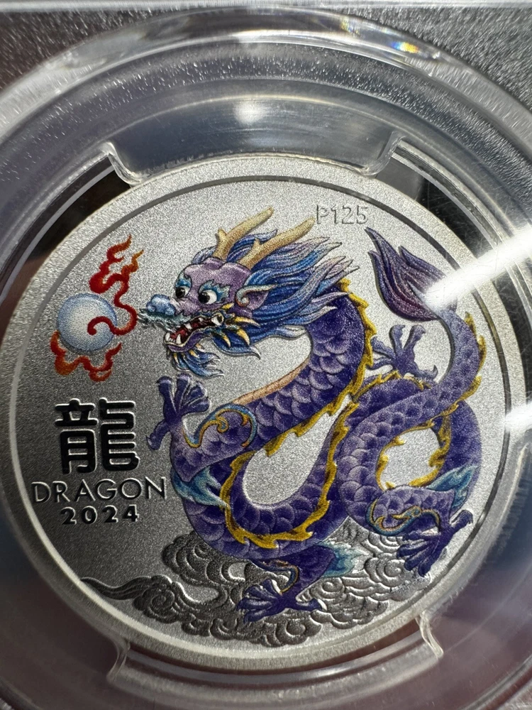 This exquisite coin from Australia's The Perth Mint features a stunning depiction of the Year of the Dragon in lavender color. Made of 1/2 oz silver with a fineness of 0.9999, this business strike type coin has been certified by PCGS and graded MS 70. The coin is a must-have for collectors and enthusiasts alike, with its beautiful design and high quality. The coin comes in a protective case with a certificate of authenticity, ensuring its value and integrity. Add this unique piece to your collection today!