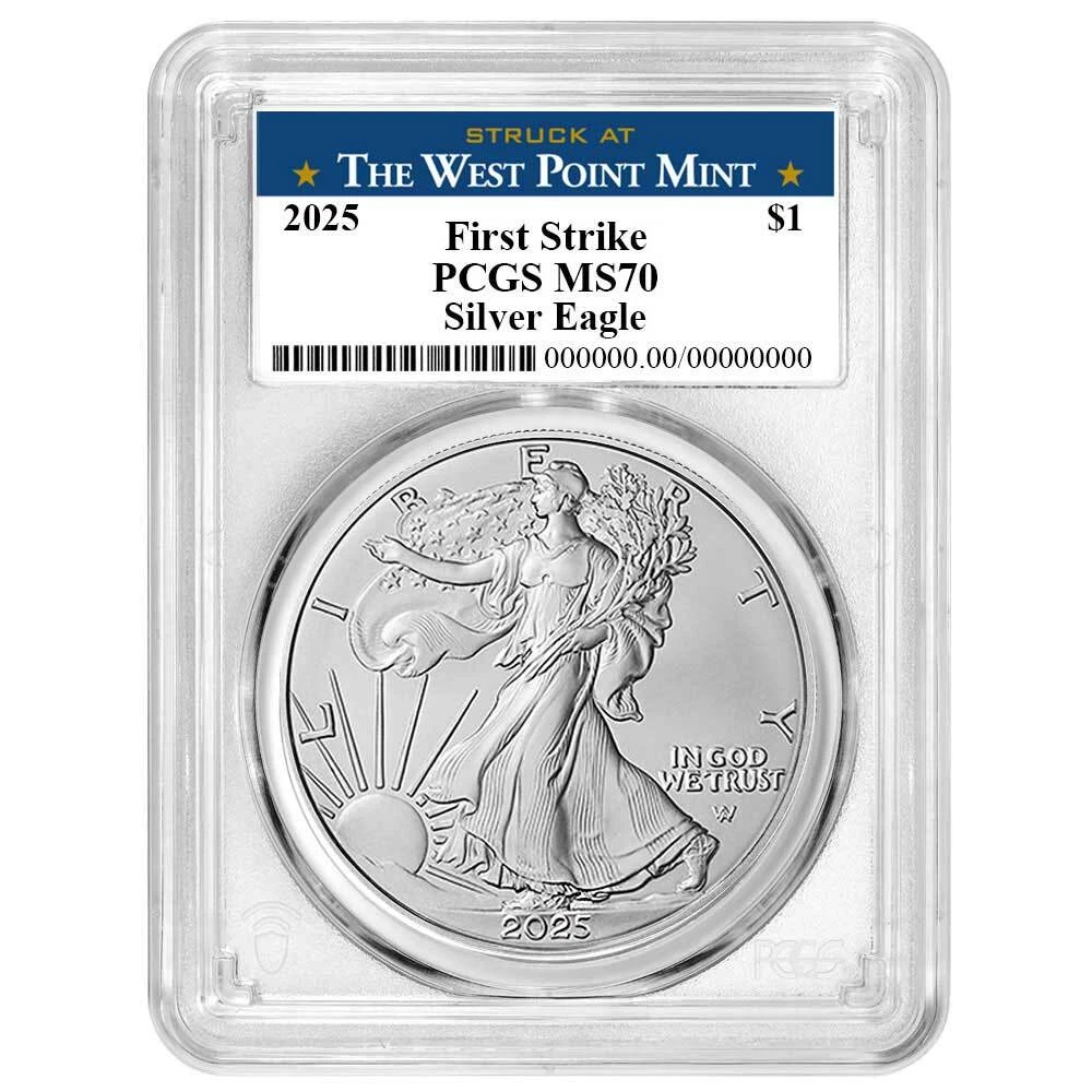 Free Shipping On All Orders Menu gold US Gold American Eagles American Buffalos Pre-33 Gold Gold Bars 1 oz Gold Bars Fractional Gold Bars Gold Rounds World Gold Coins Queen's Beast Series Canadian Maple Leafs S. African Krugerrands British Britannias Chinese Pandas Austrian Philharmonics silver US Silver American Eagles America The Beautiful 90% Silver 40% Silver Silver Rounds Silver Bars 1 oz Silver Bars 5 oz Silver Bars 10 oz Silver Bars Kilo oz Silver Bars 100 oz Silver Bars Silver Shot World Silver Queen's Beast Series Canadian Maple Leafs S. African Krugerrands British Britannias Chinese Pandas Austrian Philharmonics Mexican Libertads Australian Kangaroo's other Platinum Palladium Ancient Coins Error Coins Proof Sets Mint Sets Supplies and Publications auctions Store Categories Bullion Silver Eagles Gold Eagles Gold Buffalo Platinum Eagles First Spouse Gold Modern Commemoratives Ultra High Relief Pre-1933 U.S. Gold World Coins Error Coins Proof & Mint Sets Early U.S. Coinage Pre-33 U.S. Gold Morgan & Peace Silver $1 Dollars $1 Half Dollar 50c Quarters 25c Dime 10c Nickel 5c Small Cent 1c Supplies & Publications Original Government Packaging Ancient Coins No Reserve Auctions Other Store newsletter Add our store to your Favorites to receive our email newsletters about new items & special promotions. Sign up 2025 $1 American Silver Eagle PCGS MS70 FS West Point Label Product Description The American Silver Eagle is considered one of the most popular coins worldwide. The creation of these iconic 1 Troy oz of .999 fine silver coins was authorized through the Liberty Coin Act of 1985, and production began in 1986. Known to many as the official bullion coin of the United States, a redesign was introduced by the U.S. Mint in 2021. The original obverse design, based on Adolph A. Weinman’s 1916 “Walking Liberty” half dollar, has been updated with the help of modern technology. Now a closer reflection of Weinman’s original design, the obverse includes the addition of the traditional artist’s mark on the coin itself. As with the obverse, the reverse of the Silver Eagle also received an update in design. Before the summer of 2021, the design was that of the heraldic eagle of the United States, which was created by the former Chief Engraver of the United States Mint, John Mercanti. This design features an American bald eagle behind a heraldic shield with arrows and an olive branch in its talons. The new reverse design, also known as “Eagle Landing,” shows an eagle approaching a landing, carrying an oak branch to add to a nest. One of the U.S. Mint’s Artistic Infusion Program designers, Emily Damstra, created this new reverse design. Coin Features: 1 Troy oz .999 Silver Shipped in protective packaging Shop confidently, knowing that when you make a purchase, you are buying the best. Each coin has been carefully assessed by the Professional Coin Grading Service (PCGS) and is certified to be in near-perfect condition. To protect their condition, these items are shipped in their original PCGS certification slabs. Coins arrive in protective slabs courtesy of the PCGS Free Shipping on all orders The coin pictured is only a representation of the coin you will receive, not the exact coin (serial numbers will vary) If you have any questions or concerns, please do not hesitate to contact us. Our dedicated Customer Service team will be happy to assist you M-F from 9 am to 5 pm EST. Shipping Payment Returns About Us Shipping We offer free shipping on all of our listings! All items must be shipped directly to your registered eBay address, no exceptions. We will not ship it to an alternative or forwarding address. All of our packages are fully insured. Orders over $750.00 require Signature Confirmation. No insurance claim will be processed if the United States Postal Service or any other carrier designates the package as delivered via tracking number, regardless of circumstance. In general, we ship items using USPS First Class Mail or FedEx Ground. Other methods may be used depending on circumstance. eBay will post an estimated shipping time as soon as shipping information is uploaded to an order. This time frame is only an estimate, not a guarantee. Please be sure to verify that your order is correct prior to submitting payment. Once an order is placed it can only be canceled not adjusted. Orders are processed quickly and once they are moved to our shipping department an order can no longer be canceled, it would have to be returned (all returns are subject to restocking fees). Disclaimer: Once the item has left our facilities, it is under the control of the third party shipping service. We always do our best to provide our customers with speedy service; however some things are out of our control. There is always the possibility for a delay due to these third party services or the possibility of a product becoming damaged or lost in transit. The simple fact is, all of the above-described scenarios are unacceptable to us and we will never put this burden on our customers. If anything happens to a product in transit, we will always be willing to replace the product. Customer satisfaction is our number one priority and we do whatever we can to accommodate you. Pinehurst Coins will not accept purchases for any item that is mispriced due to technical issues, regardless if those issues are caused by eBay's system or our own. All mispriced orders will be canceled and your money will be completely refunded immediately. Payment For large orders with customers that we do not have a previously established business relationship, a wire may be necessary. This will be determined at the discretion of Pinehurst Coins. Payment is due at the time of checkout, no exceptions. We do not offer discounts unless it is otherwise posted on our listing. Some listing will provide you with a bulk purchase discount. Please see individual listings for details. Placing an order locks in your price. We do not offer price adjust
