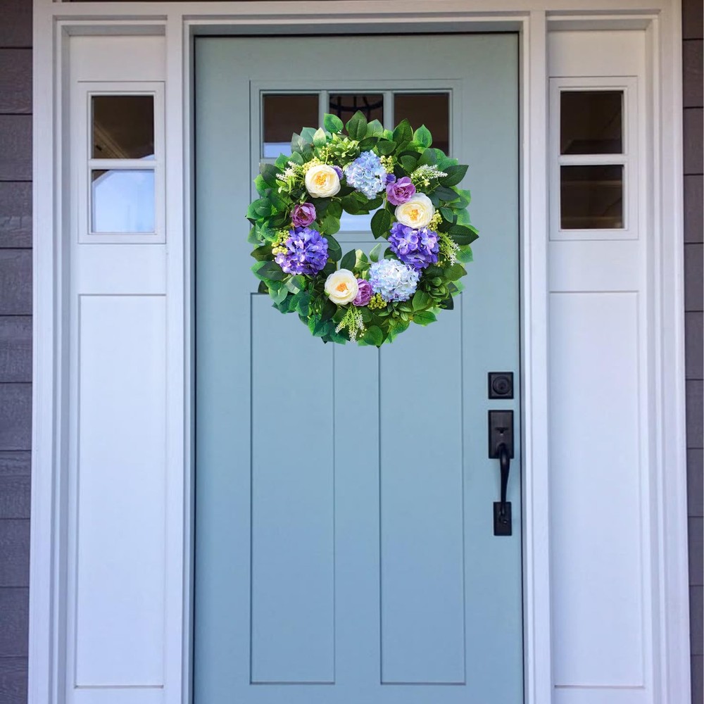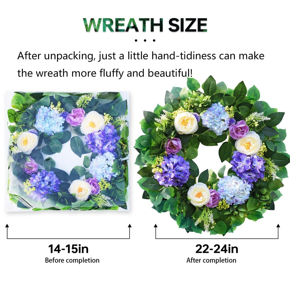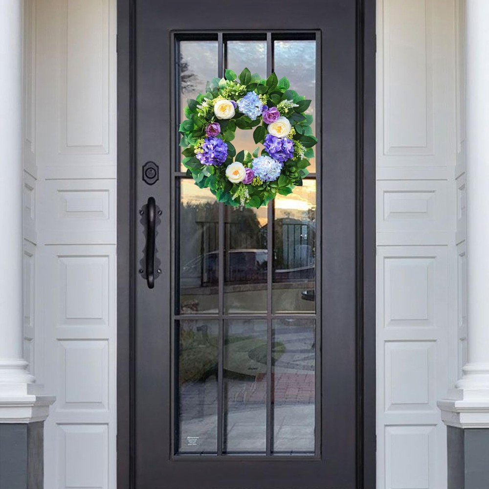 earching for that one-of-a-kind piece to transform your front door or entryway into a welcoming haven? Our exquisite blue hydrangea wreath is the ultimate answer. This isn't just any floral wreath; it's a modern summer wreath that seamlessly combines style and elegance, making it a must-have for both spring and summer. Our artificial spring and summer wreath is a masterpiece crafted with top-notch materials. Measuring a generous 24 inches in outer diameter, this large summer wreath for the front door commands attention and becomes an instant conversation starter. The vivid blue hue of the hydrangeas is like a breath of fresh air, adding a touch of coolness and charm to your home. Whether you're aiming to spruce up your front door with a door wreath for all seasons or specifically seeking a stunning spring wreath for the front door or eye-catching summer wreaths, this door wreath for spring and summer fits the bill perfectly. It's versatile enough to be displayed both indoors and outdoors. When used as a summer wreath outdoor, just make sure it's placed under some shelter to shield it from harsh weather conditions. This handmade floral wreath features meticulously crafted blue hydrangeas that look so lifelike, you'd be hard-pressed to tell it's artificial. It's a wonderful addition to various settings, be it your cozy living room, inviting porch, or as a show-stopping centerpiece for a party or a romantic wedding. And it makes for an excellent gift for holidays, festivals, or special moments like anniversaries. Our spring blue wreath is captured in actual photos, and we've spared no effort to present its true color to our customers. However, due to differences in shooting lights and screen displays, a slight color variation might be inevitable. Product Specification: Materials: Premium artificial materials, natural grapevine Size: Outer diameter: 24 inches Color: Blue Application: Front door, window, indoors, outdoors, living room, porch, centerpiece for parties, weddings, holiday and festival celebrations Features: Unlike real wreaths that wither away, this artificial blue hydrangea wreath boasts a significantly longer lifespan. Its shape and color will stay vibrant and fresh for years to come, eliminating the need for watering or exposure to sunlight. Handmade with love and attention to detail, it serves as a unique and heartfelt gift option for a wide range of occasions. Thanks to its special design, created through a combination of materials and a fully manual process, the wreath has an incredibly natural look, just like a freshly picked floral wreath. Warm Notice: All our images are actual shots, and we're committed to showing you the wreath's true color. Still, slight color differences may arise due to shooting circumstances and screen variations. Package Included: 1×Blue hydrangea wreath neatly packed in a box This is the perfect summer wreath for your front door or any space where you want to infuse a bit of natural splendor. Don't miss out! Order your blue hydrangea wreath today and give your home the upgrade it deserves with this beautiful floral wreath. Perfect Spring & Summer Wreath: Designed to bring a cheerful touch of seasonal charm to your home, this 24" spring and summer wreath features ombre blue and purple hydrangeas, crisp white peonies, delicate berries, and lush eucalyptus leaves, making this front door wreath a perfect addition to any decor. Perfect for a spring wreaths, summer wreath, or year round wreath Sturdy and Durable: This front door wreath is handmade with durable, windproof and rainproof materials mounted on a durable grapevine base. Unique craftsmanship, perfect color matching, reliable quality, and can withstand various harsh weather conditions. It is very suitable for use as front door four seasons wreath or year round wreath Versatile and Stylish Spring and Summer Wreath: Spring wreath hydrangea is perfect for both indoor and outdoor use, whether displayed on your front door,farmhouse home wall,kitchen, living room, window, fireplace, porch, or as part of your wedding decorations, Easter, Mother's Day, Valentine's Day, St. Patrick's Day, birthdays, housewarming or garden parties easy to adjust: To prevent the front door wreath from being damaged during transportation, the large summer Wreath is tightly packed in a sturdy 14-inch box. Therefore, before hanging, only simple adjustment is needed to make it reach 24 inches, making the wreath fuller and more beautiful Perfect gift choice: The wreath is colorful and perfectly shaped, making your home stand out in the neighborhood, this hydrangea wreath is an ideal gift for family, friends, or anyone who likes to add festive decorations to their home Excellent : The wreath decoration does not require special cleaning, just wipe it with a dry cloth to keep it clean. If you have any questions during use, we will give you a satisfactory answer at the first time