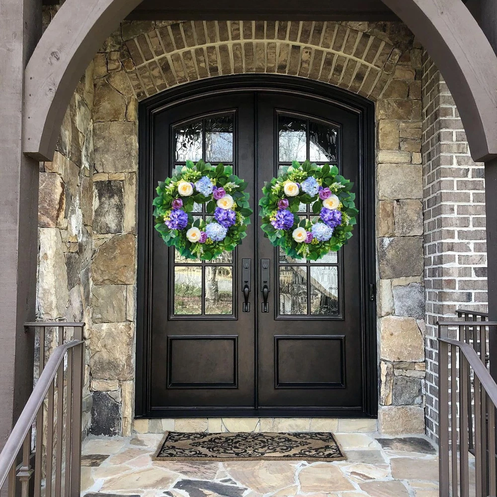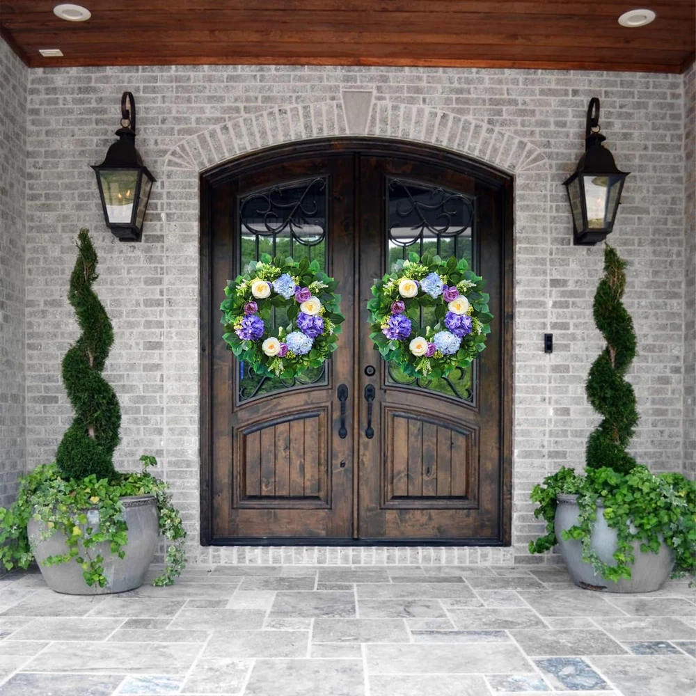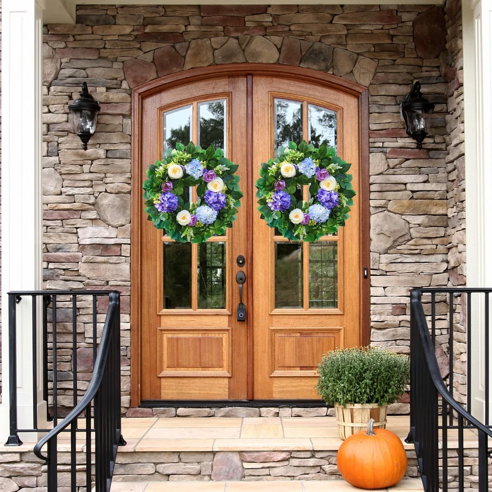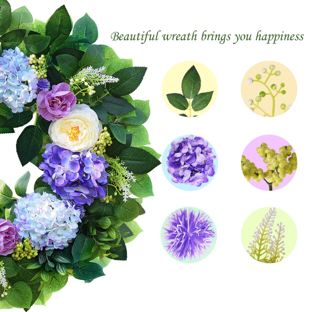 earching for that one-of-a-kind piece to transform your front door or entryway into a welcoming haven? Our exquisite blue hydrangea wreath is the ultimate answer. This isn't just any floral wreath; it's a modern summer wreath that seamlessly combines style and elegance, making it a must-have for both spring and summer. Our artificial spring and summer wreath is a masterpiece crafted with top-notch materials. Measuring a generous 24 inches in outer diameter, this large summer wreath for the front door commands attention and becomes an instant conversation starter. The vivid blue hue of the hydrangeas is like a breath of fresh air, adding a touch of coolness and charm to your home. Whether you're aiming to spruce up your front door with a door wreath for all seasons or specifically seeking a stunning spring wreath for the front door or eye-catching summer wreaths, this door wreath for spring and summer fits the bill perfectly. It's versatile enough to be displayed both indoors and outdoors. When used as a summer wreath outdoor, just make sure it's placed under some shelter to shield it from harsh weather conditions. This handmade floral wreath features meticulously crafted blue hydrangeas that look so lifelike, you'd be hard-pressed to tell it's artificial. It's a wonderful addition to various settings, be it your cozy living room, inviting porch, or as a show-stopping centerpiece for a party or a romantic wedding. And it makes for an excellent gift for holidays, festivals, or special moments like anniversaries. Our spring blue wreath is captured in actual photos, and we've spared no effort to present its true color to our customers. However, due to differences in shooting lights and screen displays, a slight color variation might be inevitable. Product Specification: Materials: Premium artificial materials, natural grapevine Size: Outer diameter: 24 inches Color: Blue Application: Front door, window, indoors, outdoors, living room, porch, centerpiece for parties, weddings, holiday and festival celebrations Features: Unlike real wreaths that wither away, this artificial blue hydrangea wreath boasts a significantly longer lifespan. Its shape and color will stay vibrant and fresh for years to come, eliminating the need for watering or exposure to sunlight. Handmade with love and attention to detail, it serves as a unique and heartfelt gift option for a wide range of occasions. Thanks to its special design, created through a combination of materials and a fully manual process, the wreath has an incredibly natural look, just like a freshly picked floral wreath. Warm Notice: All our images are actual shots, and we're committed to showing you the wreath's true color. Still, slight color differences may arise due to shooting circumstances and screen variations. Package Included: 1×Blue hydrangea wreath neatly packed in a box This is the perfect summer wreath for your front door or any space where you want to infuse a bit of natural splendor. Don't miss out! Order your blue hydrangea wreath today and give your home the upgrade it deserves with this beautiful floral wreath. Perfect Spring & Summer Wreath: Designed to bring a cheerful touch of seasonal charm to your home, this 24" spring and summer wreath features ombre blue and purple hydrangeas, crisp white peonies, delicate berries, and lush eucalyptus leaves, making this front door wreath a perfect addition to any decor. Perfect for a spring wreaths, summer wreath, or year round wreath Sturdy and Durable: This front door wreath is handmade with durable, windproof and rainproof materials mounted on a durable grapevine base. Unique craftsmanship, perfect color matching, reliable quality, and can withstand various harsh weather conditions. It is very suitable for use as front door four seasons wreath or year round wreath Versatile and Stylish Spring and Summer Wreath: Spring wreath hydrangea is perfect for both indoor and outdoor use, whether displayed on your front door,farmhouse home wall,kitchen, living room, window, fireplace, porch, or as part of your wedding decorations, Easter, Mother's Day, Valentine's Day, St. Patrick's Day, birthdays, housewarming or garden parties easy to adjust: To prevent the front door wreath from being damaged during transportation, the large summer Wreath is tightly packed in a sturdy 14-inch box. Therefore, before hanging, only simple adjustment is needed to make it reach 24 inches, making the wreath fuller and more beautiful Perfect gift choice: The wreath is colorful and perfectly shaped, making your home stand out in the neighborhood, this hydrangea wreath is an ideal gift for family, friends, or anyone who likes to add festive decorations to their home Excellent : The wreath decoration does not require special cleaning, just wipe it with a dry cloth to keep it clean. If you have any questions during use, we will give you a satisfactory answer at the first time