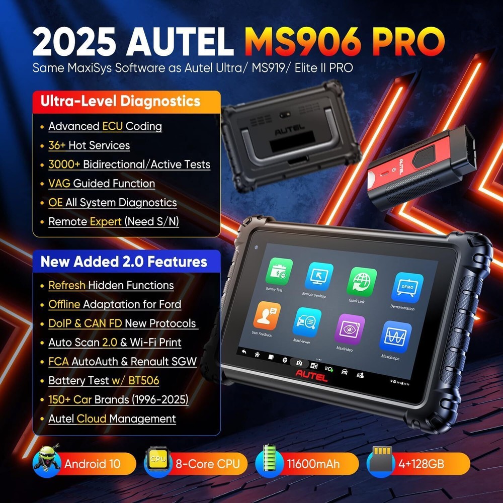 2025 Newest Autel MaxiSys MS906 Pro C0ding Full System Diagnostic Scanner Tool Autel MaxiSYS MS906 PRO, 2025 MS906PRO 2.0 Same as MS906 MAX Newer of MP900BT MK908, ECU Coding, Bidirectional & 3000+ Test, 36+ Service, CAN FD & DOIP, VAG Guide, FCA SGW, 10.0 OS, Auto Scan 2.0 🚘Free Gift:MV108S*1 About this item: 🏆【2025 Autel Flagship MS906 PRO, Same MaxiSYS Software as Autel Ultra/ MS919/ MS909】 As 2025 upgraded ver. of Elite2 MK908 MS908S PRO MS906 MS906BT MP900BT MK900BT MS900TS, MaxiSys MS906 PRO takes a big leap in hardware & software. 10X Faster diagnostic speed: 🚀Android 10.0 OS, Octa-Core CPU, 116000mAh Battery, 8in 1920*1200, 4+128GB Memory, 5G&2.4G WIFI, 16MP&5MP Camera, etc. Top-notch features: ✅Smith-level ECU Coding/Adaption; ✅3000+ Active Tests; ✅36+Reset Service; ✅DoIP & CAN FD; ✅VAG Guide; ✅Pre & Post Scan; ✅WiFi Print;👍What's more, with the 2025 newest Auto Scan 2.0 technology, MS906 PRO realizes scanning in seconds, such as GM<8s, B.ENZ<40s, BMW/VAG/Ford <10s, etc. 🏆【Enhanced ECU Coding, Same as MSUltra/ MS919/ MS909/ Elite II Pro/ MS908S PRO/ MK908 II】 As Autel most popular flagship scanner, MS906 Pro diagnostic scan tool comes with advanced functions, but at half the cost! ECU coding enables you to 👏Improve car performance, 👏Change dislike settings, 👏Active higher-level features to customize your cars as you like,👏You can also match/c.ode/relearn/ the blank modules to the on-board systems after replacement, etc. 👏Moreover, MS906PRO escaner automotriz supports Online coding for BMW F/E chassis, for Porsche&VW, and offline adaption for Ford.🚦Note: ECU Coding is not universal, pls send us your VIN# to check compatibility first. 🏆【3000+ Full Bi-directional Control/ Active Tests & 36+ Hot Services】 Autel MS906Pro automotive scanner can a.ctuate solenoids and a.ctuators for active testing, and send commands to many systems/ components to test their working status and pinpoint problems in seconds without using the vehicle controls, saving you tons of time! Besides, 36+ hot reset services meet your daily maintenance demands, such as Oil Reset, EPB, BMS, ABS Brake Bleed, Injector Coding, SAS, Suspension, Throttle, Power Balance, etc. Services vary from car, please send us your car VIN# to help you check compatibility first. 🏆【OE-Level All System Diagnostics, BT Connection for 15,000+ Vehicles】 Autel scanner MS906 PRO can perform OE level comprehensive diagnostics on 15,000+ U.S., Asian, and European models, up to 2024 & 2025 newest cars. More stable, faster, and no limitations! Adopting 2025 advanced German Wireless Technology, MaxiSYS MS906 PRO comes with an enhanced BT interface VCI200 for remote diagnosis, unlike the outdated wired code readers such as MaxiCOM MK808S/ MX808S/ MX900/ MK900/ MP808/ MS906/ MK908/ curled up on the steering wheel only with a short 1m cable. Welcome to reach us for compatibility before ordering. 🔥🔥【CAN FD/ DoIP Protocols & FCA AutoAuth】 Same as MaxiSys Ultra MS919 MS909 MS908S Pro II, Autel MS906 Pro also supports the latest CAN FD/ DoIP protocols, which can perfectly work for GM vehicles after 2020, for BMW F G Chassis models, for Jaguar & for Land Rover cars after 2017, for Volvo after 2018. Besides, via the function of FCA AutoAuth & Renault SGW, MS906 PRO can directly perform full diagnosis & reset services on FCA cars after 2017 & Renault newest vehicles with SGW. No need for extra 12+8 adapters! 📢📢【2025 Superfast Auto Scan 2.0 & 10+ High-end Functions】 Superior to old Autel MK908 MS906 MS906BT MK906BT, MaxiSys MS906Pro launched 10+ NEW features, win you more business, e.g. 🟢Auto Scan in seconds (Newest 2.0 Ver.), 3X f.aster than competitors: GM<8s, BMW/Ford/VAG/Chrysler<10s, etc. 🟢Scan VIN/ License 🟢Pre & Post Scan 🟢Component Matching 🟢WiFi Print (same as Autel Ultra MS919 MS909, no need a PC) 🟢VAG Guided Function 🟢Power Balance 🟢Flash Hidden Features 🟢Battery Tests w/ BT506 🟢Endoscope with Autel MV108S MV105 Digital Camera. More functions are waiting for you to experience! 🏆【Battery Test with BT506 & Report to Autel CLOUD】 Compared with Autel MaxiCOM MK808, MP808, MS906, MK906BT, MS906BT, MaxiSys MS906Pro supports more expansion functions, compatible with more maintenance aids: BT506 battery tester, MV108 camera, Oscilloscope, etc. Besides, MaxiSys MS906 Pro supports Autel Cloud Service, including Remote Expert Service (Need your S/N), One-click Help, and Device & Report Management, which can update diagnostic reports to Autel Cloud Service and share them with your customers anytime anywhere. 🏆【15,000+ Car Coverage & NO IP Restrictions & Reliable After-sale Service】 Since its release, we've won great favor from customers worldwide. Autel Wireless scanner MS906Pro supports OBD1 & OBD2 compliant vehicles, covering 15,000+ without IP Restriction. We are available 24/7/365 to support you and offer the following: 12-month f-ree updates, a 1-year brand w-arranty, life-time professional tech support, 30-day full re-fund & re-placement policy. 🚦Note: MS906pro ONLY supports English. 📢 If you have any questions, please reach out seller for assistance. 2025 Autel Scanner MS906 PRO, Same as Elite II PRO/ MK908 Pro II, Up of MP900BT Autel MaxiSys MS906 Pro Specifications: Operating System: Android 10.0 Processor: Samsung Exynos 8 Core(4*M2 2.3G + 4*A53 1.7G) Memory: 4/128GB Display: 8.0" LED capacitive touch screen with 1920x1200 resolution Connectivity: • Wi-Fi (802.11 b/g/n)USB: 2.0, Mini USB 2.0 Wireless BT V2.1+EDR Class1, HDMI 1.4a SD Card (support up to 32 GB) Camera (rear): Front: 5 Megapixel Rear: 16 Megapixel Sensors; Gravity Accelerometer, Ambient Light Sensor (ALS) Audio Input/Output: • Microphone • Single Speaker • 3-Band 3.5 mm stereo/standard headset jack Power and Battery: 11 600 mAh 3.7 V lithium-polymer battery Charging via 12 V AC/DC power supply Input Voltage: 12 V (9-35 V) Power Consumption: