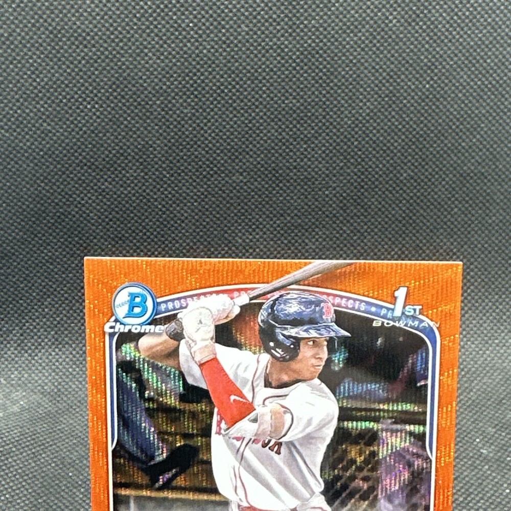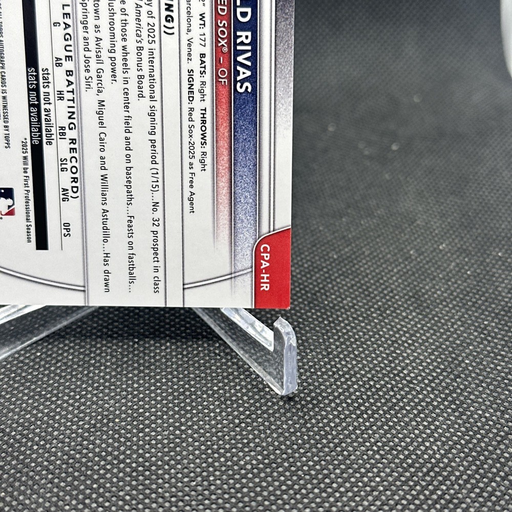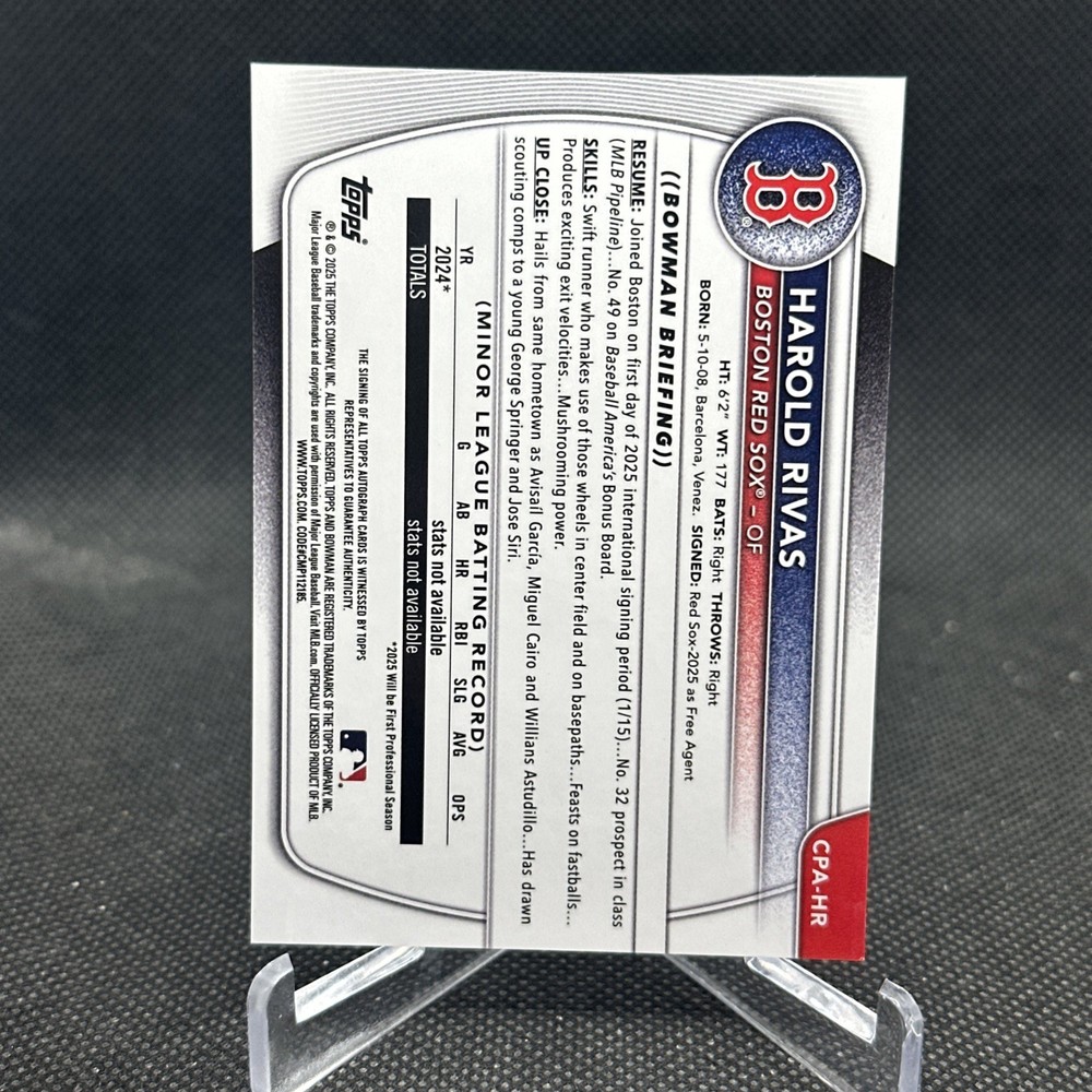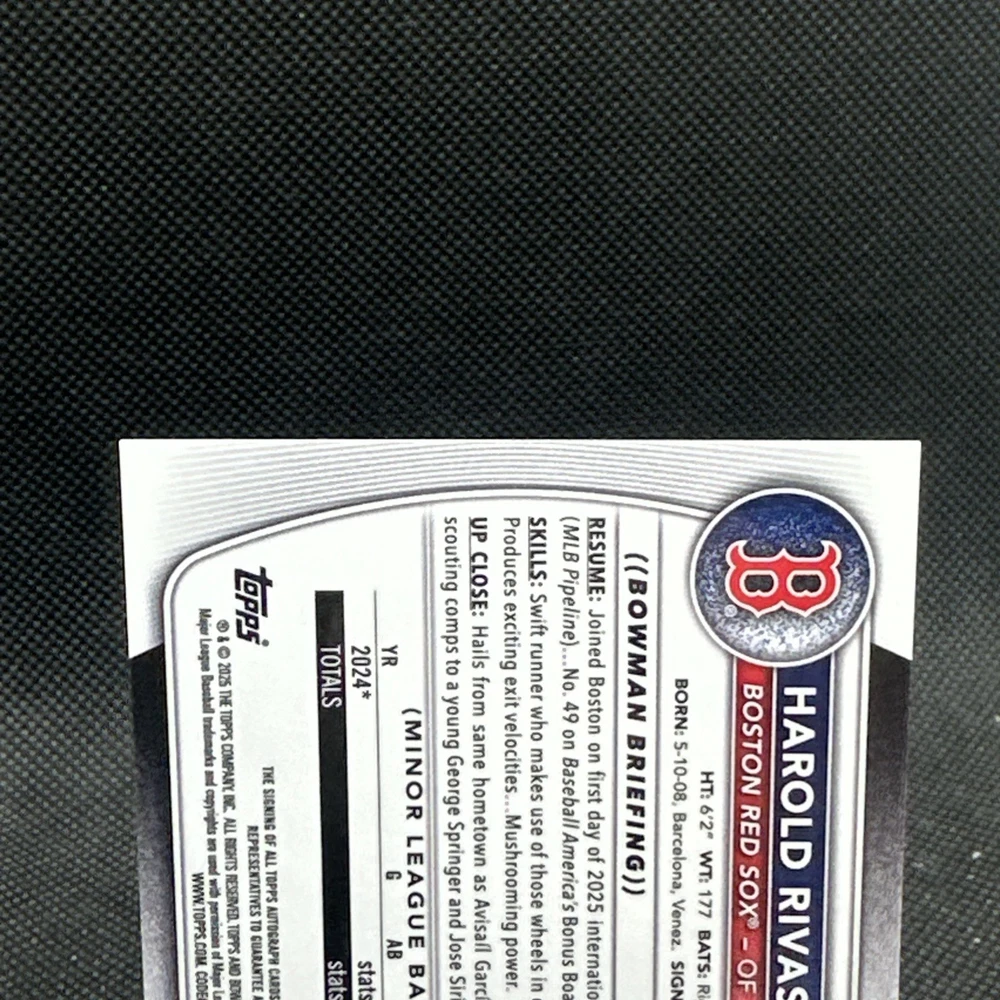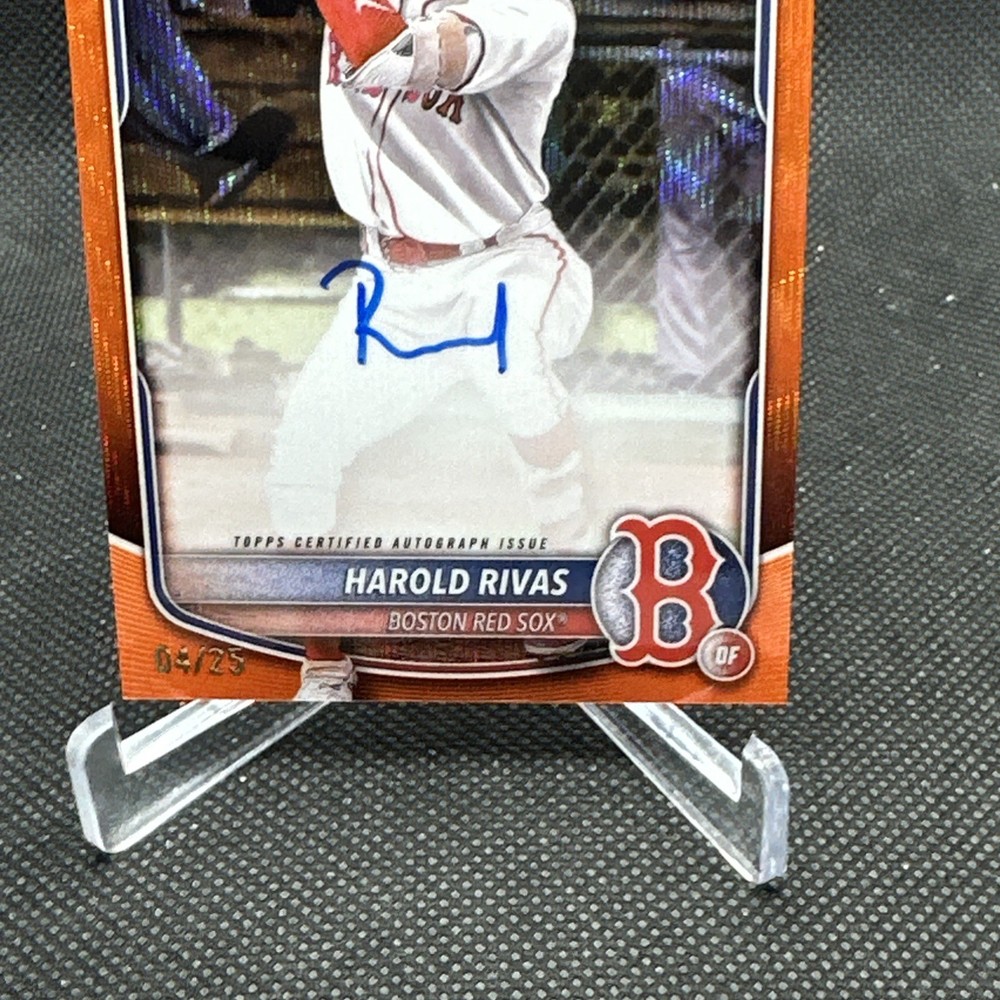 2025 Bowman Chrome HAROLD RIVAS 1ST CHROME Auto Orange Wave Refractor #'d /25 PLEASE NOTE - See pictures for card condition. The card has a dinged corner with whitening visible on the back right corner as shown in the pictures.