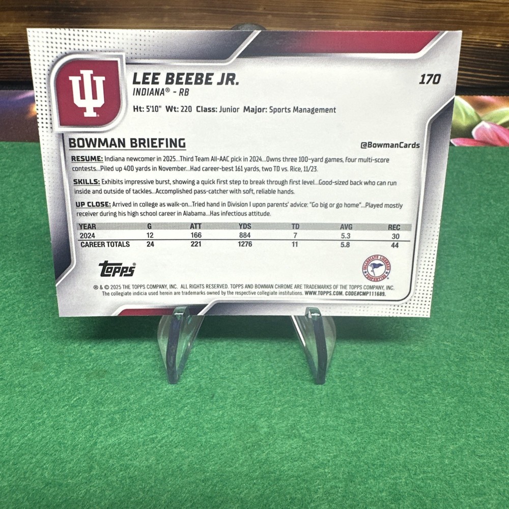 The product is a 2025 Bowman Chrome University Football trading card featuring Lee Beebe Jr., a football player from Indiana. This original card is part of the National Collegiate Athletic Association (NCAA) league and is manufactured by Topps. The card is a Chrome parallel variety in standard size, with no autograph included. It is designed for English-speaking audiences in the United States, with the card number 170 and representing the 2026 season. This trading card is a valuable collectible for fans and collectors of football memorabilia.