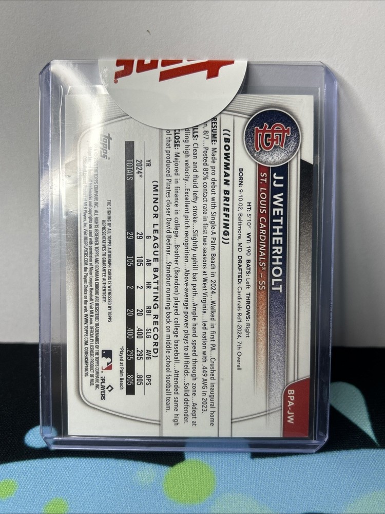 The product is a 2025 Bowman JJ Wetherholt 1st Green Auto trading card featuring the Cardinals prospect. This autographed card is limited to a print run of 99 and is made of high-quality card stock. Signed by the player himself, this original card is a valuable collectible for baseball fans and collectors alike. The card is part of the MLB World Series set and is a great addition to any sports memorabilia collection.