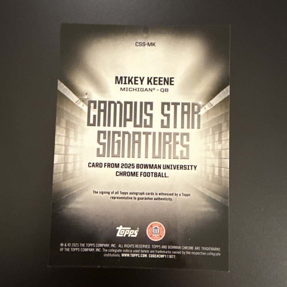 The product is a 2025 Bowman Chrome Mikey Keene Campus Star Signatures Auto trading card, signed by Mikey Keene himself. This autographed card features the Michigan Wolverines player and is a part of the Campus Star Signatures insert set, making it a valuable addition to any football card collection. With a sturdy 35 Pt. card stock material and authenticated by Topps, this original card is a must-have for fans of Michigan football and collectors of NCAA trading cards.