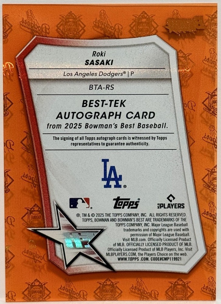 2025 Bowman’s Best Roki Sasaki Best Tek Auto /25 🔥 Ultra Rare Acetate On-Card Autograph Elite-level chase card featuring one of the most electric arms in baseball, Roki Sasaki, in the highly sought-after Best Tek acetate insert—paired with a clean, hard-signed autograph. • Serial Numbered /25 — true low-pop scarcity • Best Tek Acetate Insert — premium transparent stock with standout visual appeal • On-Card Autograph — no sticker, authentic Topps-certified ink • Top Rookie Talent — one of the key names driving 2025 Bowman’s Best  • Case Hit Level Insert — not easily pulled, high-end collector demand  This is the kind of card that checks every box: low serial + acetate + on-card auto + elite prospect = long-term upside and immediate desirability.