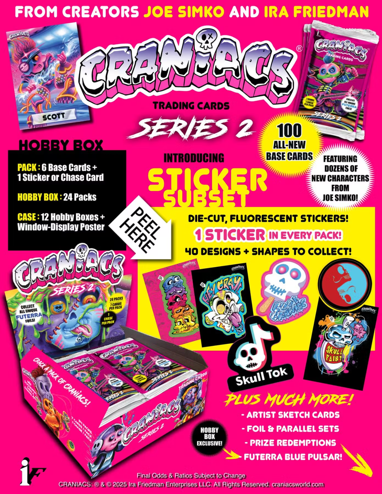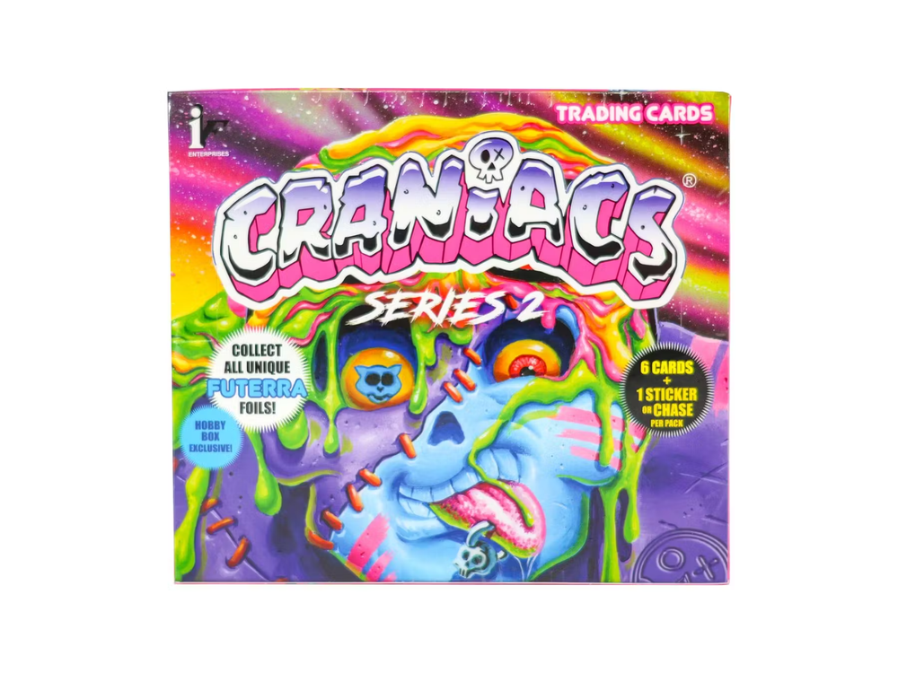 2025 Craniacs Series 2 Trading Cards Factory Sealed Hobby Box Introducing Craniacs Series 2, f rom creators Joe Simko and Ira Friedman! Craniacs trading cards are the foundation of all-new universe bursting with unique characters, wildly imaginative settings and compelling stories! Collect all unique Futerra foils! Collect Foil and Parallel Sets! Search for Prize Redemptions! Hobby Box Exclusive Futerra Blue Pulsar! Product Breakdown: 24 Packs per Box, 7 Cards per Pack 1 Sticker or Chase Card per Pack Look for Artist Sketch Cards Prism Parallels" Sequentially Numbered Gold-Stamped Set (25 Designs, 1:28 Packs) Blue Pulsar Futerrra Foil Cards (25 Designs, 1:28 Packs) Pure Pulsar Futerra Foil Cards (25 Designs, 1:14 Packs) Clear Crystal Retrovia Foil Cards (25 Designs, 1:14 Packs)