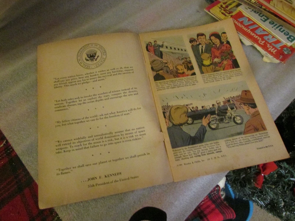 I am not a professional seller. I just have been collecting various items for the past 60 years. It is time for someone else to appreciate what I have collected. Nov. 22, 1963! I remember it well. This purchase presents an opportunity for those old enough to also remember it well. It also gives a historical opportunity to those born in the 1960’s or after to learn more about our youngest President. The record is 45 RPM. It contains the President’s voice at his nomination, inaugural address and the oath of office. The comic book (I do not like calling it that but, that is what it is) explores the life of John F. Kennedy. His family, his growing up, his war days, his days as President, and finally…..the end. The book was published in 1964 by Worden & Childs, Inc. of NYC. The record Golden Record by A.A. Records, Inc. The condition of both: Very Good A word about pricing. Yes, I research each item to see what the going market price is. I then attempt to make my offering price 33% to 50% less then the going market price. On some of my items I do get closer to the going market price but that is only for very special items. An opportunity to add to your collection or start a collection at a reasonable price. USPS prices have increased but I will attempt to ship via the best pricing possible. I choose between first class mail (if item is flat and can fit into a standard envelope), Ground Advantage (if item requires boxing - price starts at $5.40 then is added to depending on weight and size and where it is being shipped to.), or Media Mail (if permissible). But even now that price starts at $4.63. UPDATE: USPS INCREASES PRICING FOR GROUND ADVANTAGE FOR THE HOLIDAYS! FROM WHAT I SEE IT SHOULD ONLY AFFECT MY SHIPPING BY ABOUT $0.50 A SMALL PACKAGE. Purchase more than one of my items and if they are shipped in the same package and same address I will adjust the shipping cost where possible. All depends on what the USPS is charging now. Thank you for viewing this item.