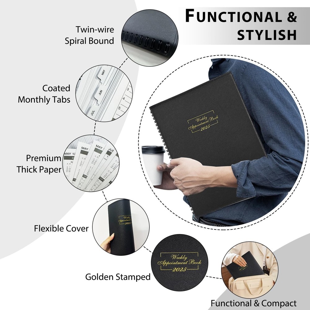 The 2025 Weekly Appointment Book is an 8.5" x 11" planner designed for optimal organization and productivity from January to December 2025. The 2025 planner features a soft cover and includes monthly, weekly, daily, and hourly planning with 15-minute increments, ideal for school, office, and work schedules. Keep Your Day On Track & Boost Your Productivity - Start planning ahead with this 2025 daily planner, featuring 12-month from January 2025 - December 2025, the comprehensive 2025 hourly, daily, weekly, monthly and yearly planner, allowing you to jot down detailed appointments, important things and other notes - all in one place, keeps yourself organized well for the whole year and increase productivity, perfect for school office work daily planning. Versatile Usage & Stay On Top Of Schedule- Sized at 8.5×11", each month displays across two full pages, offers ample space for academic daily affairs, work deadlines, and household task. This 2025 appointment book also features one week per two page spread. Schedule your day from 7:00 a.m. - 8:30 p.m. in 15-minute intervals from Monday to Sunday to set yourself up for purposeful days. Stay focused & manage your time efficiently! Elegant Design & Perfect For All Lifestyles- Enjoy a thicker planner appointment book with a soft leather cover and premium high-quality paper, a quick glance provides with a professional and structured approach to time management and personal growth. Ideal for college students, teachers, professionals and homemakers. A perfect school/work planner for setting your targets, managing daily assignments, cultivating healthy life habits and optimizing success. PERFECT ORGANIZATION - The 2025 hourly appointment planner measures 8.5×11", thicker than other 2025 daily appointment book on Amazon, with a soft faux leather cover. There are 1 page of future planning | 1 page of yearly overview for 2024-2026 | 1 page of major holidays of 2024-2026 | 1 page for quick reference information | 8 lined pages for some notes, ideas, meetings and appointments. Now Is The Best Time To Prepare Your 2025 - Open your fabulous 2025 with this daily planner! Our Appointment Book 2025 helps everyone keep on top of the long-term goals and detailed assignments in studies and works, making it an purposeful present that fosters organization and personal growth for birthdays, graduations, shcool open days and festive seasons throughout the year.