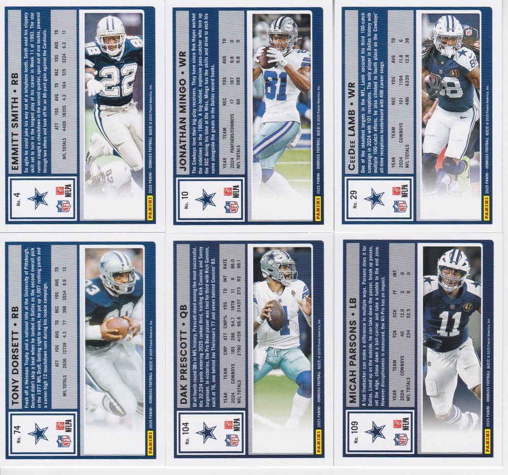 2025 Donruss Football Complete Team Set (12) Dallas Cowboys Tony Dorsett** Description: 2025 Donruss Football Complete Team set. Cards are similar to the cards in the picture. **These cards are from 2025 Donruss Factory sets. We opened up 8 sets and there were some cards with very light vertical printing lines on the front. Not noticable in the scans or if you have them displayed in a binder or if you just look at the card straight on, but you can see them if the light hits the card at the right angle. Cards that usually have this defect are ** below. Includes the following: #4 Emmitt Smith #10 Jonathan Mingo #29 Cee Dee Lamb #74 Tony Dorsett #104 Dak Prescott #109 Micah Parsons #175 Demarvion Overshown #204 Jake Ferguson #253 Osa Odighizuwa #265 Javonte Williams #308 Jaydon Blue RC** #354 Tyler Booker RC** Shipping: Calculated Shipping to U.S. - mailed in a plain white envelope. Shipping Discounts: Will discount shipping on multiple items won - $.25 additional for each card won. Please contact us on reduced shipping on sets and lots won. We only sell quality cards so please don't worry about bidding on a poor product. If there is something wrong with a card we will let you know. We stand behind the cards we sell and will refund your money if you are unhappy with any product. Please don't hesitate to contact us if you have any questions. Please see our other listings of Football Cards. _gsrx_vers_1730 (GS 9.9.4 (1730))