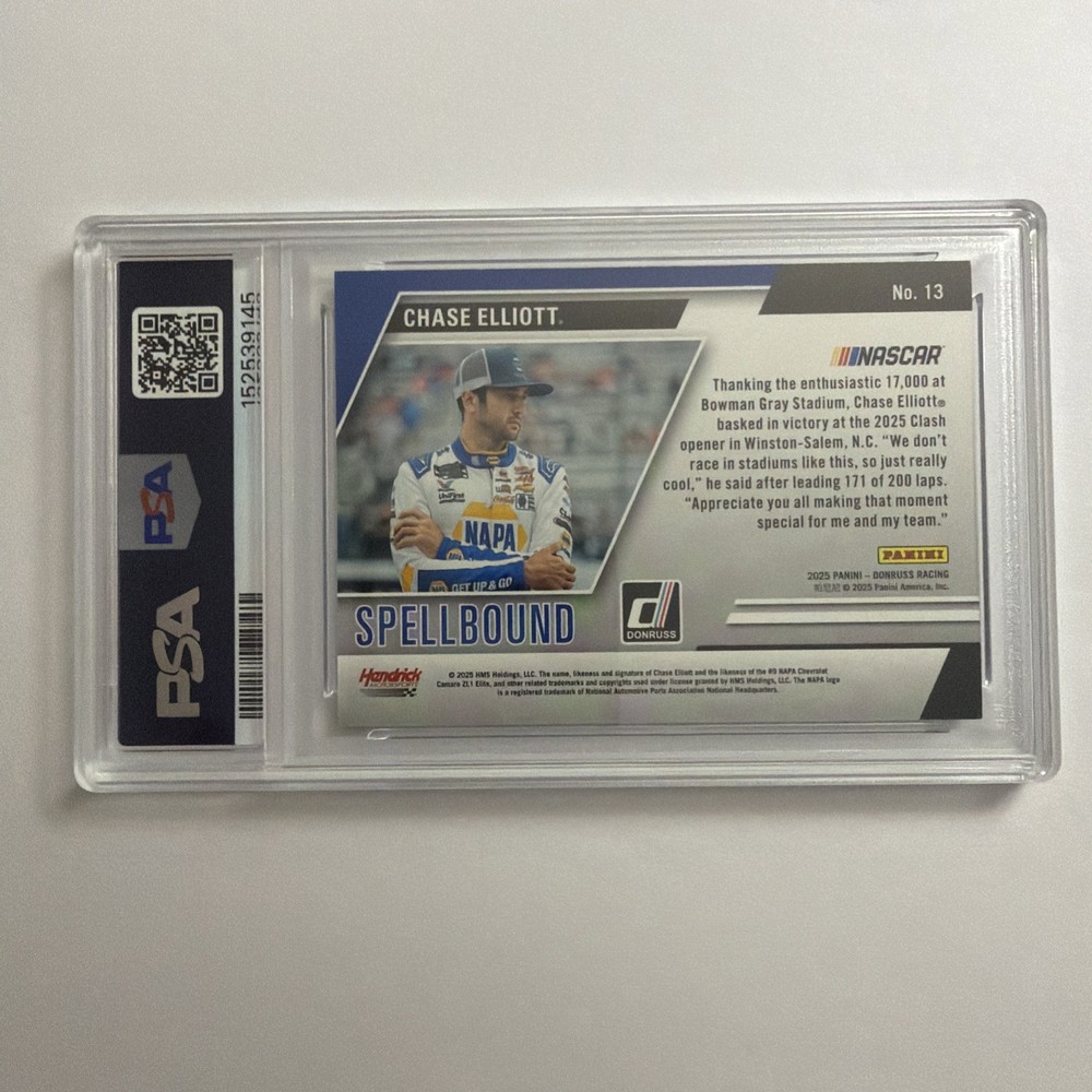 The product is a 2025 Panini Donruss Nascar trading card featuring Chase Elliott from the Spellbound insert set. This card is numbered #13 out of a print run of 49 and is autographed by Elliott. The card is made of standard card stock with a thickness of 35 Pt. It is an original licensed reprint manufactured by Panini in the United States. The card is serial numbered, a parallel/variety, and an insert, making it a valuable collectible for fans of auto racing and Elliott.